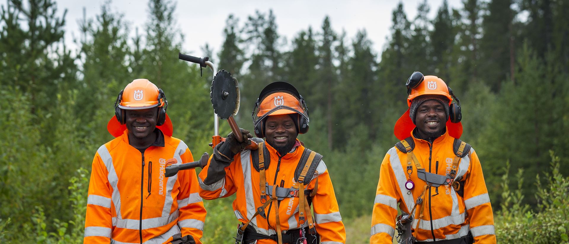 De tre männen ursprungligen från Kamerun, nu boende i Piteå, utgör Sveaskogs nyaste röjlag och har hållit igång sen i maj under ledning av Staffan. De har tidigare arbetat med plantering hos en entreprenör men inför den här sommaren värvades de till Sveaskog som beslutade starta igång ett röjlag med männen.