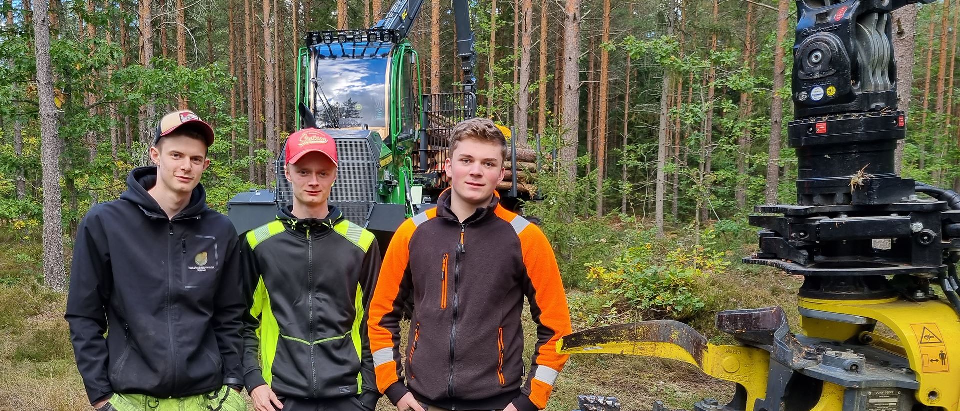 På Sveaskogs fastighet Ebbegärde utanför Kalmar rullar en helt ny skördare och en ny skotare fram i gallringsbeståndet. Melker Staflin, Malte Mathisson och Gusten Olofsson går alla sista året på skogsbruksutbildningen på Naturbruksgymnasiet i Kalmar och är här för att lära sig att hantera maskinerna.