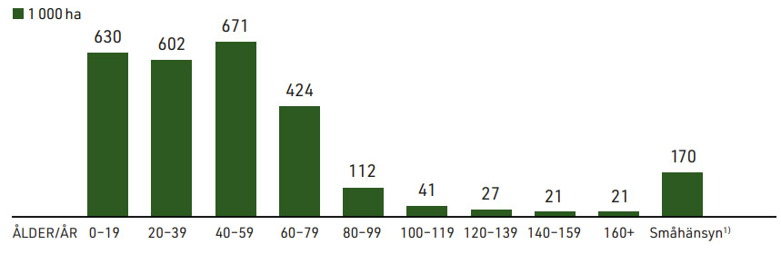 1) Denna areal ingår främst i någon av de yngre åldersklasserna men är egentligen avsatt vid avverkning och är alltså egentligen betydligt äldre.