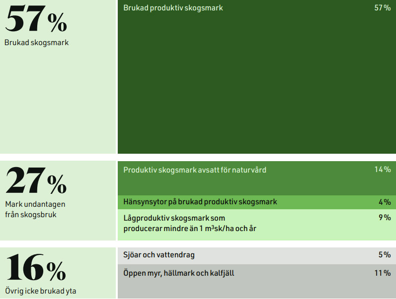 Här ges en översikt över Sveaskogs markinnehav och hur det används. Idag är totalt 26 procent av skogsmarken undantagen från skogsbruk. På dessa marker kan det utföras naturvårdande skötsel. Ytterligare 16 procent består av mark som inte brukas, exempelvis öppen myr, hällmark och kalfjäll.