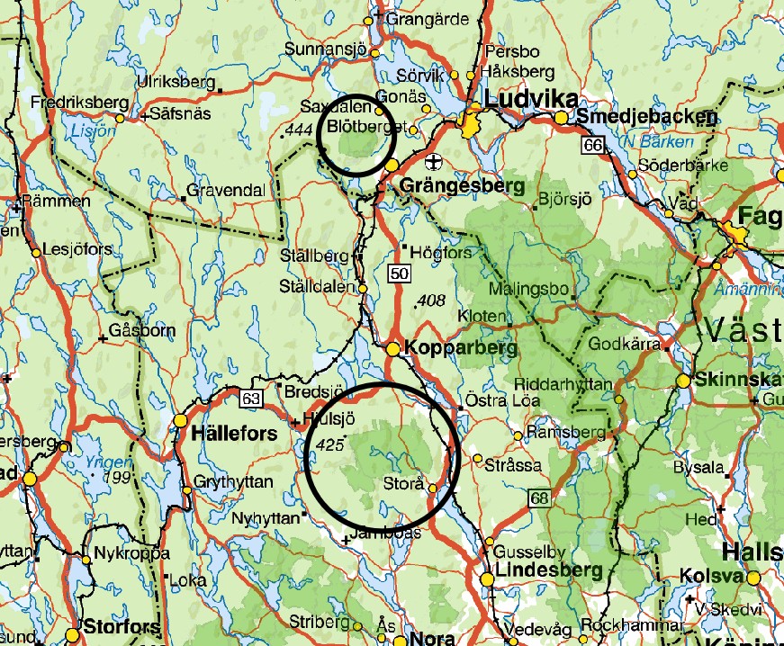 Planteringsuppdraget ska utföras inom de inringade områdena på kartan. Antal plantor: cirka 500 000 st.