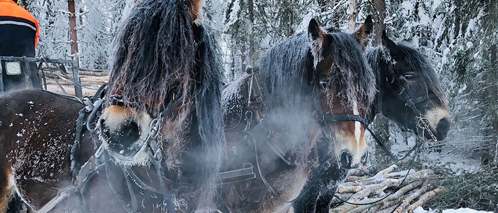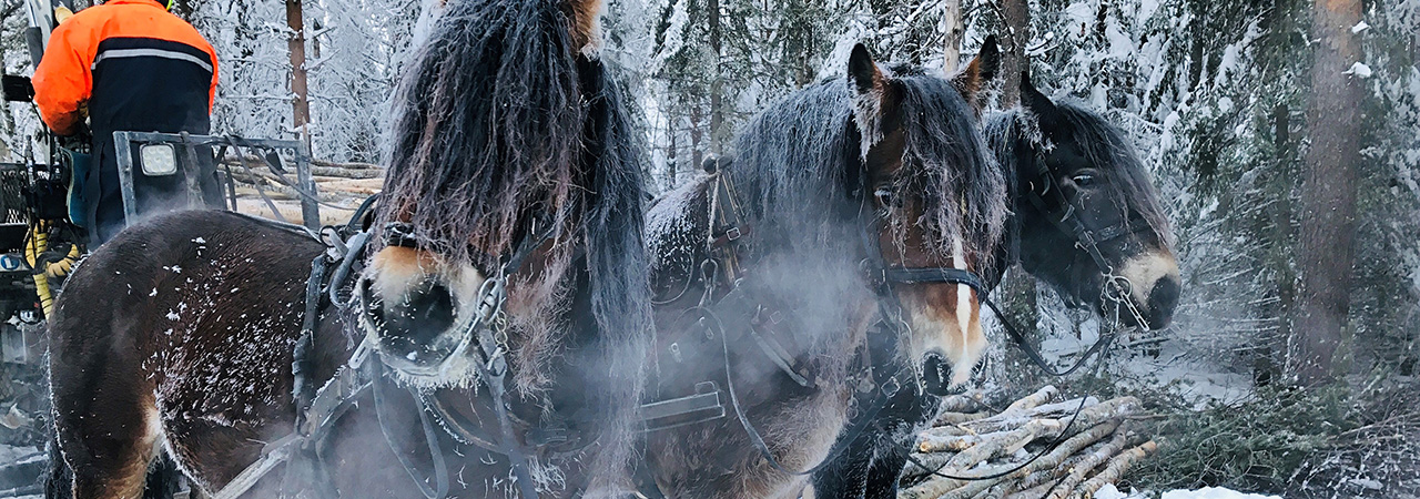 Termometern visar minus 23 grader när vi svänger in på skogsvägen, vid Svensbyn, ett par mil utanför Piteå, Vi drar ner mössorna, stiger ur den varma bilen och möter den krispiga kylan. I en skogsdunge bland snötyngda tallar står de nordsvenska hästarna Palt, Dante och William. De har precis tagit rast efter förmiddagens arbete i skogen. Ångan stiger från deras kroppar när kylan möter deras värme.