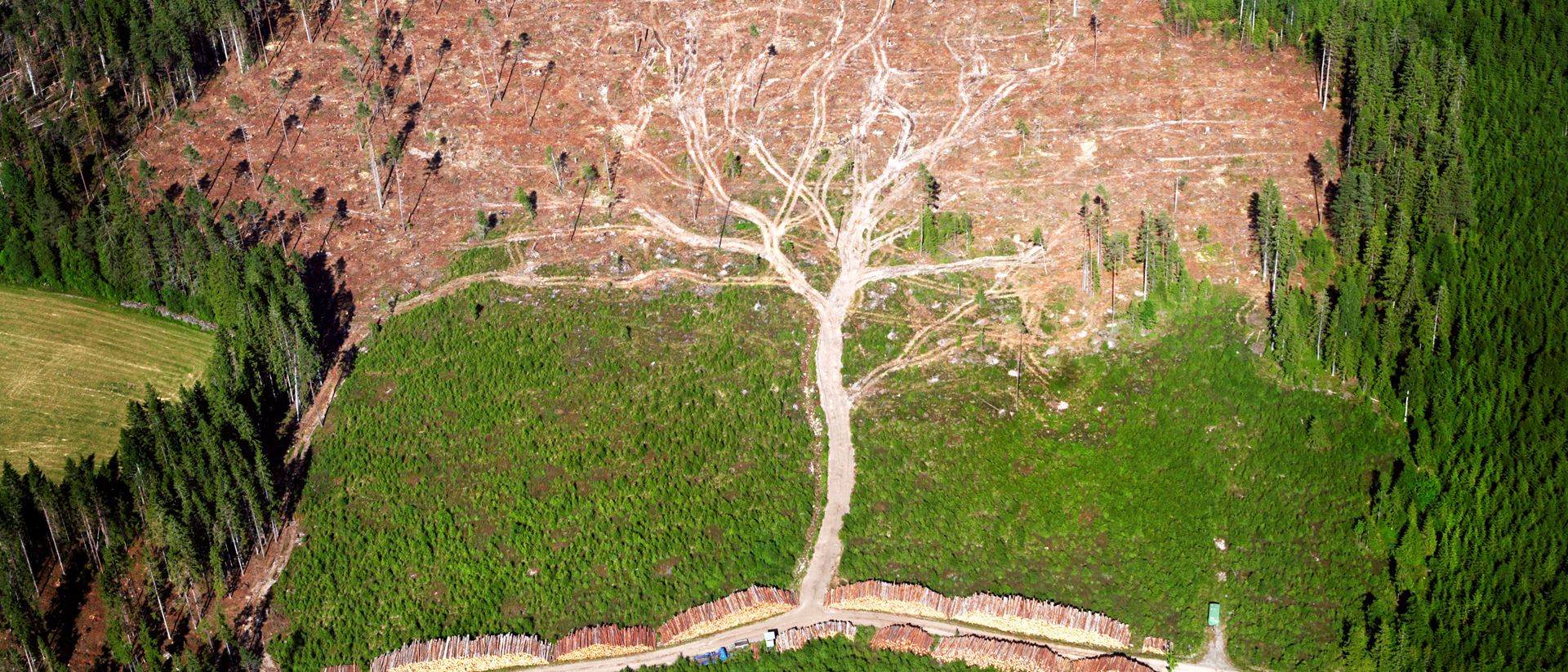 Vy över skogen omkring Stockaryd, juli 2005. Uppröjningen efter stormarbetet har resulterat i ett visuellt träd format i landskapet. Fotot blev också Årets bild 2006. Foto: Joakim Berglund / Expressen