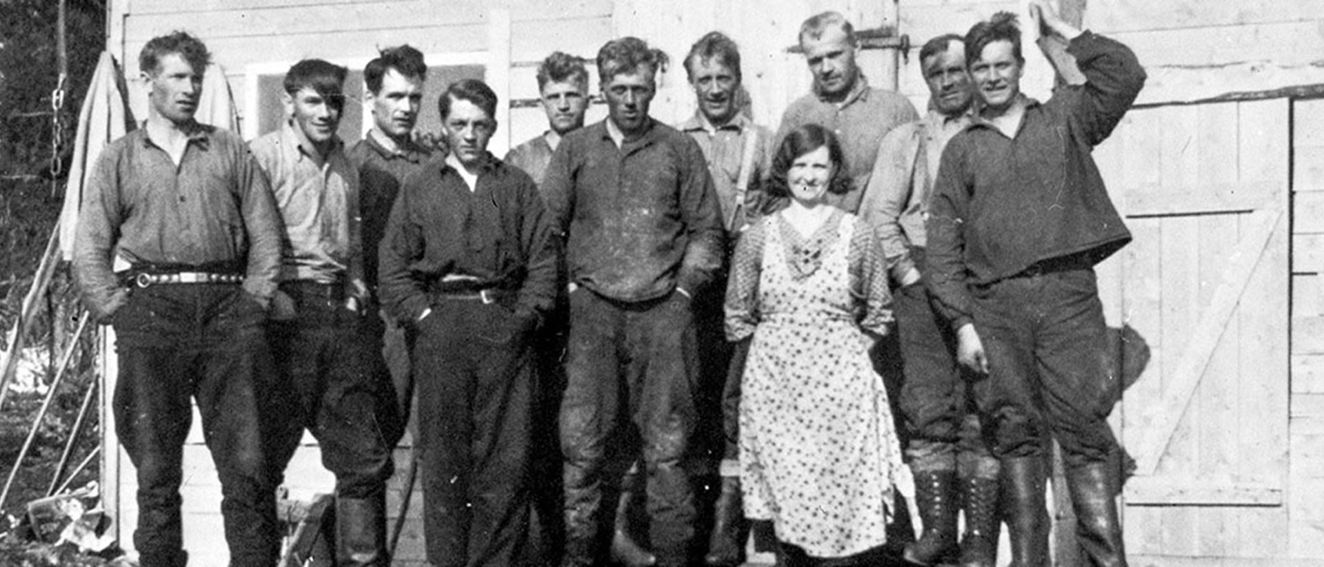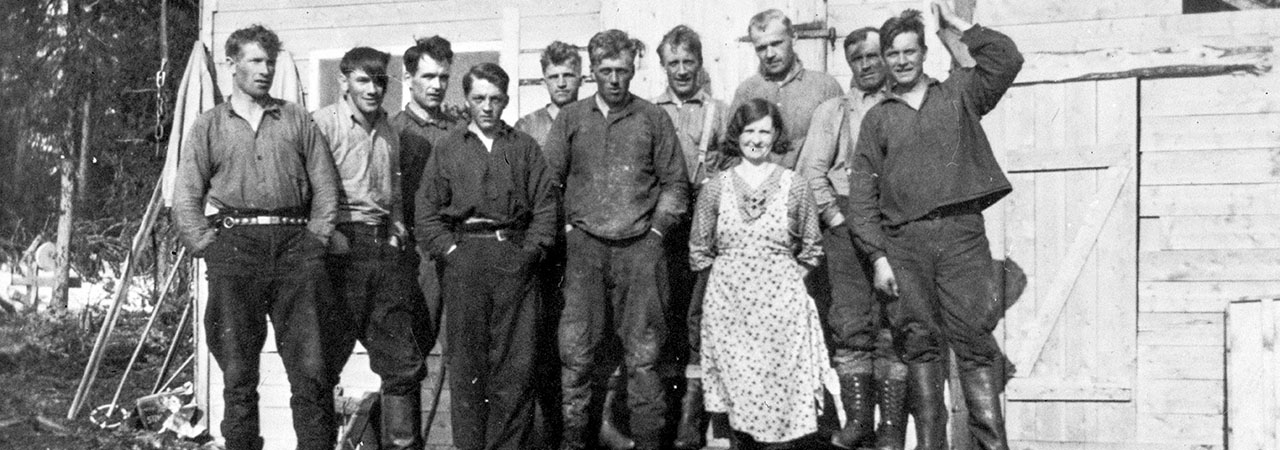 Kocklag i Umasjöberget, i skogarna mellan Hällnäs och Ekträsk, år 1937. Kockan Hilma Johansson (1905–1985) hade både sin man i kocklaget och sonen Rolf, som då var tre år. I anslutning till kojan och avverkningen fanns också en såg, där vissa av männen arbetade, bland annat Hilmas man, försågaren Sixten Johansson. Foto: Okänd fotograf/Västerbottens museum.