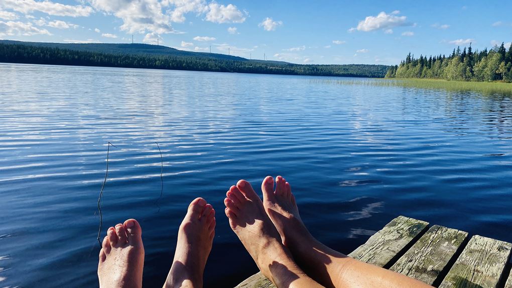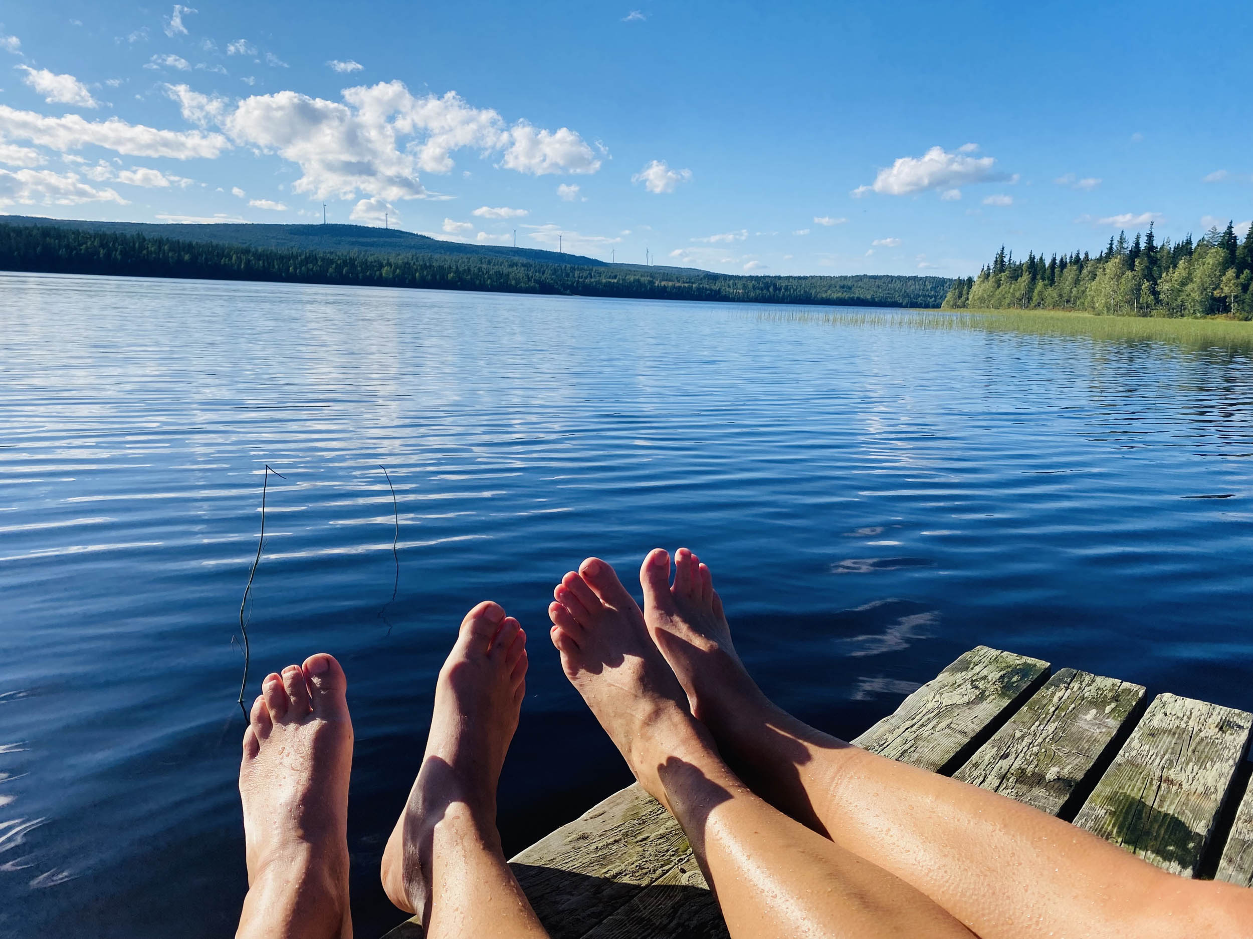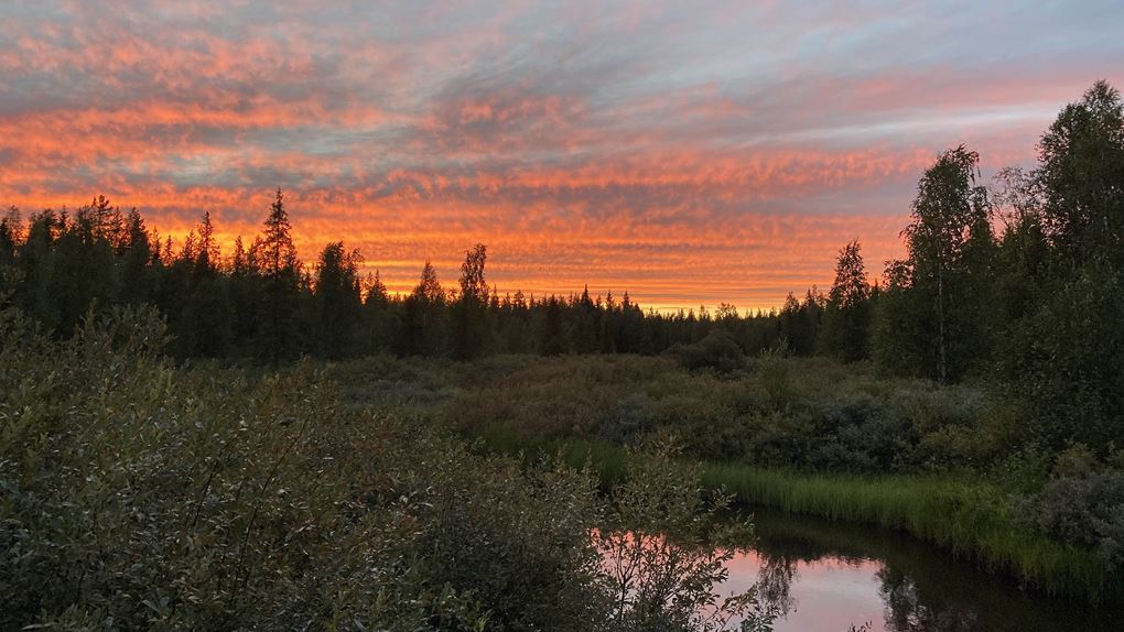 Vi vaknade tidigt och eftersom vi frös lite bestämde vi oss för att inta dagens frukostplanka på marken. Det var skönt att komma ner och värma upp sig innan vi gick tillbaka mot infotavlan. Nu tog vi bilen mot den södra delen i hopp om att hitta fina myrar. Vi hade dock svårt att hitta någon bra väg att gå här så efter att ha plockat både blåbär och hjortron bestämde vi oss i stället för att vi var värda ett dopp i sjön Syväjärvi på väg tillbaka till Norrskenskojan.
