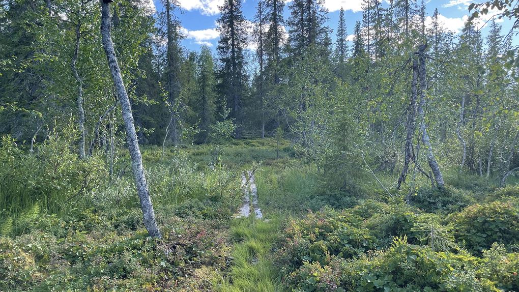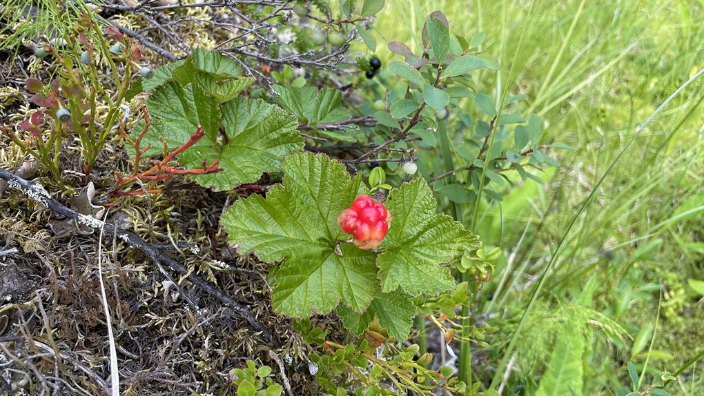 Sträckan mellan Maanalainen och Ventikkövaara var nog dagens jobbigaste passage, stigen blockerades av hundratals fallna träd. Ibland fick vi gå ut på myrkanten och ibland var det svårt att följa stigen då träden med markeringen har också fallit omkull. Men det växte hjortron längs myrkanten, så lyxigt och gott! Härifrån kunde vi även se vår valda tältplats på andra sidan myren, en skön känsla att veta att snart får vi vila då vandringen tog på kraften.