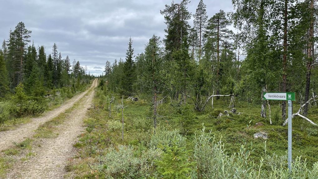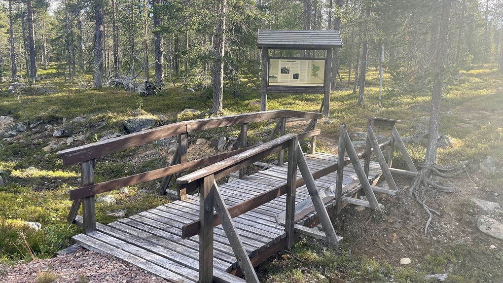På förmiddagen packade vi bilen och begav oss mot Naakajärvi. Vi körde längs gränsälven Muonio och närmade oss parken från Kihlangi-hållet, på en grusväg som går mellan Kihlangi och Naakajärvi, där vår resa till fots skulle börja. Här hade vi aldrig varit tidigare, och efter att ha studerat ekoparkskartan såg vi verkligen fram emot att se alla sevärdheter. Vi valde att börja mot ekoparksbänken och ta den längsta leden därifrån. Stigen var väl utmärkt så det gick lätt att hitta hela vägen.