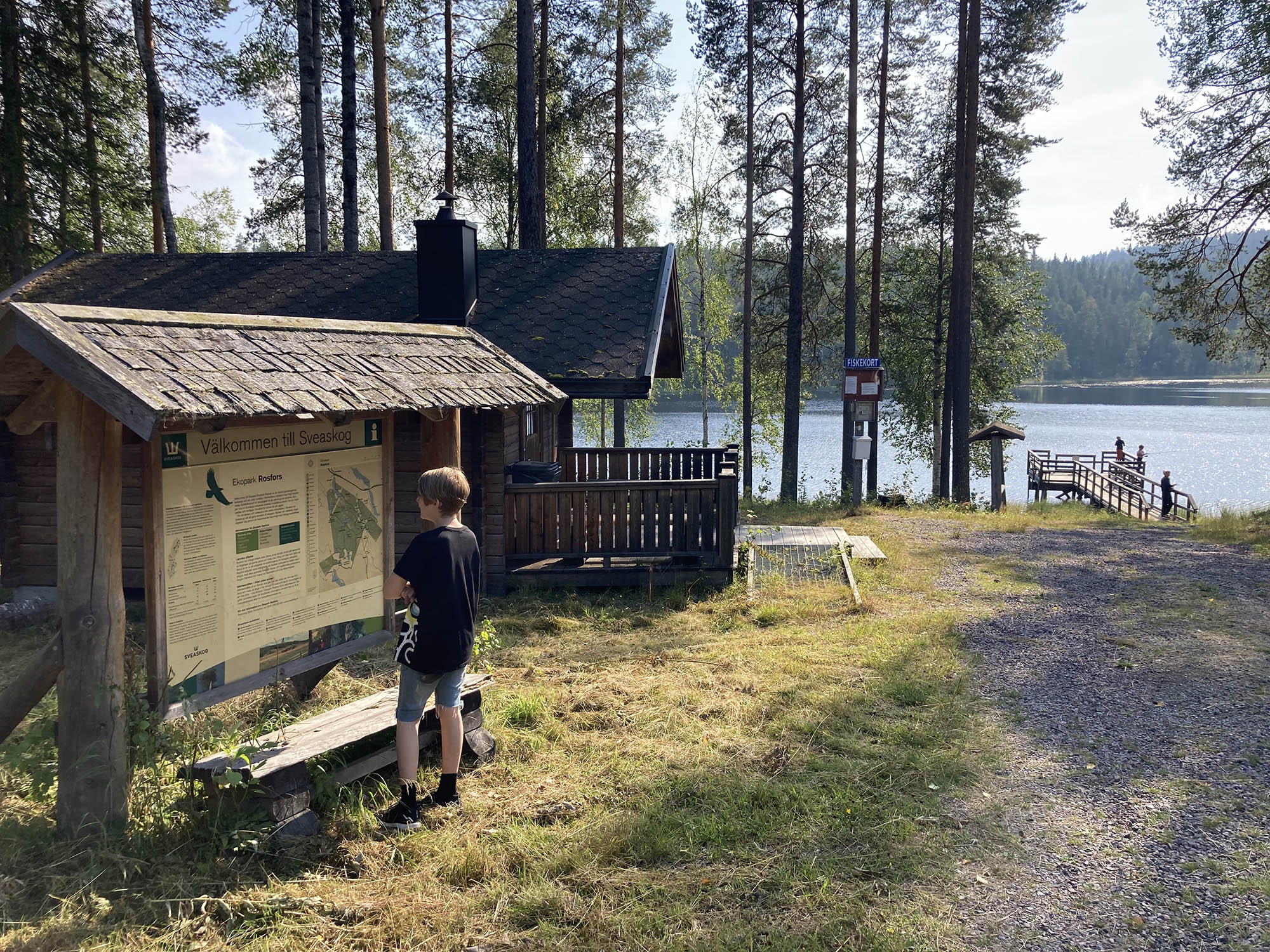 Vi lämnar våra cyklar och sovpackning vid etappmål Krokvattnet och åker sedan till vår start vid Lill-Brännträsket. Det visar sig vara en fin och välordnad plats med stuga, vindskydd och bryggor.