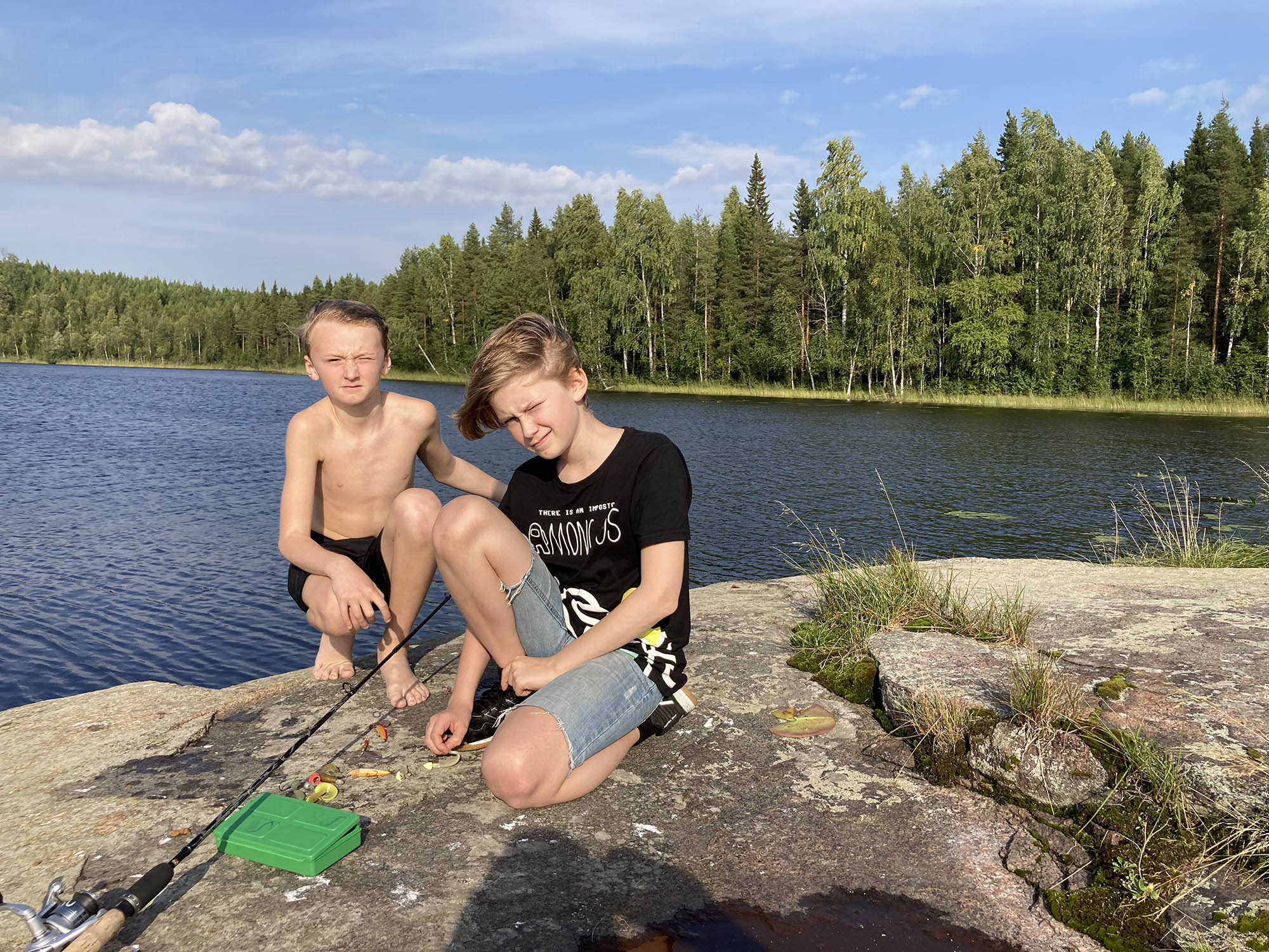 Grabbarna löser fiskekort och testar fiskelyckan, dessvärre utan framgång. Mamma Emma ger sig iväg på kvällspromenad med äventyrets första bad i Mjöträsket som visar sig bli ett gyttjebad! Natten tillbringas i husbil – vi vet att det är lite fusk, men det säkerställer god nattsömn och bra uppladdning inför morgondagen för alla.