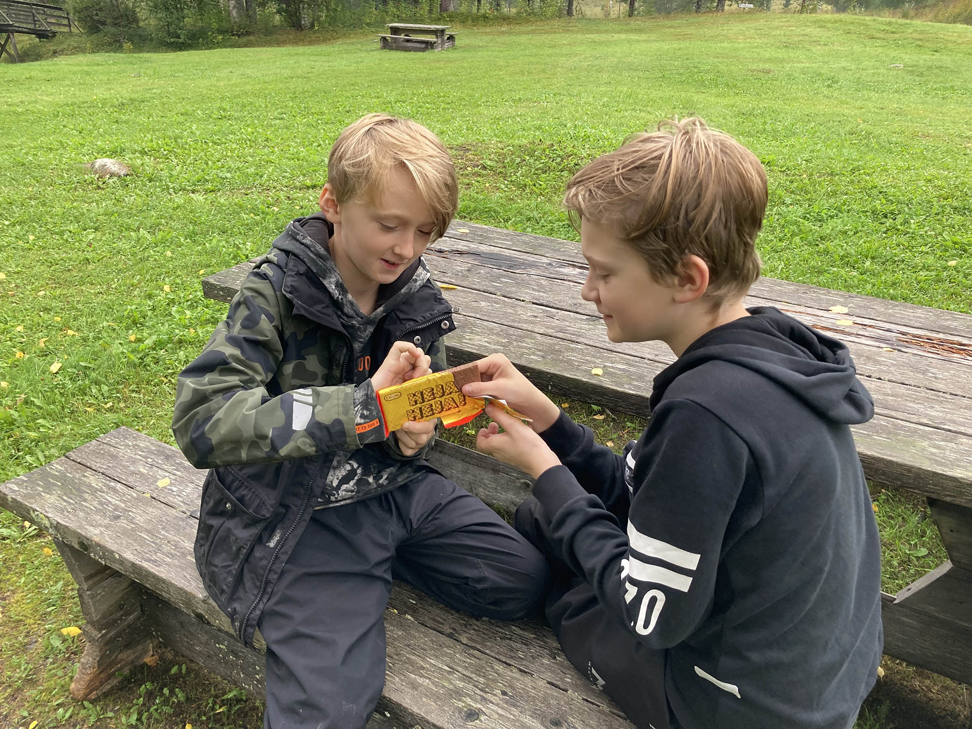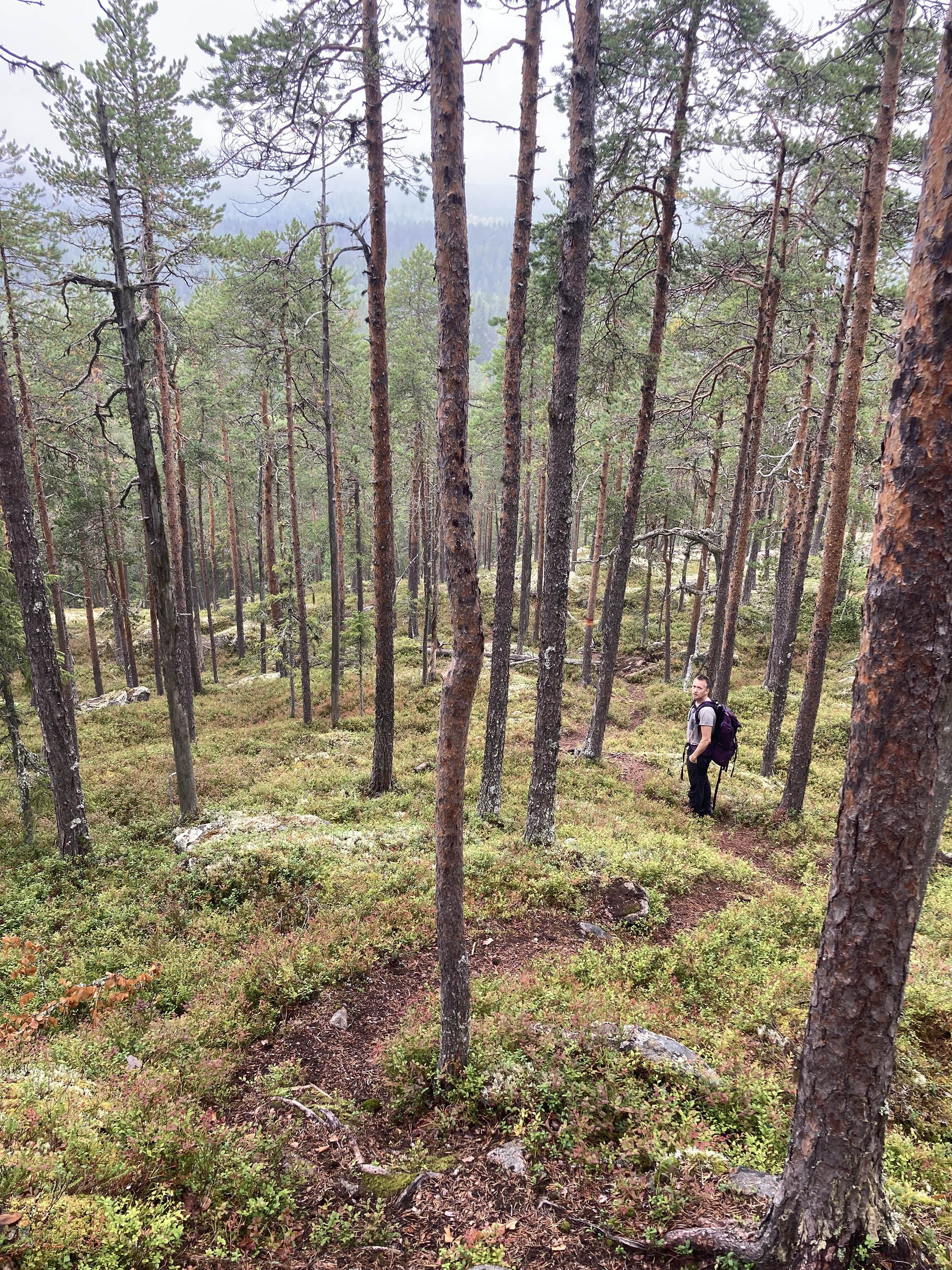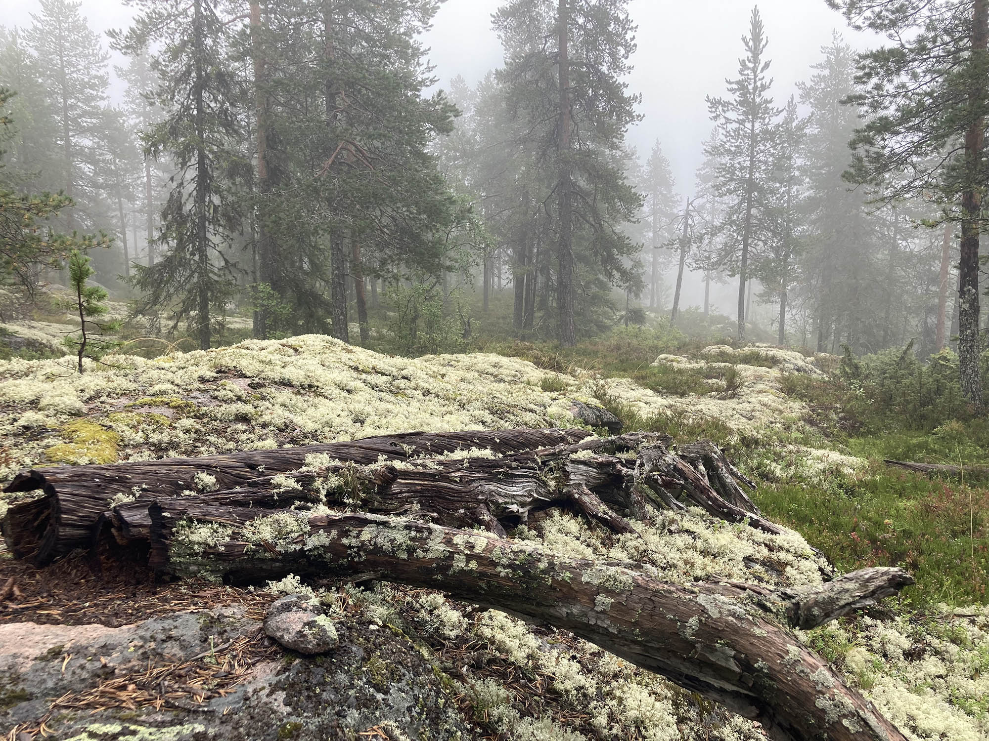 Vi knatar vidare längs leden på upp till Bergtjärnsflygget där ekoparksstenarna finns utplacerade. Tyvärr hänger sig dimman kvar, även om det ibland lättar och den vackra utsikten kan skymtas genom dimslöjorna. Vi åter lunch och barnen börjar, efter en förmiddag utan skärm, hitta tillbaka till fantasin och leken.