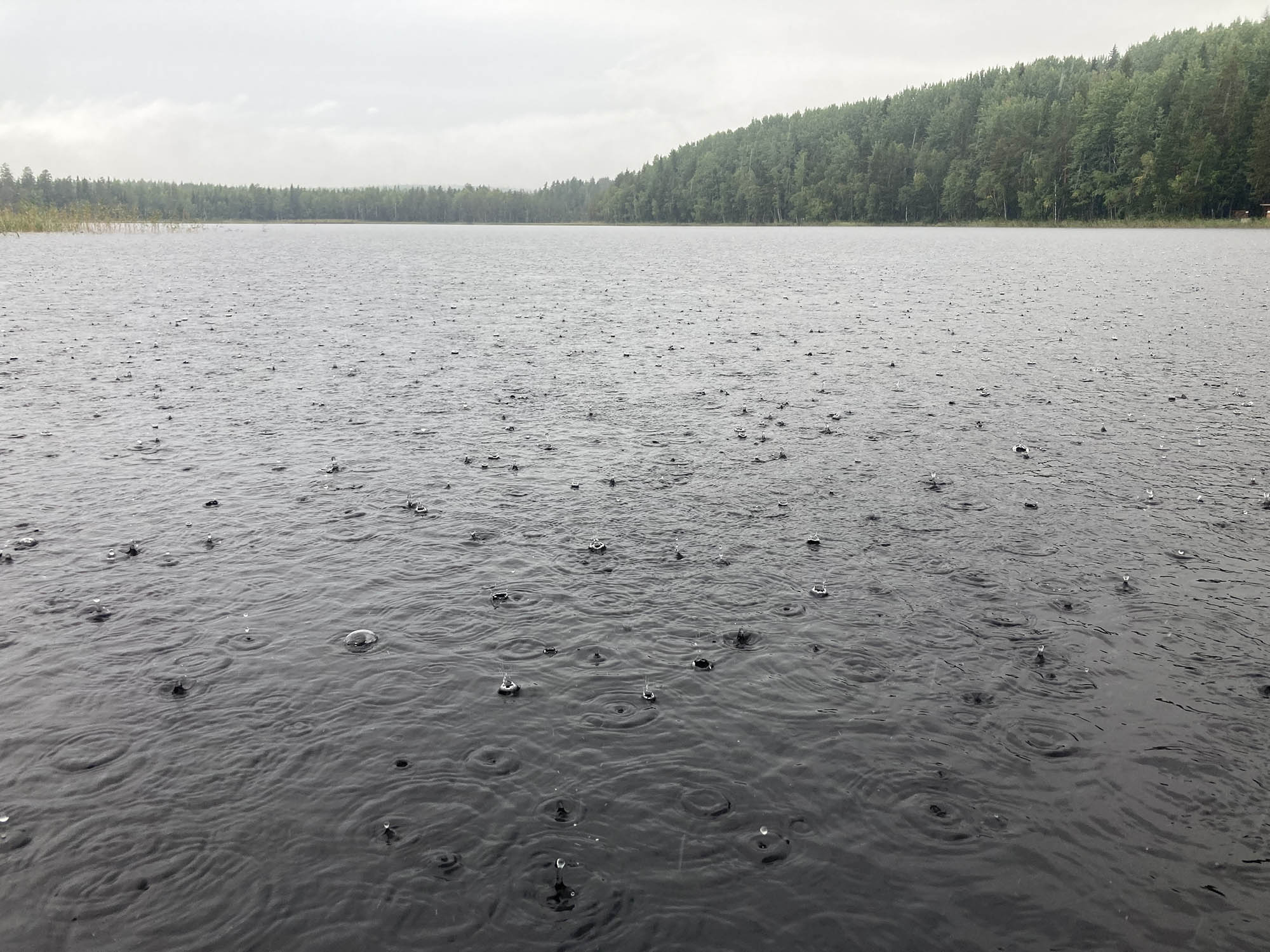 Vi vaknar till dimma och regn i luften, men det är riktigt varmt. Laddar med ett skönt morgondopp från bryggan, lite fiske och rejäl frukost innan avfärd. Precis när vi ska börja vandra kommer dock regnet och vi drar på oss alla regnkläder och börjar gå. Det blir en svettig stigning längs Solanderleden upp till Södra Abbortjärnsberget.