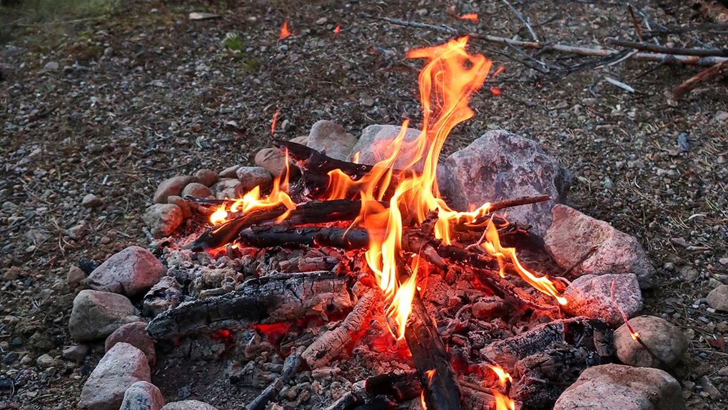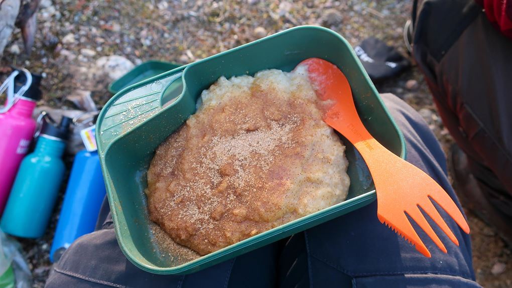 Glenn och Joel hade byggt en lägerplats av några plankor som de hittat och gjort upp en eld. Det var skönt att få sätta sig ner och pausa medan elden höll knotten på avstånd. Klockan närmade sig 18.00 och det började vara middagstid. Barnen samlade torra pinnar till elden och vi vuxna tog itu med matlagningen, plockade fram gasköken och kokade vatten till våra portioner med frystorkad spagetti bolognese.