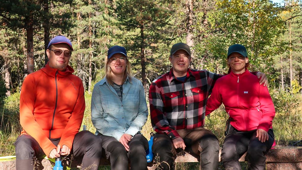 Vi enas om att det här är en bra plats att avsluta vårt äventyr i Vuollerims ekopark och försöker ta en gruppbild med hjälp av kamerans tidsfunktion. Det gick väl si så där då det var svårt att stå stilla så länge och barnens tålamod räcker till två tagningar. Det har överhuvudtaget varit svårt att fotografera ordentligt dessa dagar, de bilder som har tagits har liksom tagits i farten på gående fot och det har mest blivit bilder på naturen.