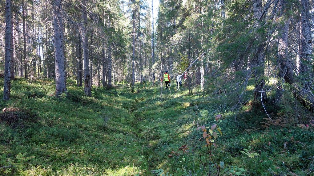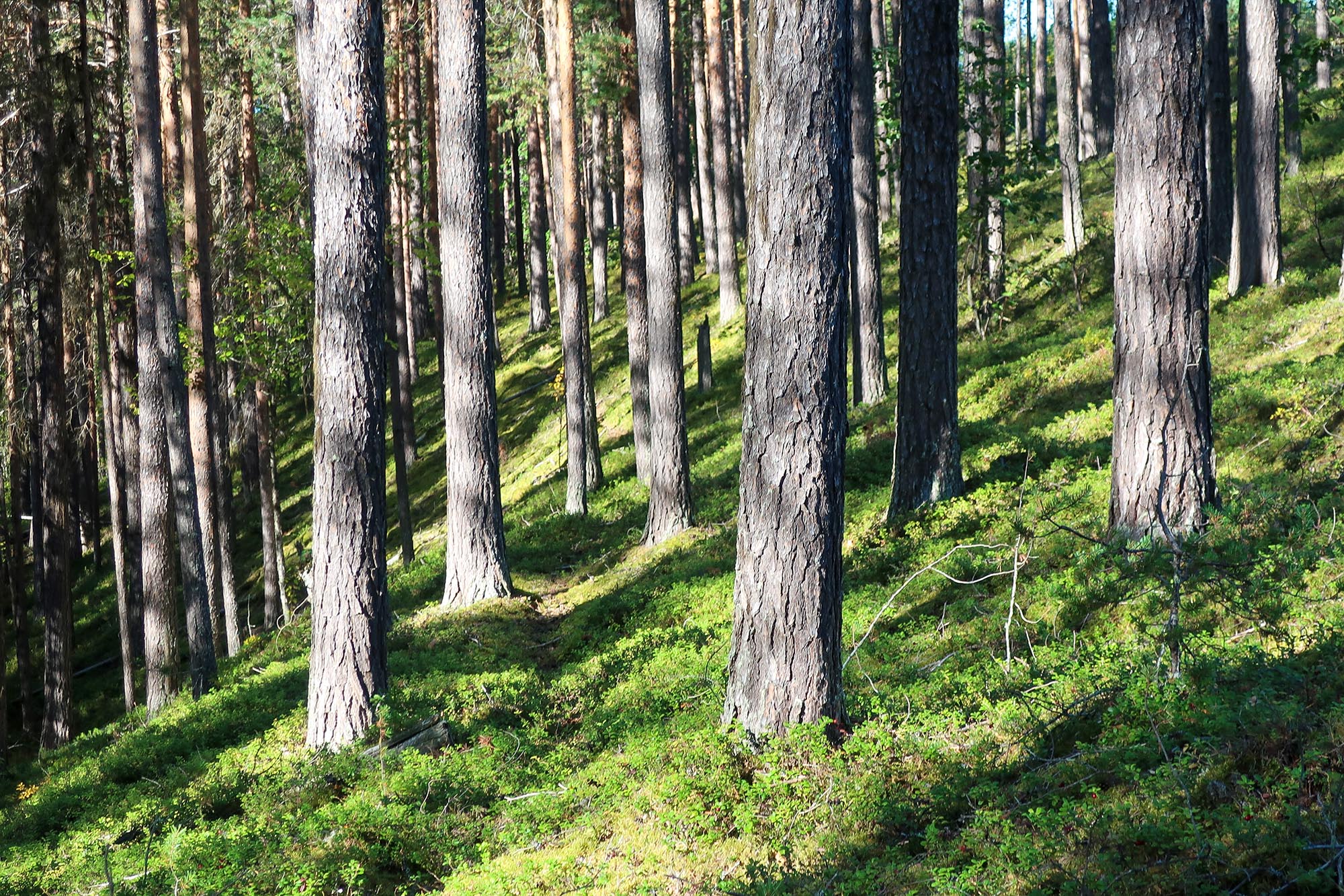 Det började närma sig lunchtid och vi behövde hitta vatten för att kunna göra lunch. Så vi ändrade vår rutt för att gå till den bäck som såg ut att ligga relativt nära. Därför gick vi inte ut mot älven som vi hade planerat ut in mot skogen i stället. Först följde vi en skogsväg och på båda sidorna kantrades den av gles gammal tallskog. Snart blev det snårigare och terrängen mer oländig och vattnet lyste med sin frånvaro.