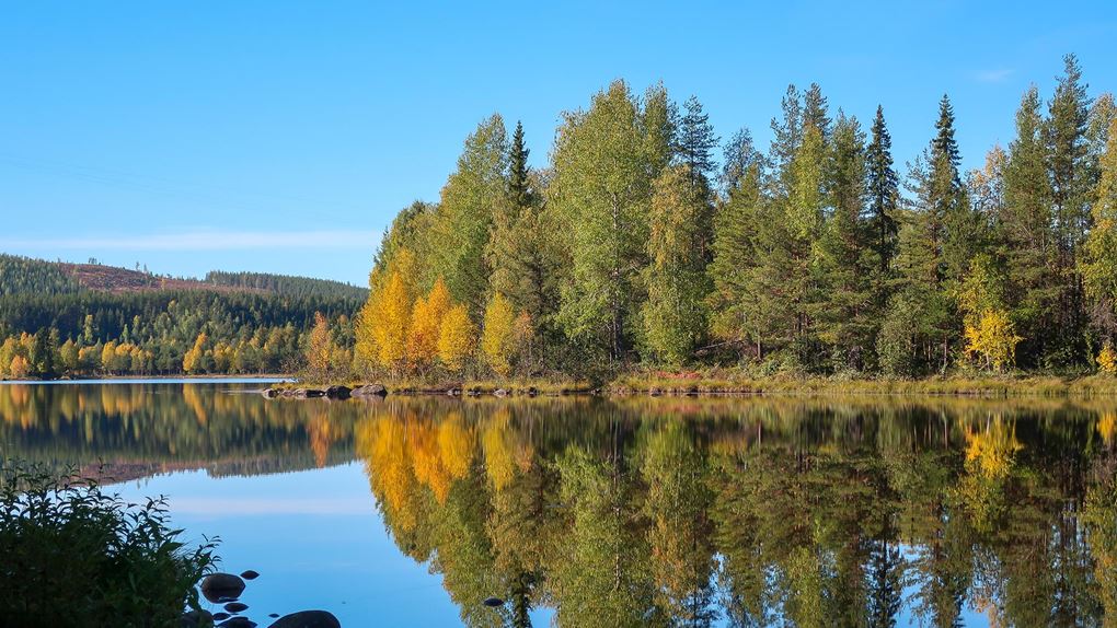 Vi känner oss klara med vårt äventyr och går tillbaka och möts av bilarna som är täckta med knott så det gäller att vara snabb och undvika att få med dem in i bilen. Solen skiner även idag och höstfärgerna har börjat komma så vi stannar till vid spegeldammen för att ta lite fler foton. Det är en vacker plats och här hade det varit roligt att ha med systemkameran och tar mera bilder men det kanske får bli en annan gång.