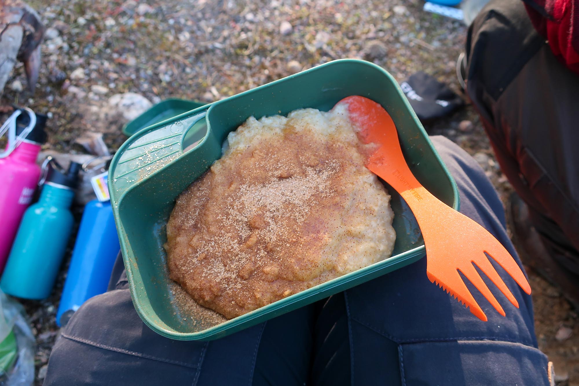 När vi steg ut ur tälten möttes vi av en skog fylld med en tät morgondimma och den omsvepte vår lilla lägerplats med en fantasieggande atmosfär. Joel och Oscar gjorde upp eld och barnen satt sig vid elden medan vi vuxna packade ihop lite i tälten innan vi gjorde frukosten. Det blev havregrynsgröt med mycket kanel och socker, te och mackor med jordnötssmör och kaffe.