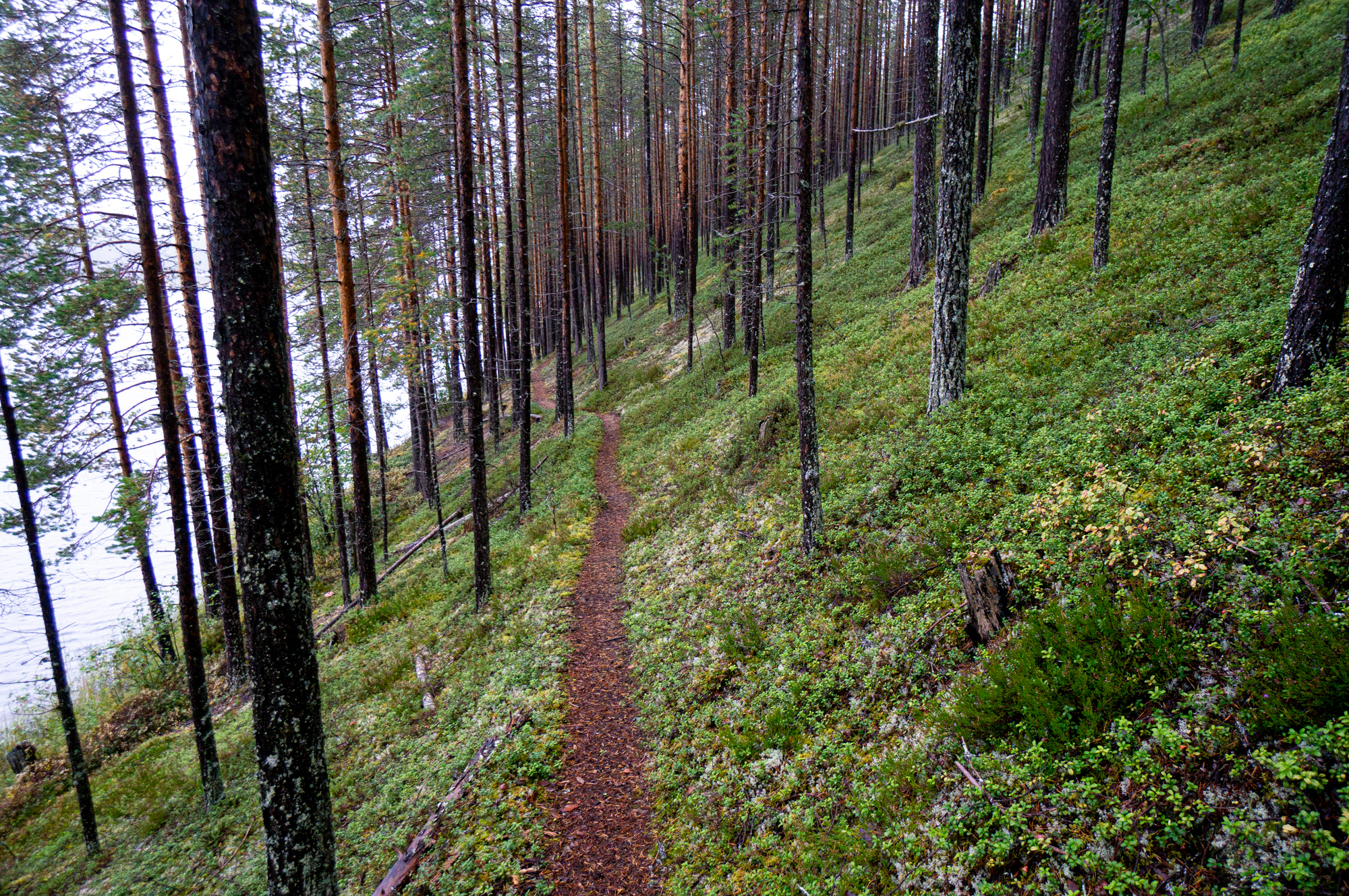 Isälvsleden snirklar sig upp och ner hela tiden i mitten på kammen. Lagom utmanande, men jag måste erkänna att jag var tvungen att leda cykeln uppför några av de brantaste partierna. Nerför var det bara att släppa på men det krävdes koncentrerad cykling då rötterna på stigen hade blivit hala av de senaste dagarnas regnande. Den känsliga terrängen innebär att det krävs kontrollerad inbromsning för att undvika stoppsladdar som kan skada stigen.