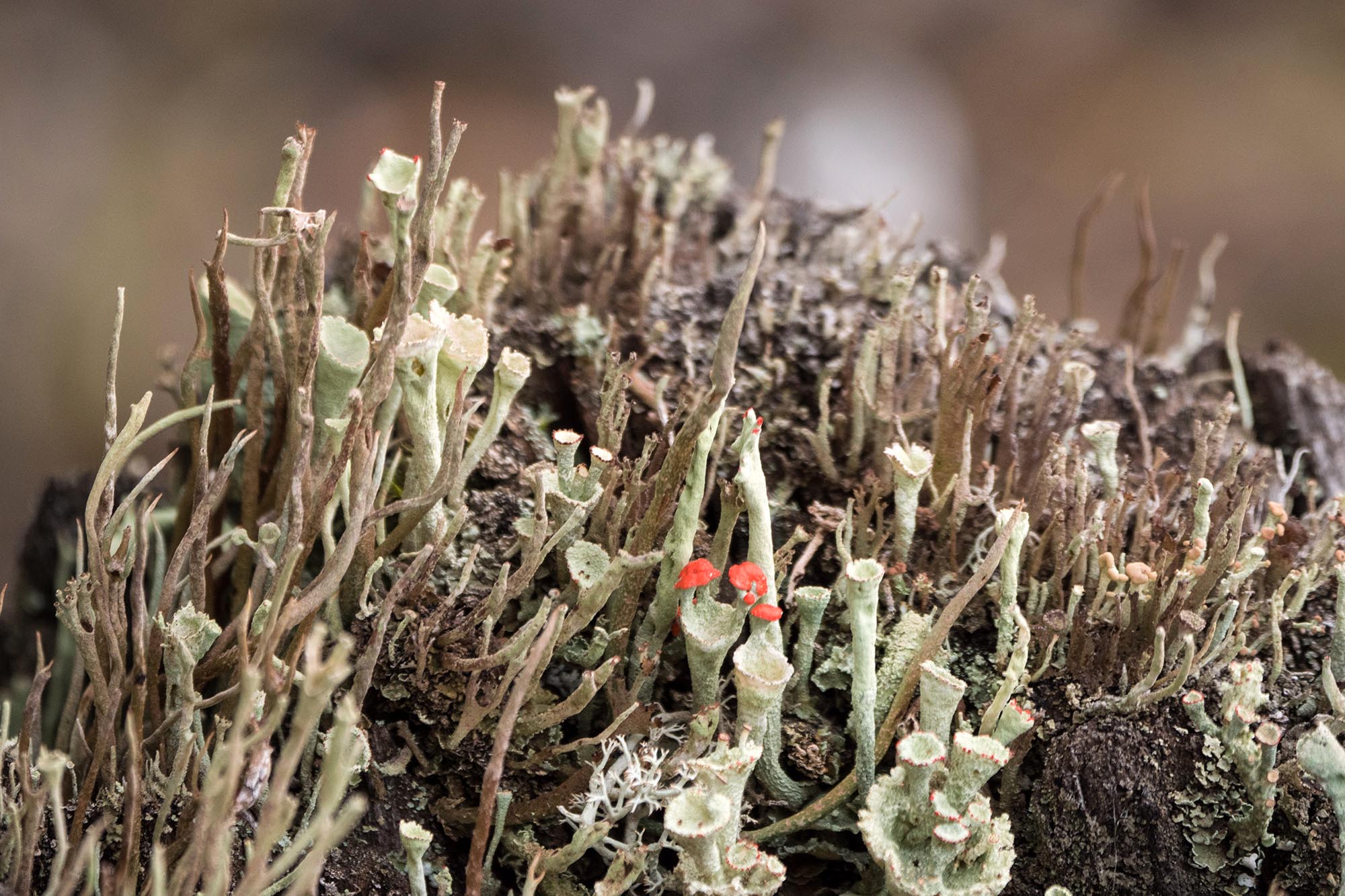 Mitt första vandringsmål är annars toppen på det lilla berget Dábmukoajvve, där det enligt kartan ska ligga en sjö som jag tror lämpar sig för en lunchpaus. Granskogen sluter sig runt mig när jag börjar klättra. Blåbärsriset skiftar i rött, och det ser ut att vara ett bra svampår. För den som behärskar fler sorter än de två kantarellvarianter som jag känner till går det nog att plocka ihop en lunch här.