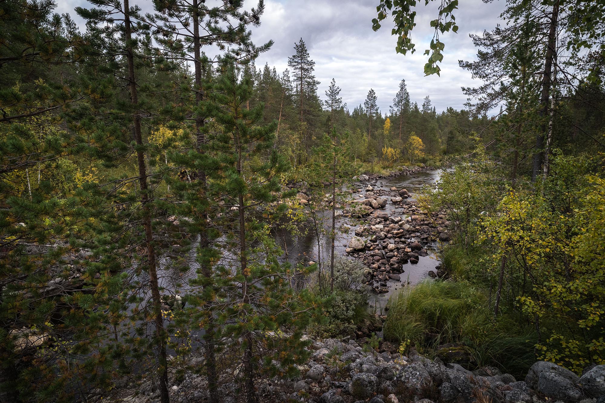 Efter lunchen tar jag ut en ny kurs och vandrar mot nordväst. Skogen glesnar lite innan det bär nedför igen, och mellan träden ser jag en milsvid utsikt. Skog och åter skog. Och några silverstrimmor här och där, bland annat sjösystemet Vuollávrre, där min plan är att paddla under morgondagen.