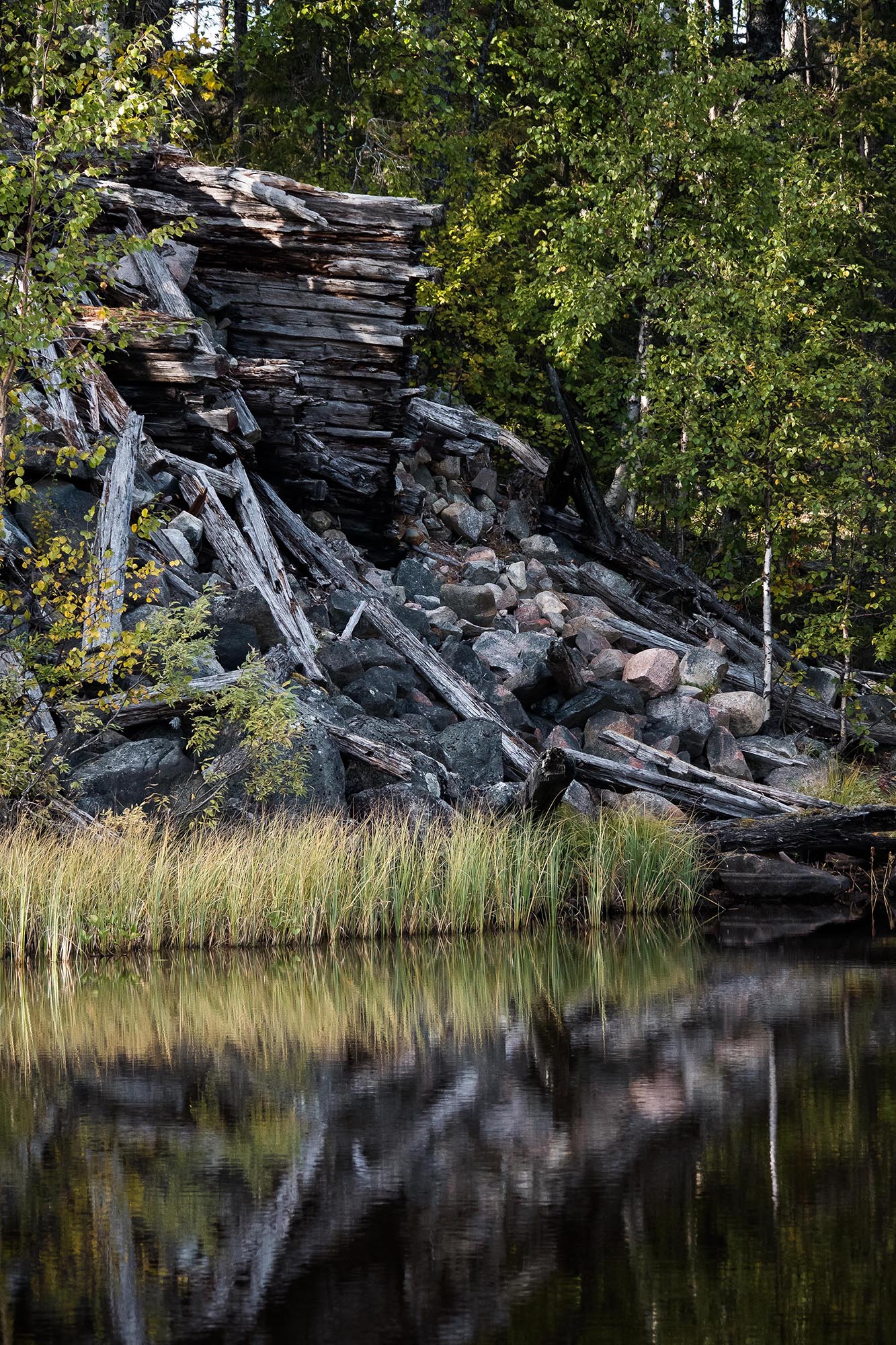 Nu finns det bara spridda spår kvar av det som måste ha varit en ganska omfattande verksamhet, att döma av dammens proportioner. Men ståtligt reser sig ändå resterna av dammen på sidorna av sjön. Här finns även lämningar efter byggnader, ståldetaljer som blivit kvar och annat spännande, som jag tar mig tid att undersöka, innan jag paddlar vidare nedströms.