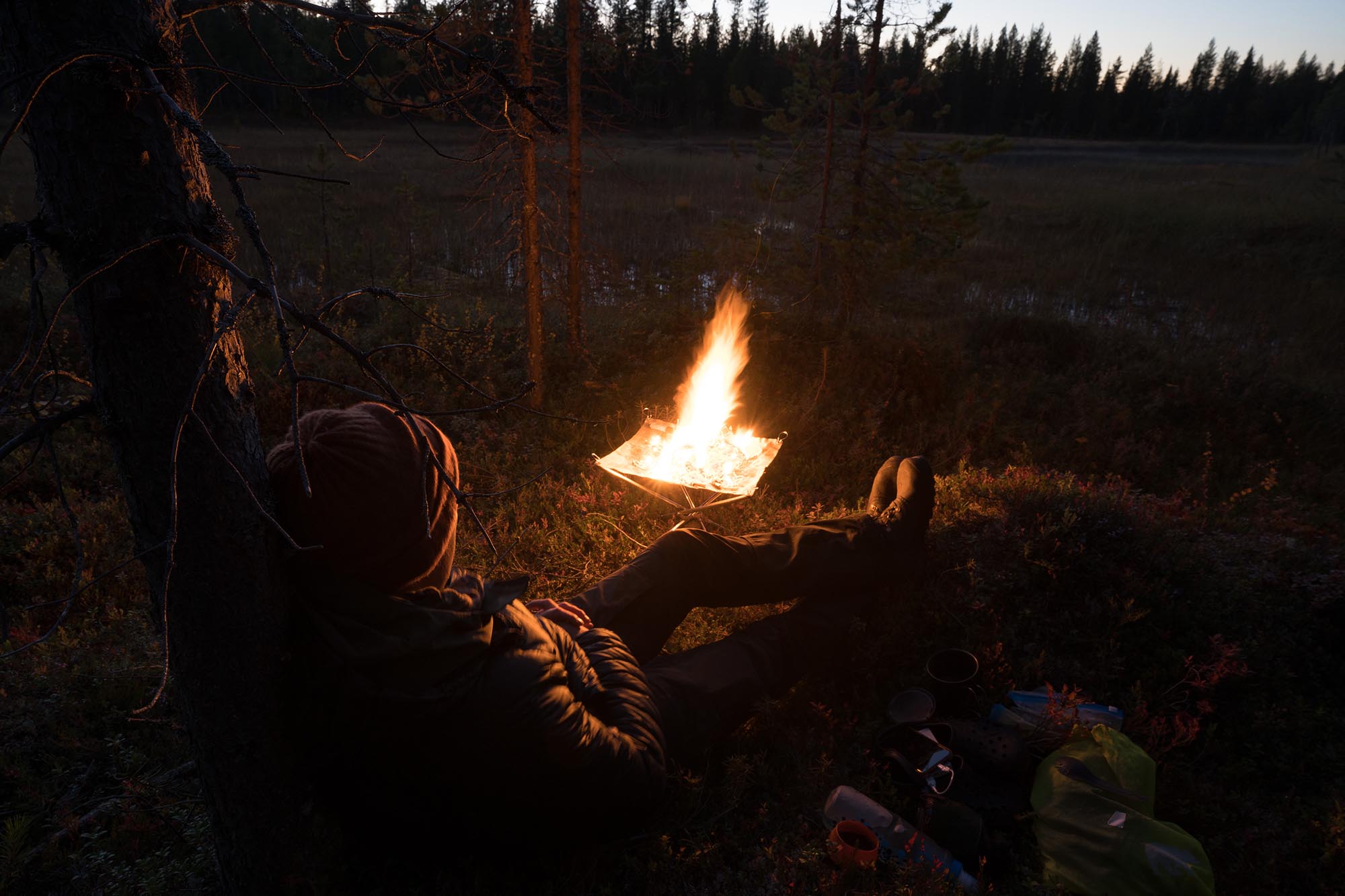 Jag tänder mitt hopfällbara vedkök, och värmer vatten till den frystorkade lunchen. Vedkök har det fina med sig att man nästan automatiskt kommer ner i tempo lite när man använder dem. Det tar sin lilla tid att samla en bunt kvistar, tända elden och värma vatten. Dessutom är det gemytligt att elda, och röken skrämmer bort myggen. Win, win, win således.