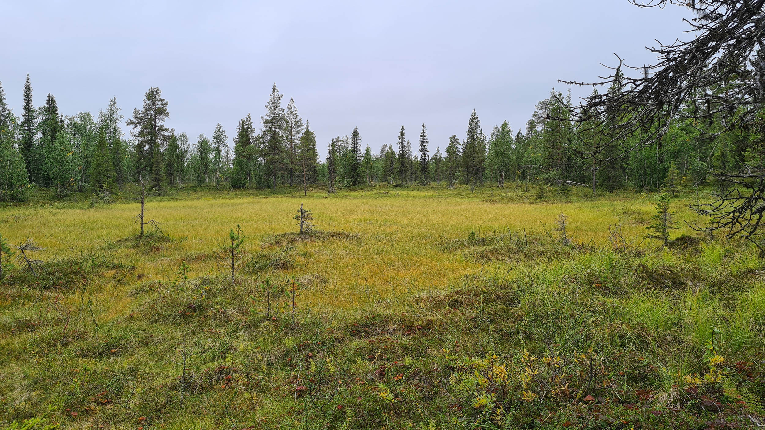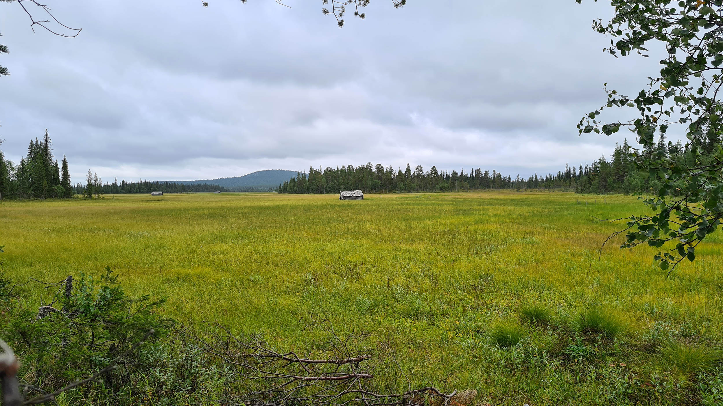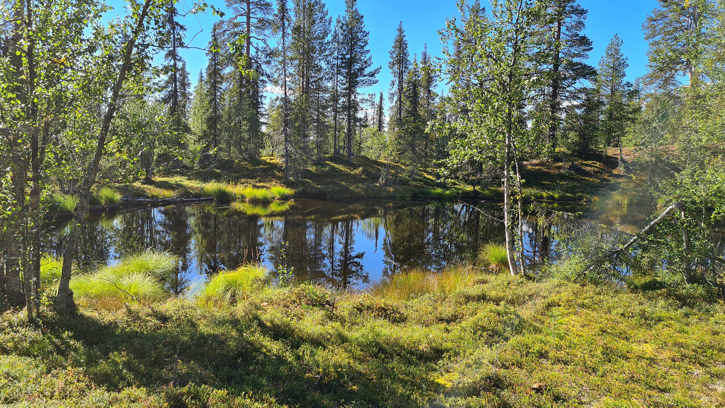 Väl över på berget Karhuvaara är terrängen aningen enklare och energinivån har nått nya höjder. Jag plöjer på i en så rak linje jag förmår. Dagen fortsätter ungefär så här ett bra tag. Vacker naturskog, som gjord att skogsbada i, blandat med blötare partier. Blåbär och hjortron finns det gott om. Lite fågelkvitter och några uppskrämda ripor flyger upp rakt framför en. Men framför allt är det tyst och lugnt. Timmarna flyter på och plötsligt står jag framför ytterligare en bäck väldigt snarlik den jag korsade igår. Vadet över bäcken sker lugnt och odramatiskt.