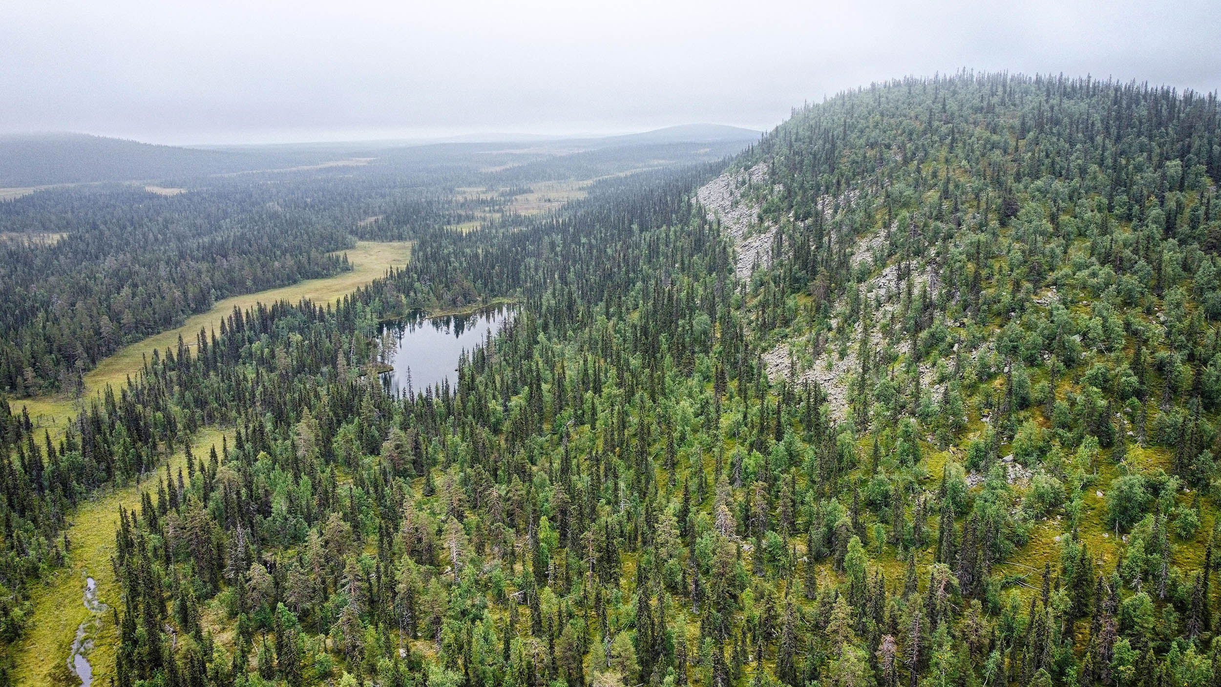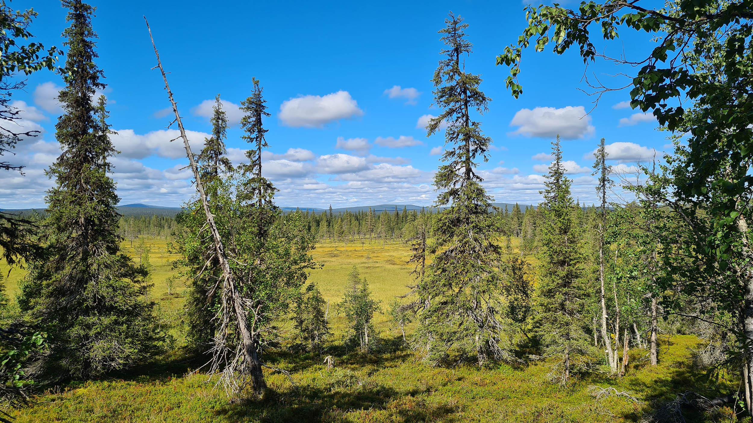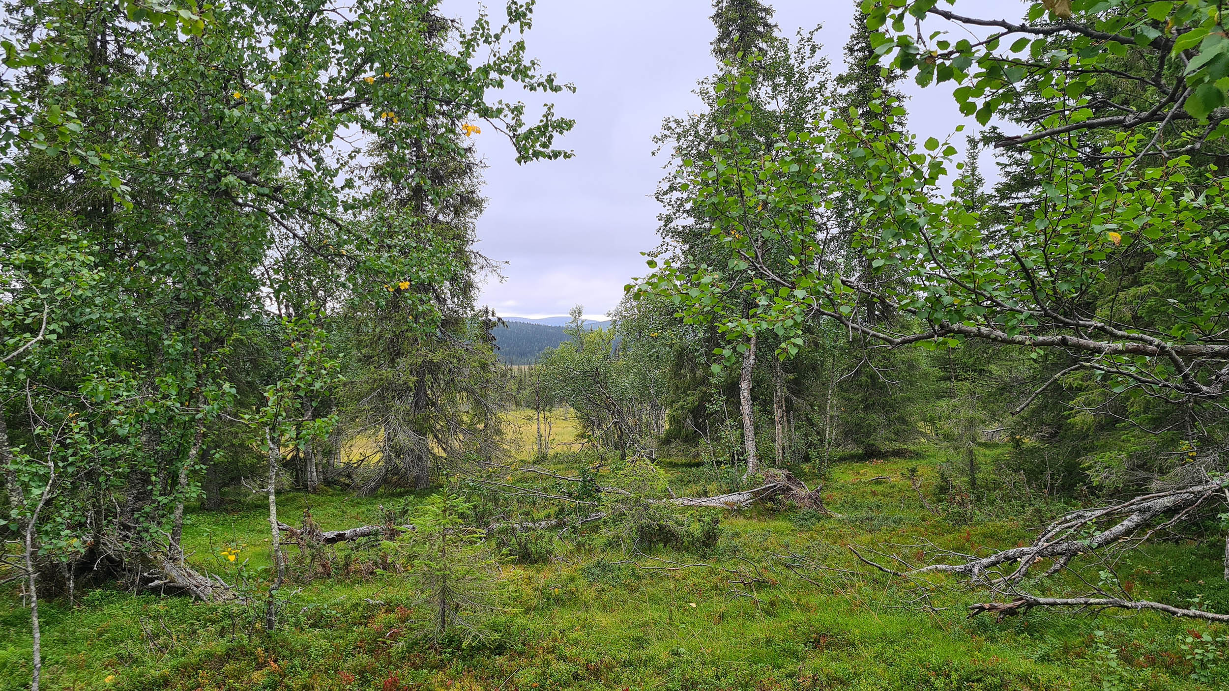 Väl över på berget Karhuvaara är terrängen aningen enklare och energinivån har nått nya höjder. Jag plöjer på i en så rak linje jag förmår. Dagen fortsätter ungefär så här ett bra tag. Vacker naturskog, som gjord att skogsbada i, blandat med blötare partier. Blåbär och hjortron finns det gott om. Lite fågelkvitter och några uppskrämda ripor flyger upp rakt framför en. Men framför allt är det tyst och lugnt. Timmarna flyter på och plötsligt står jag framför ytterligare en bäck väldigt snarlik den jag korsade igår. Vadet över bäcken sker lugnt och odramatiskt.