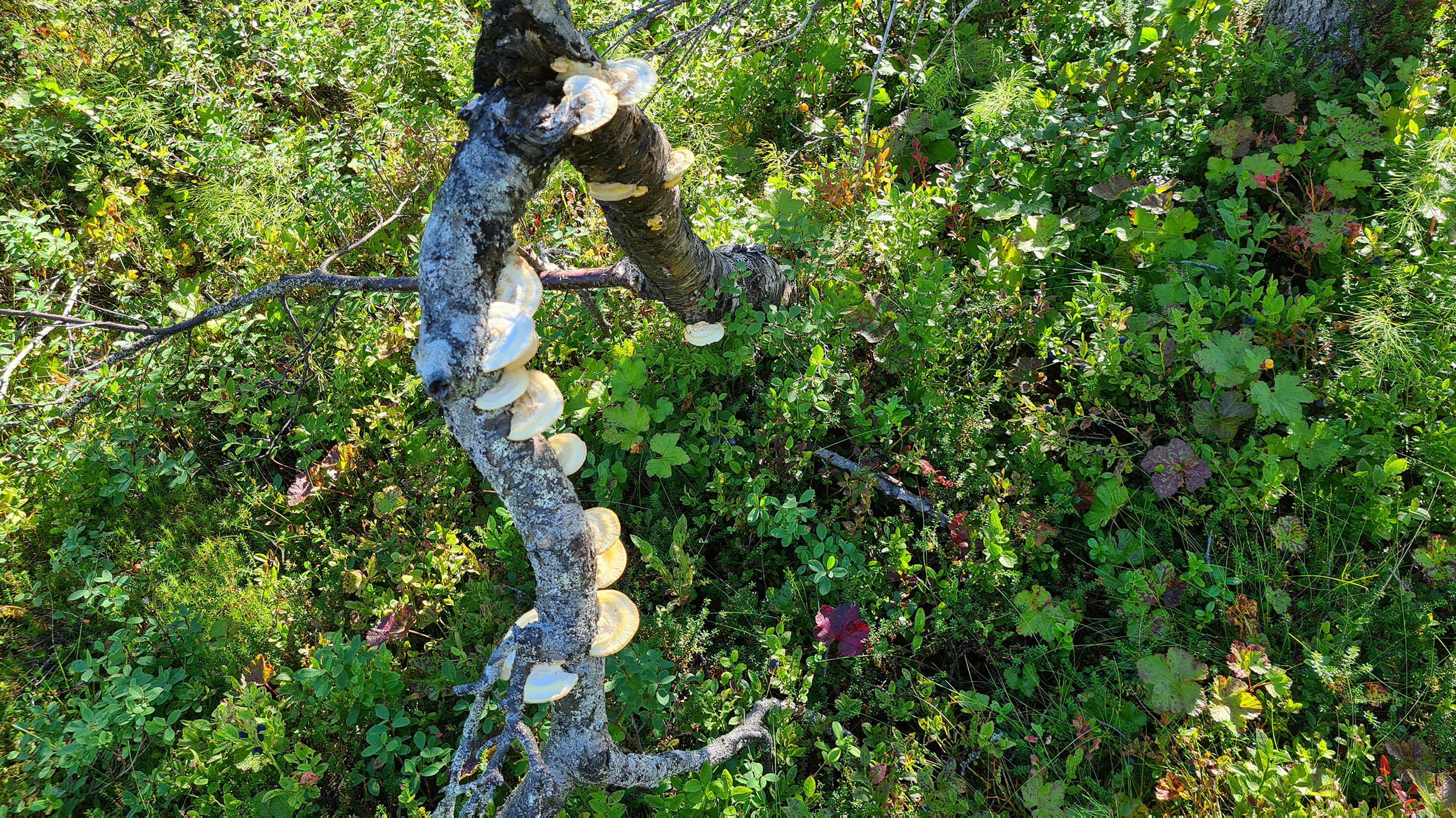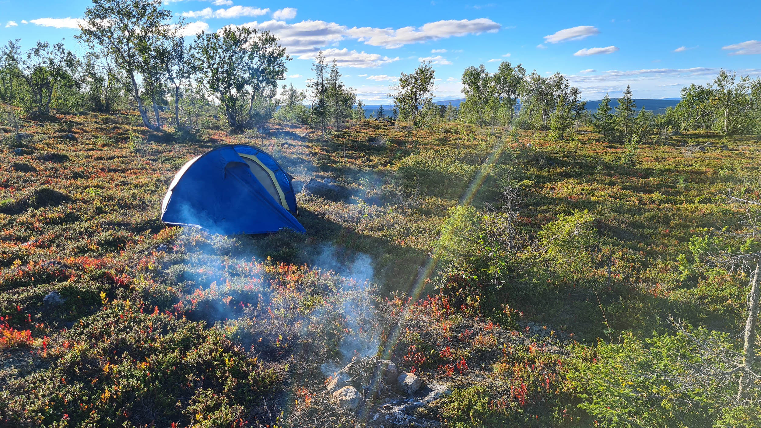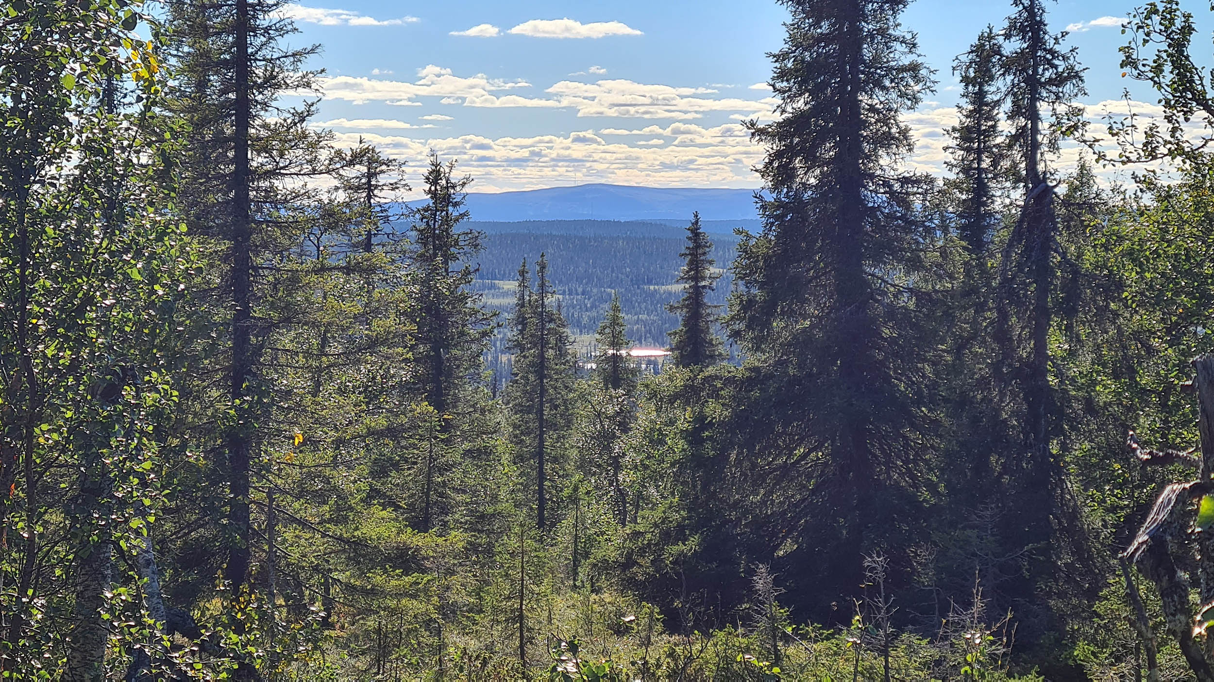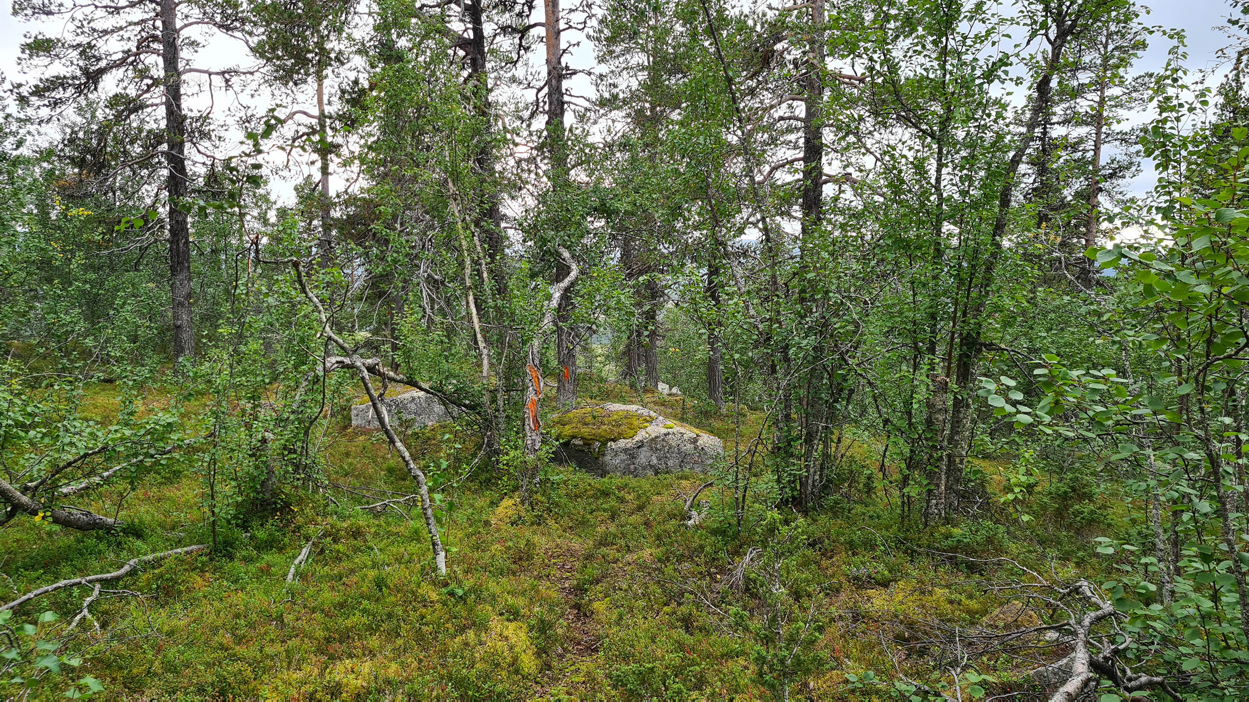 Så fortskrider dagen med att navigera sig genom skogen och de våta partierna. Jag planerar att sätta camp på toppen av Tossisvaara då jag tänker mig att skogen är glesare där. Börjar vandringen uppför och det är alltid lika förvånande hur mycket jobbigare det är att vandra upp för en brant. Väl uppe är det mycket riktigt betydligt glesare mellan träden och mera fjällikt. Björken är dominant och man bjuds på vackra vyer. Däremot tycker jag att det är om möjligt ännu mer björnspillning här.