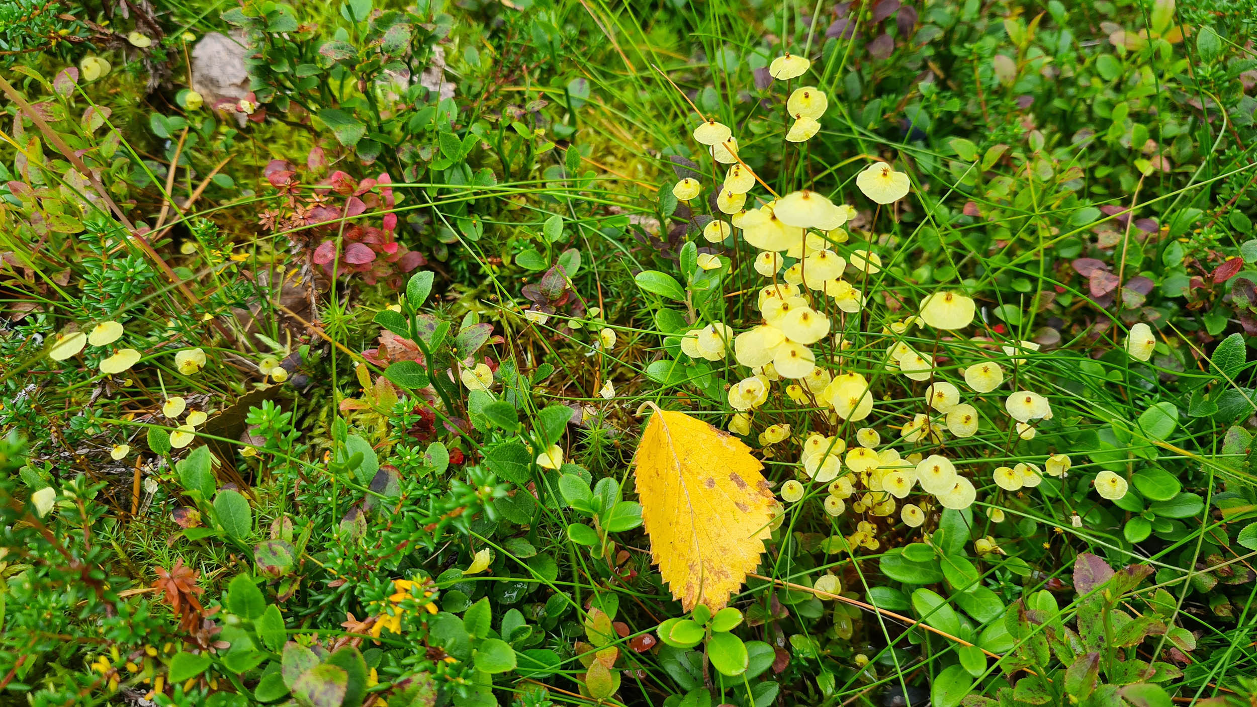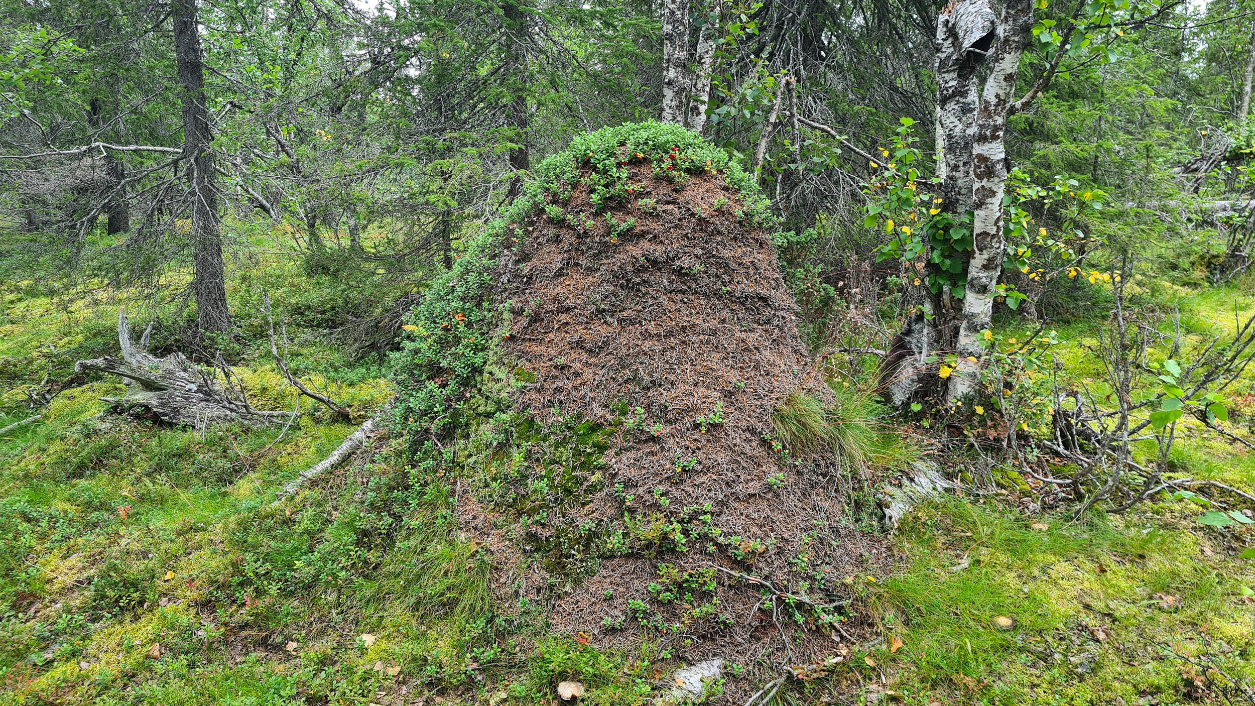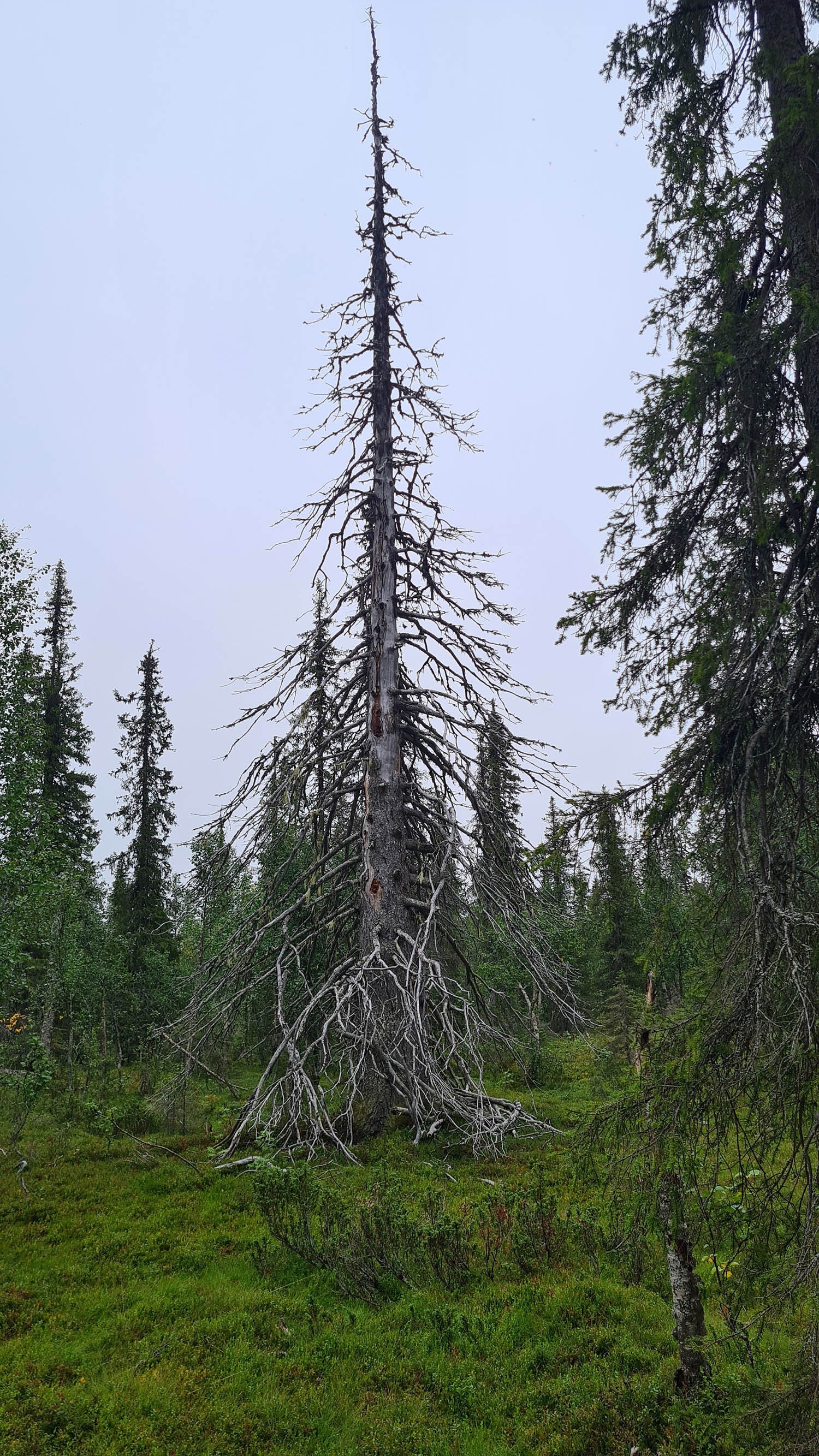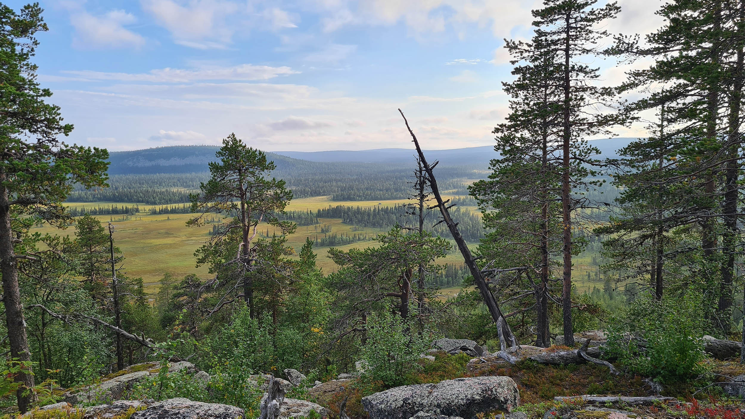 Så fortskrider dagen med att navigera sig genom skogen och de våta partierna. Jag planerar att sätta camp på toppen av Tossisvaara då jag tänker mig att skogen är glesare där. Börjar vandringen uppför och det är alltid lika förvånande hur mycket jobbigare det är att vandra upp för en brant. Väl uppe är det mycket riktigt betydligt glesare mellan träden och mera fjällikt. Björken är dominant och man bjuds på vackra vyer. Däremot tycker jag att det är om möjligt ännu mer björnspillning här.