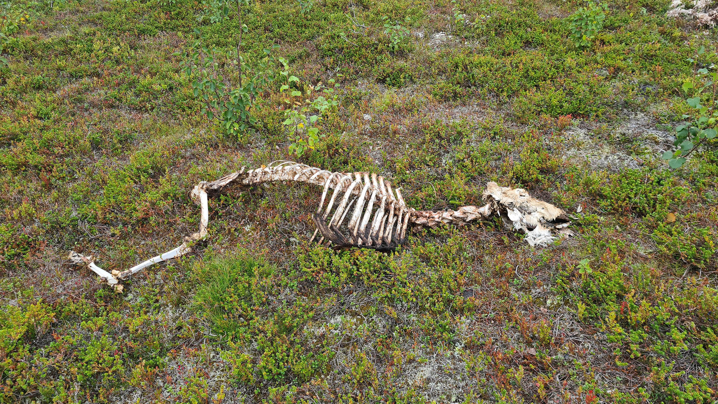 Hittar en stor platt yta där jag slår upp tältet. Passar på att undersöka närområdet när jag ser något misstänksamt. Närmar mig lite försiktigt tills jag ser att det är en död ren. Några meter från renen ligger tussar från pälsen. Jag är varken viltvårdare eller kriminalare men min slutsats är att det är en björn som har slagit renen. Det finns både brottsplats, fyndplats samt motiv.