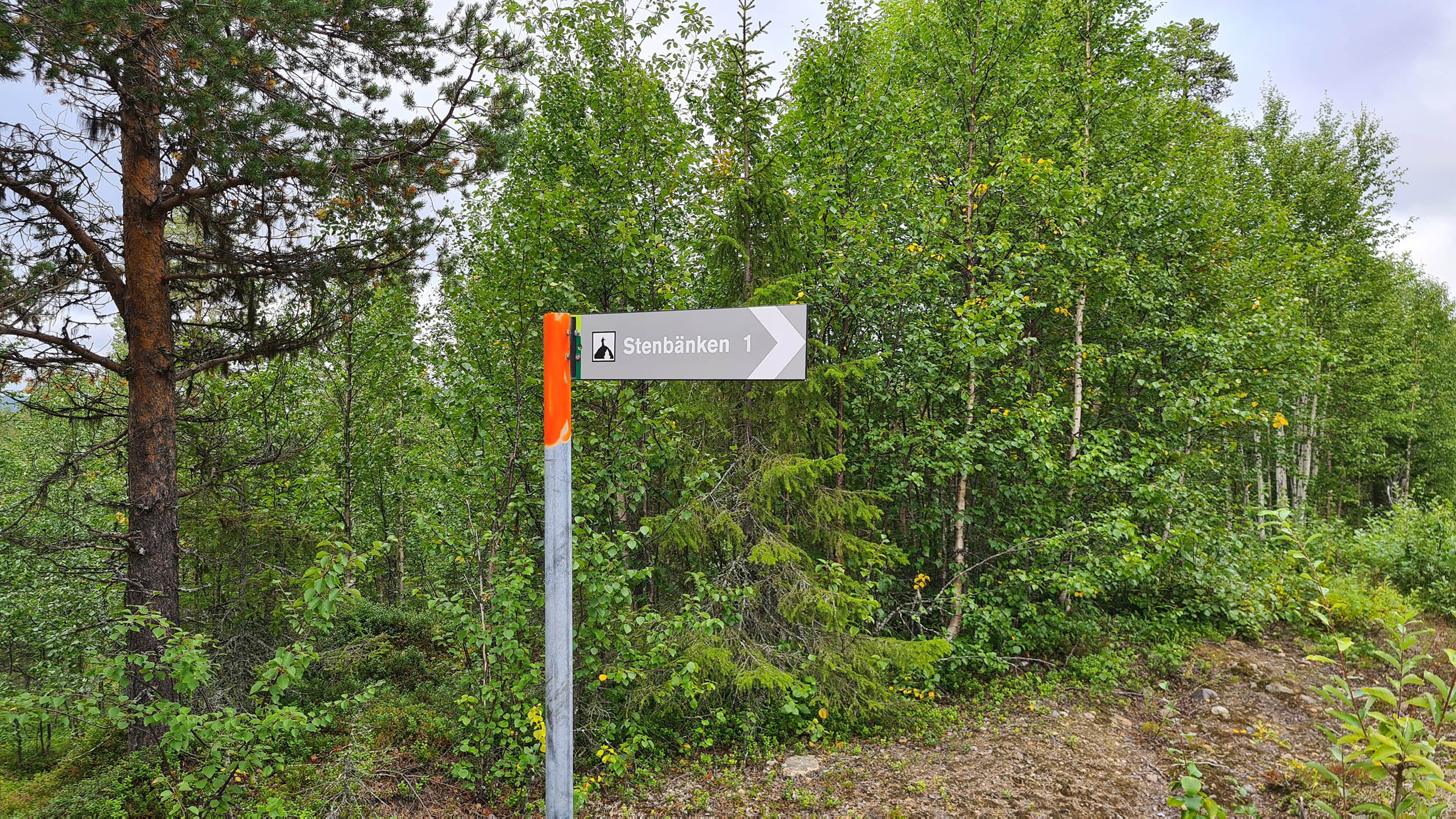 Därmed är de mest utmanande partierna bakom mig. Jag finner mig nu på en grusväg som jag följer i cirka 3 km. Målet är inställt på stenbänken som finns i alla ekoparker och mycket riktigt hittar jag en liten skylt längs vägen som pekar in mot skogen. Nu börjar återigen en stigning och jag tar mig an den sista ansträngningen.