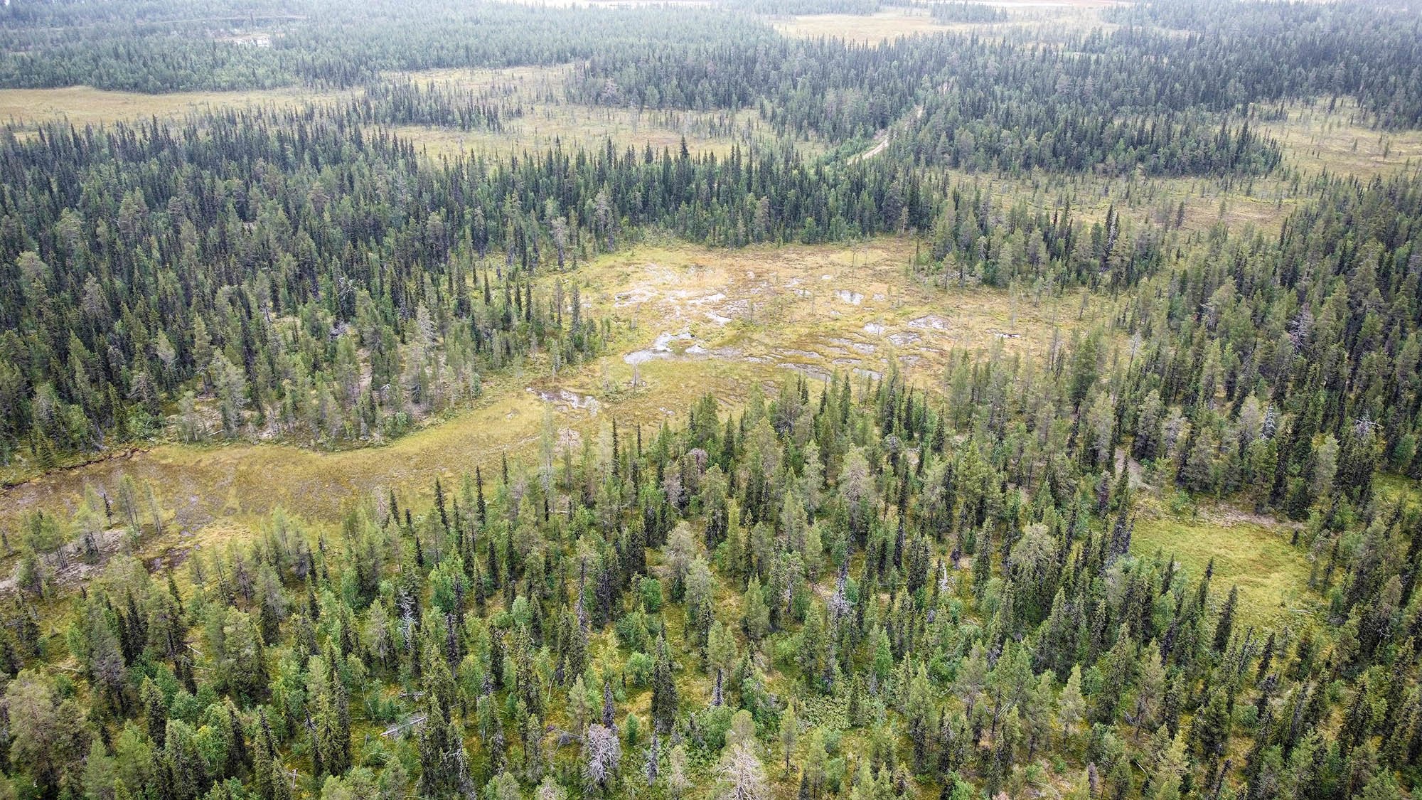 Jag får koncentrera mig för att hålla rätt kurs. Det är påfallande enkelt att tappa kursen när man går obanat i en vildvuxen skog, då Ekopark Karhuvaara framför allt består av gammal skog. Och i en gammal skog råder ingen ordning utan allt är huller om buller. Och är det inte skog så är det myrmark. Här råder det motsatta förhållandet, lätt att hålla kurs men ofta omöjligt att ta sig rätt över.