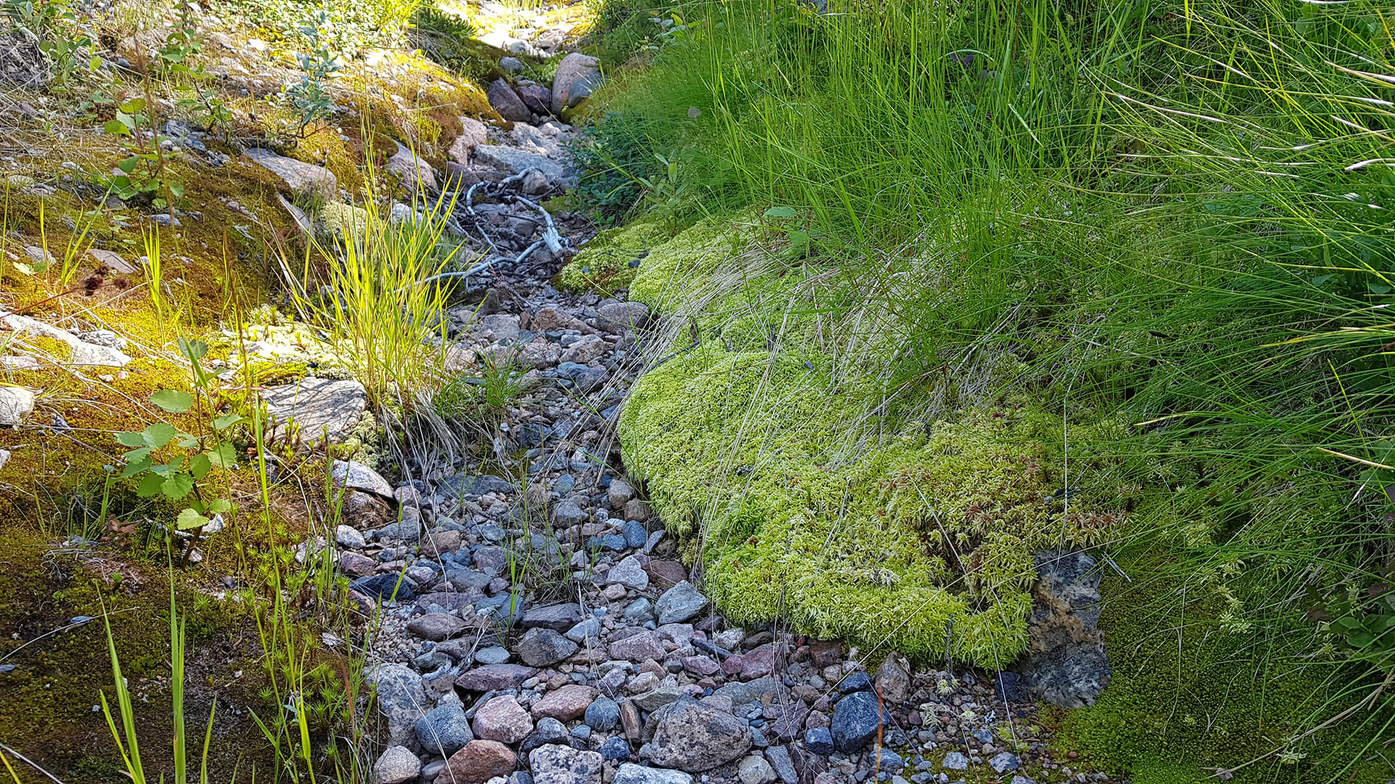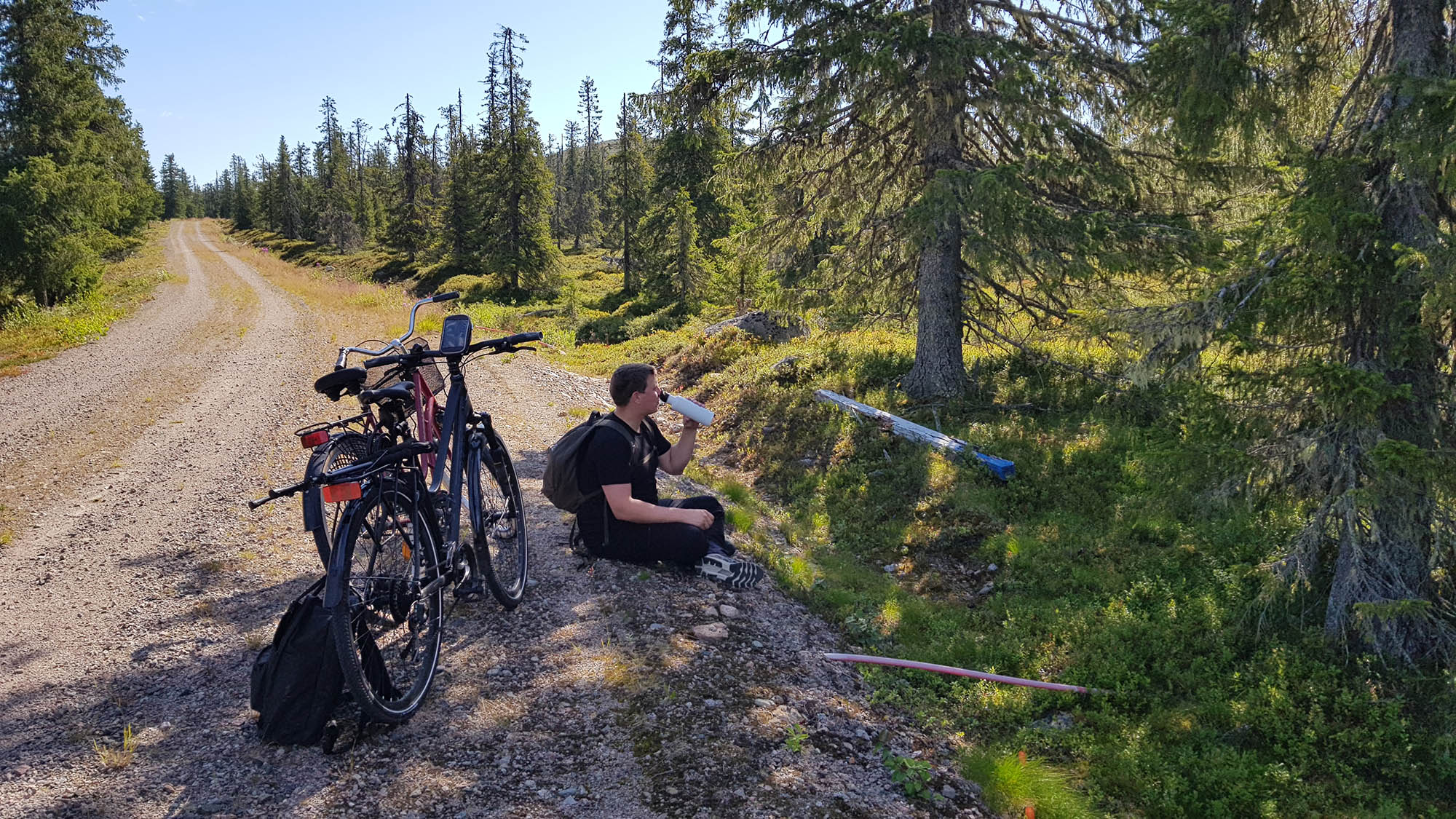 Första delen var lättcyklad och gick längs Geijejaurevägen, här passerade vi myrmarker och redan nu kunde vi se orörd gammal skog. Känslan av att vi var på väg in i den riktiga vildmarken blev tydligare då vi efter cirka 2 kilometer tog av till vänster vid bommen och vägen bar iväg uppåt. Här kantades sidorna av granurskog med många sagolika torrfuror. Vi fick nu gå med cyklarna då det bitvis var för tungt för att cykla. Vi passade då på att titta lite närmare på allt från utsikt till flora och fauna och vägen kändes inte alls så jobbig och lång. Vi hade verkligen tur med vädret och vi förundrades också över att det inte var några mygg.