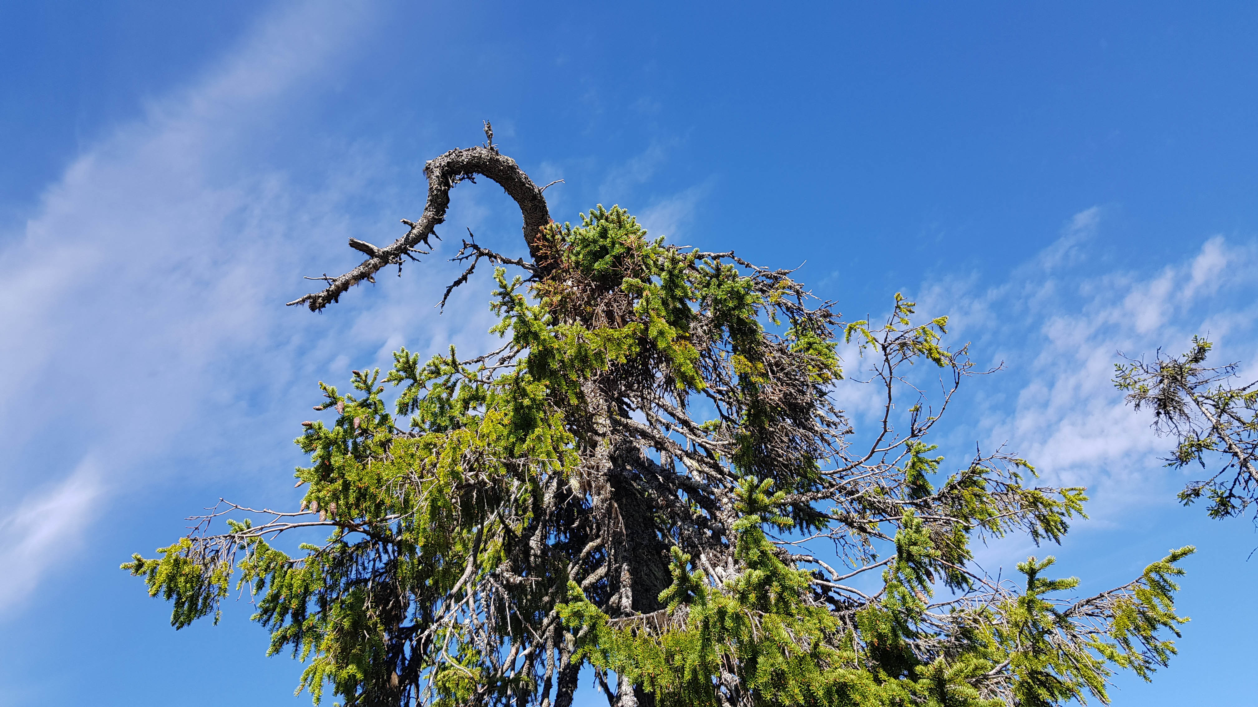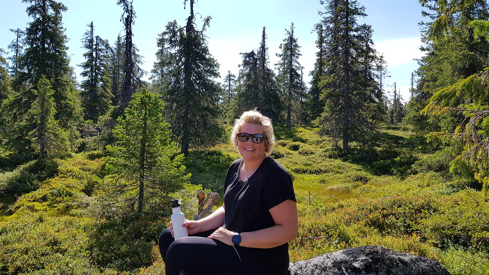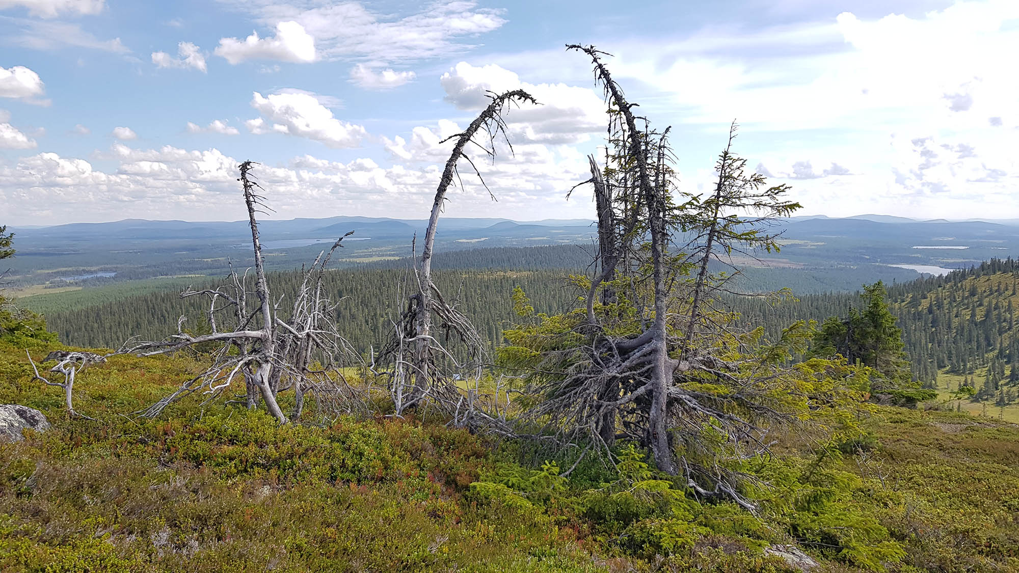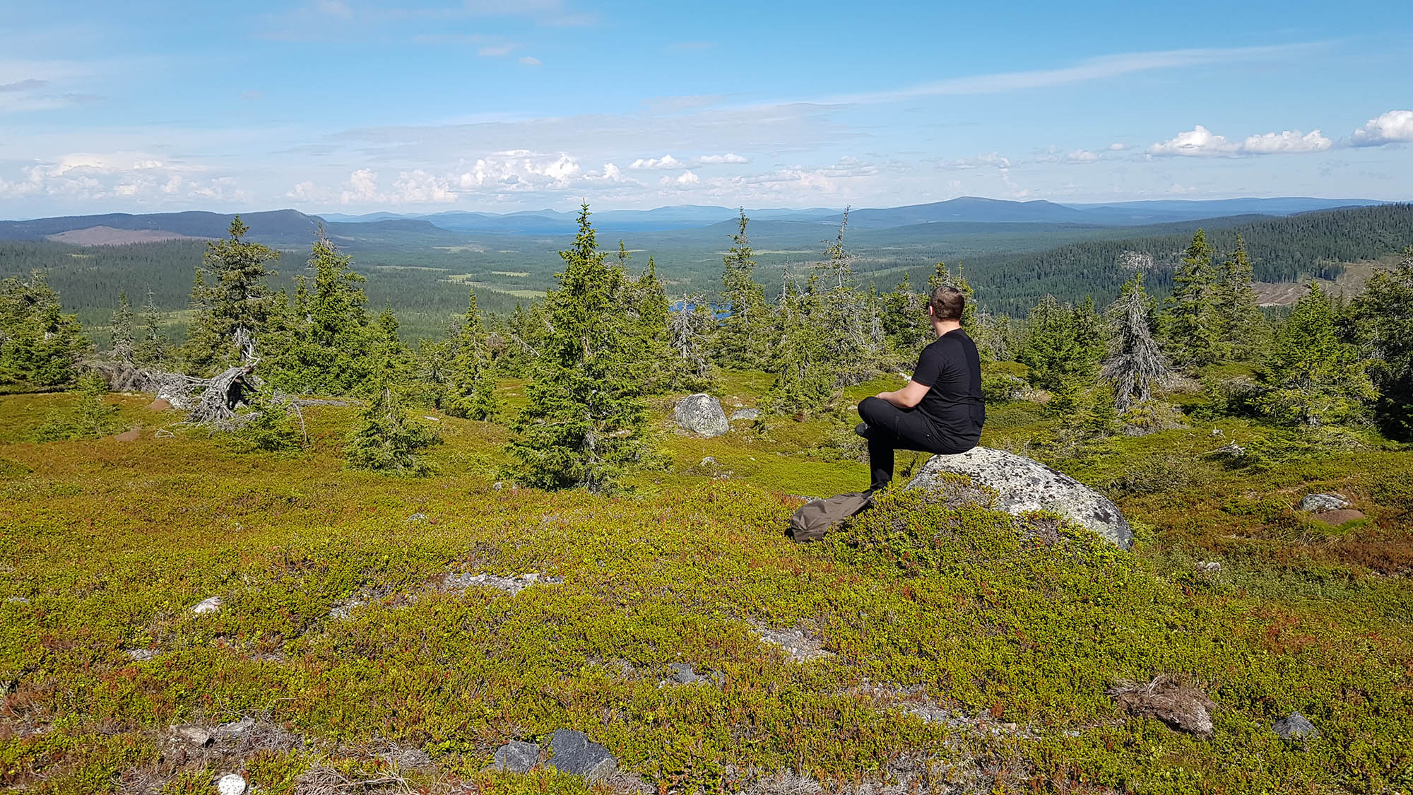 När vi väl skymtade fjällplatån mellan de stora granarna snabbade vi på stegen och den fina grusvägen ledde oss nästan ända upp på toppen. Här mötes vi av två renar som lunkade i väg över den mjuka mossbädden. Vi lämnade cyklarna och vandrade den sista biten upp till en av topparna. Utsikten vi mötes av går inte att beskriva med ord utan måste nog upplevas. Fjällheden gjorde vyerna fantastiska och vi kunde se i alla väderstreck. Här behövdes verkligen ingen karta och kompass då terrängen var så öppen.