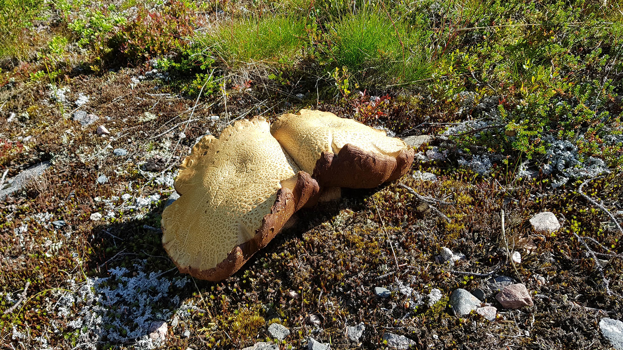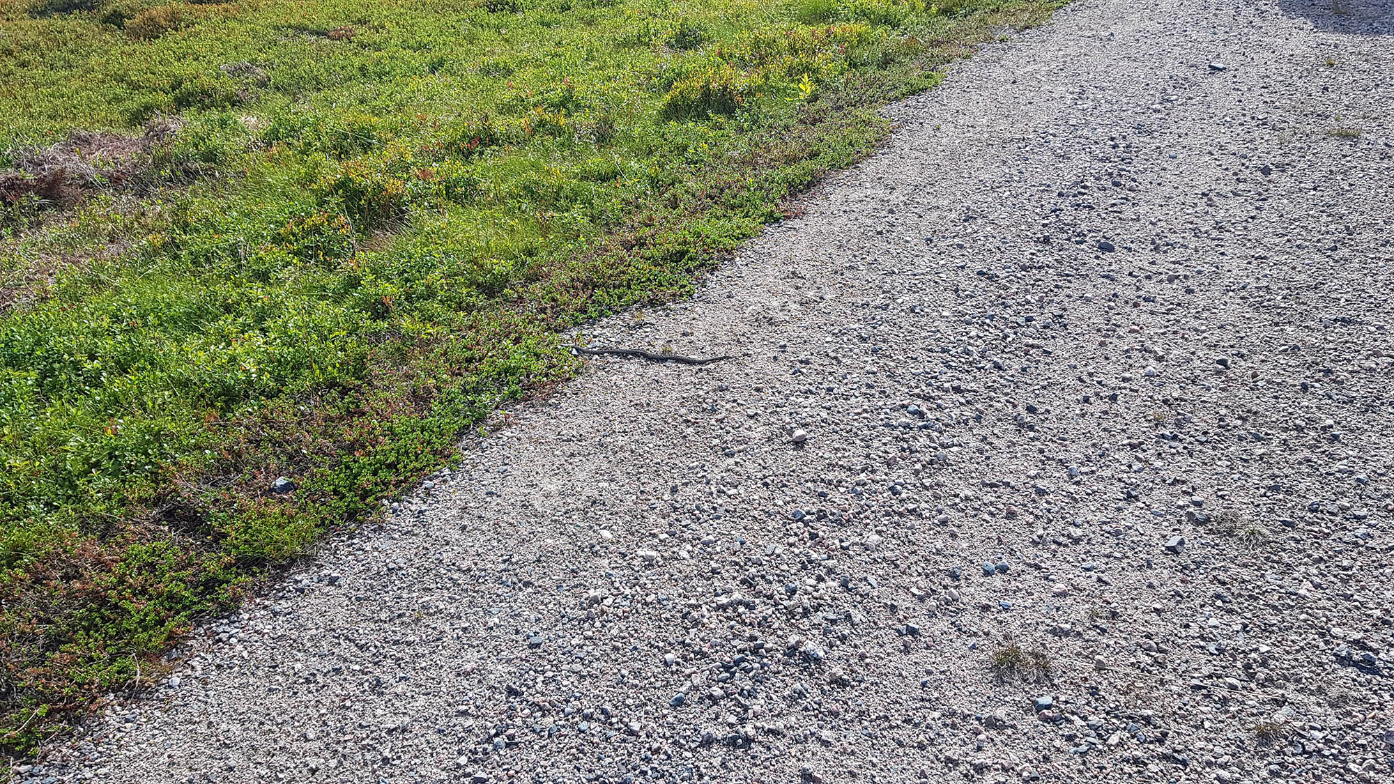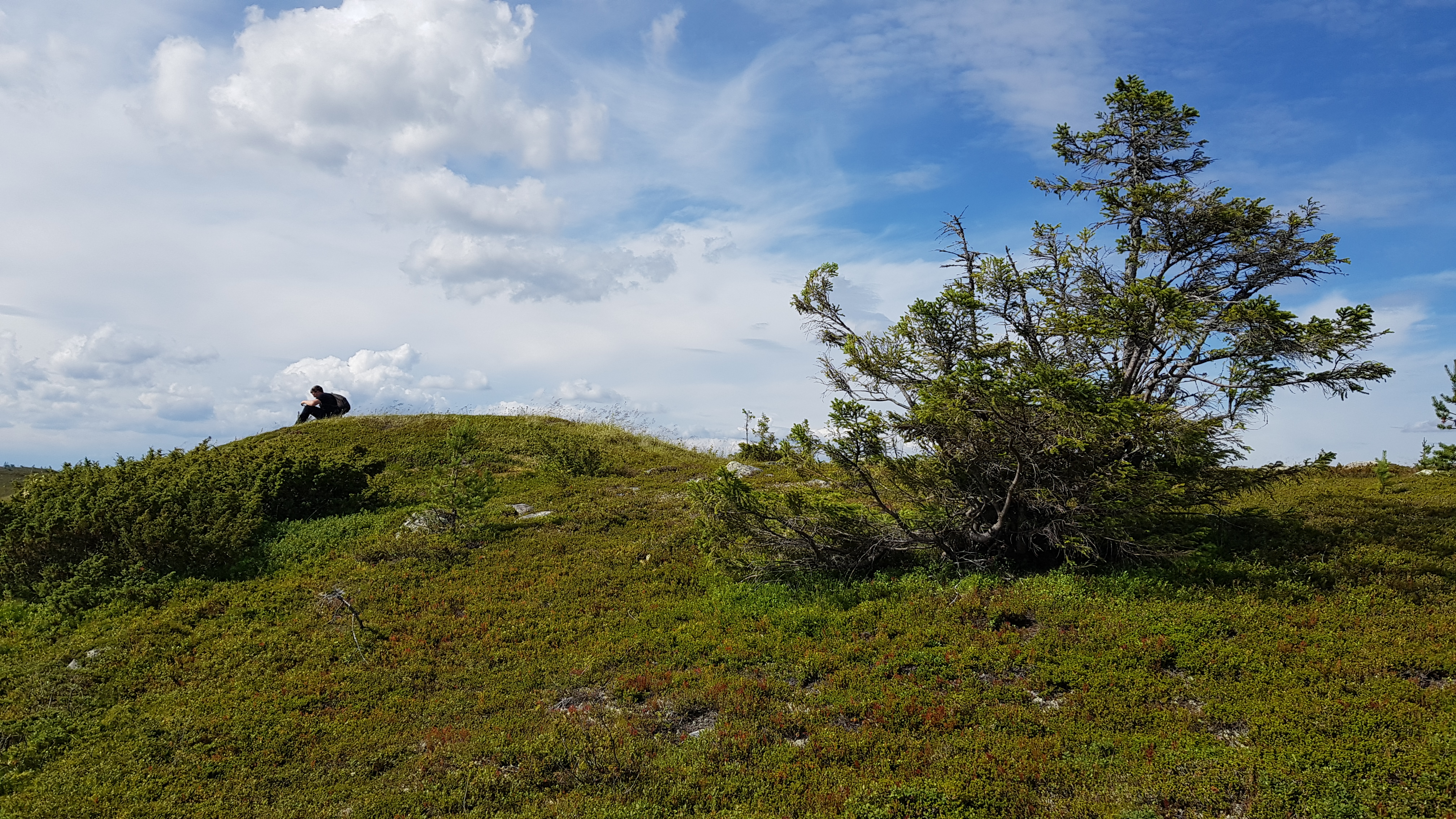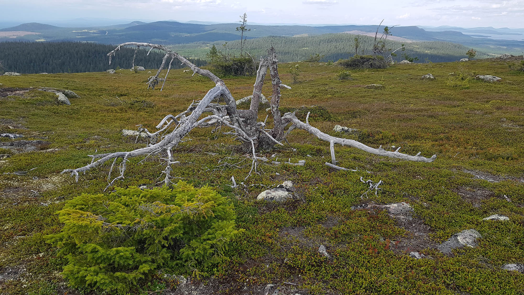När vi slagit oss ner i mossan på en sluttning ångrar vi att vi inte hade tagit med en kikare. Vi utforskade oss runt Sotbergets alla små toppar och kullar och det blev en hel del bilder. Vi såg växter vi inte var vana att se i skog och mark sedan tidigare och fångade nästan en liten huggorm på bild som låg och solade sig på grusvägen. Från Sotberget såg vi över till Ledvattsfjällets böljande kullar och vi insåg där och då våra begräsningar. Fjället reste sig mäktigt ur landskapet med sina 727 meter över havet och bara vandringen dit kräver nog mer vana vandrare än de vi är.