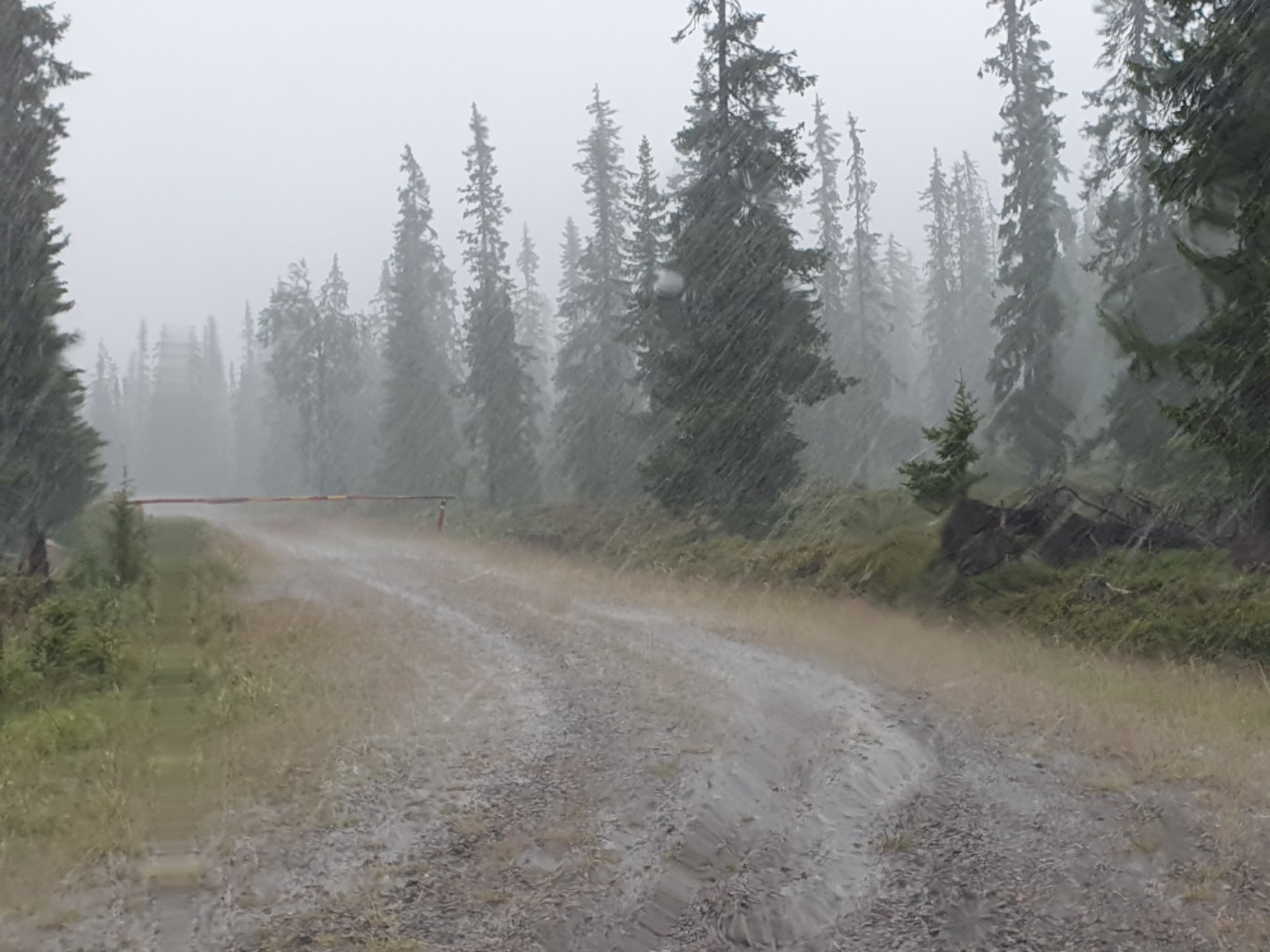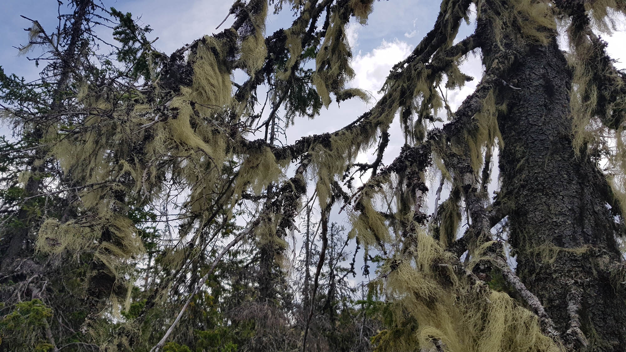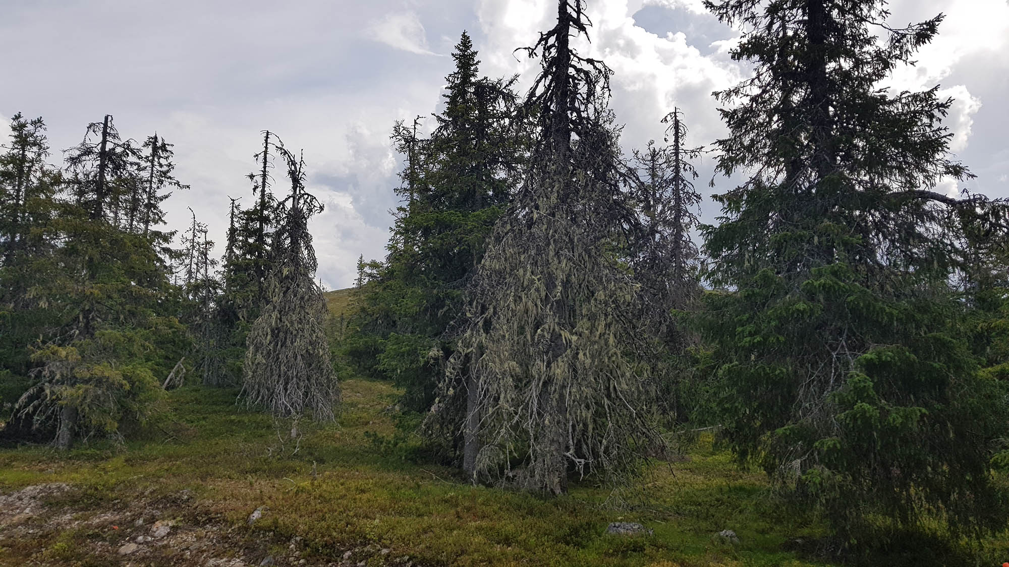 När vi spenderat stora delar av dagen uppe på berget såg vi mörka moln i väster. Vi packade ihop våra grejer och rullade neråt. Om vägen upp hade varit bitvis jobbig så fick vi tillbaka det på vägen ner, vi behövde inte trampa en enda gång och bromsarna gick varm. Trots att vi stannat så många gånger när vi var på väg upp så dök det upp nya saker när vi rullade nerför. Vi stannade för att fotografera träd som var överfulla med skägglav och som såg ut som stora troll. Mullrandet av åska hördes i närheten och vi skyndade oss till bilen. Precis när vi lastat cyklar och ryggsäckar kände vi första droppen av regn och vi förundrades än en gång att vi knappt sett en mygga under hela dagen.