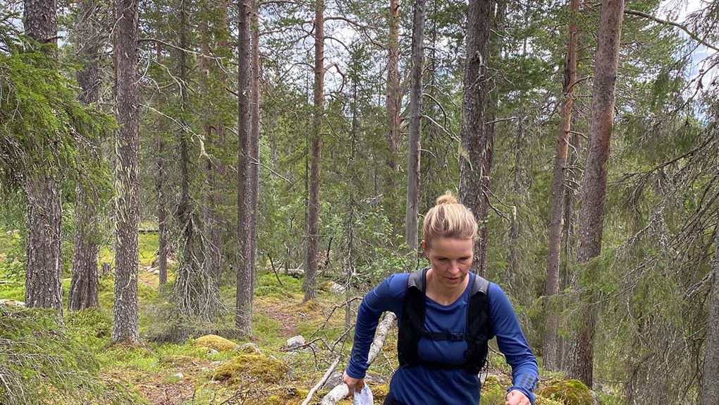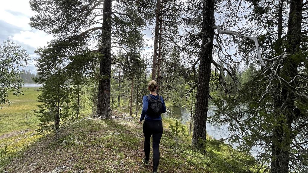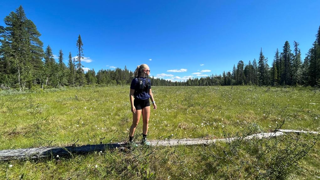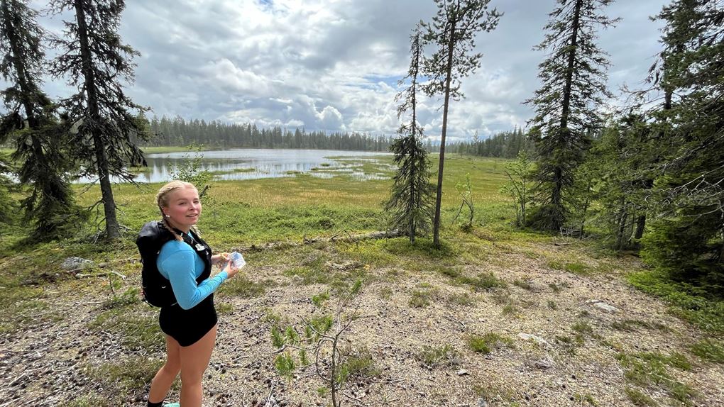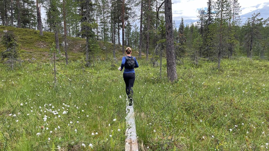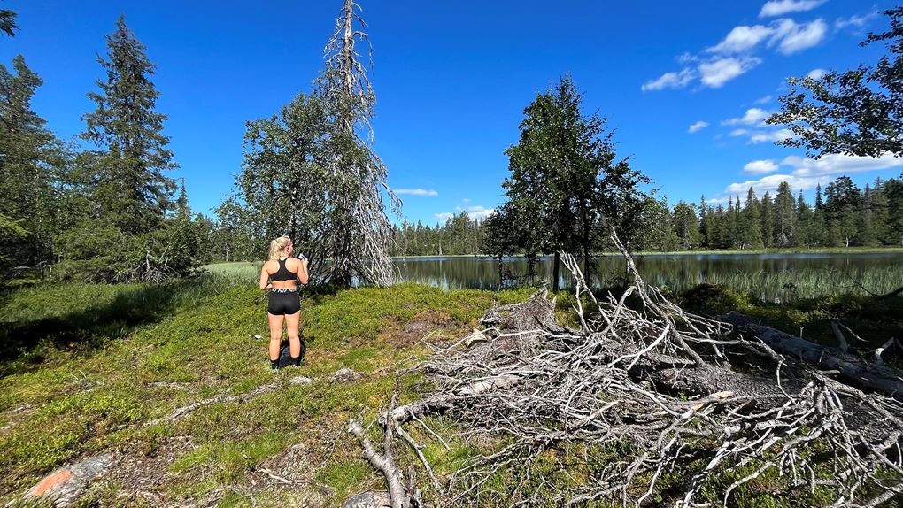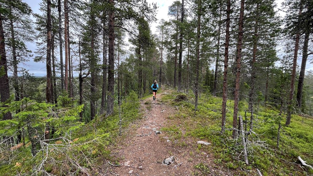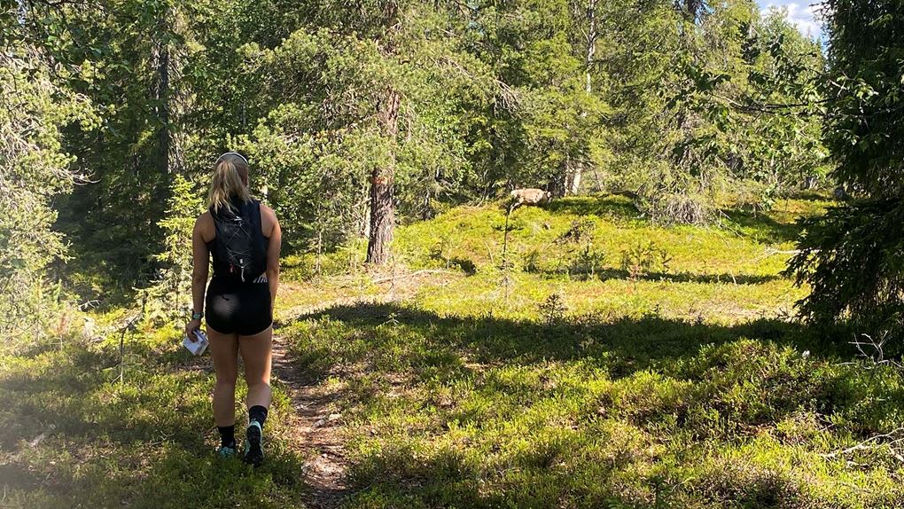 Idag ska vi springa på stig! Vi ska springa på leder som ska ta oss till Iso Leipipir, ekoparkens högsta berg. Vi lämnar basecamp BIL och startar vår löptur i soligt väder och samma terräng som vi uppskattade så mycket igår. Efter några kilometer byter skogen karaktär och istället för den småkuperade terrängen så springer vi nu genom storskog med större myrar och högre bergsknallar. Vi möter en ren mitt i skogen som slår följe med oss en bit, ett trevligare sällskap än flugorna och myggen.