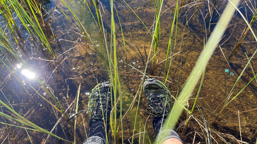 Vi närmar oss den första rejäla myren som ska passeras och börjar känna viss tveksamhet till äventyret. Antalet myggor fördubblas plötsligt och myren ser ganska blöt ut. När Nora står och hoppar och svär testar Lena myrens fasthet. ”Det är lugnt, den är inte så blöt” ropas det för att i nästa sekund trampas rakt ner i ett lite för djupt blöthål. Vi inser våra begränsningar och vänder tillbaka.