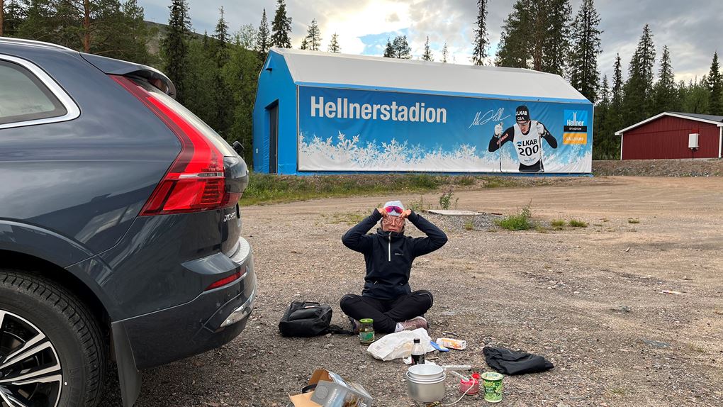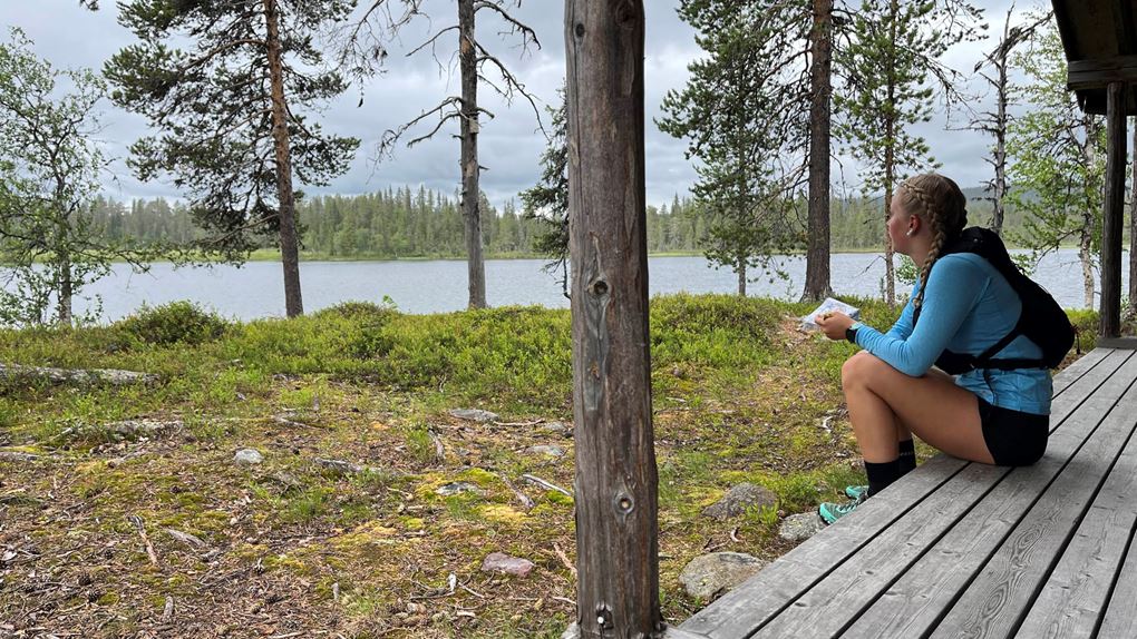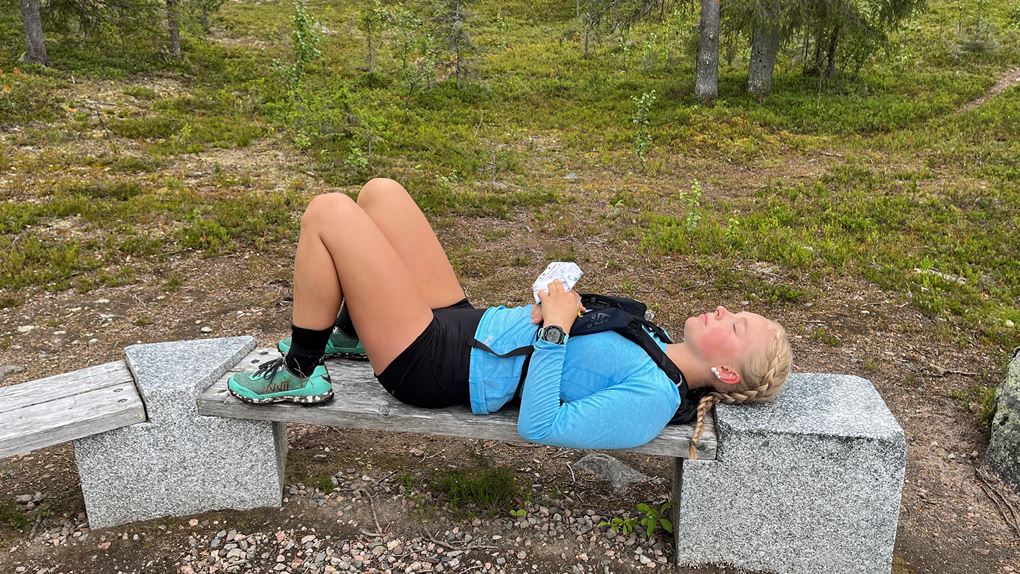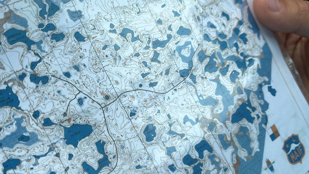 Vi väljer att springa runt i dödisområdet Nirra istället och är åter i drömterrängen. Nora orienterar som en kung på kartan från 1973 och antal mygg minskar något. Området vi springer igenom är småkuperat och fyllt med små tjärnar. Vi har turen att hitta den stenbänk som finns som landmärke i parken, dessa finns i alla ekoparker. Löpturen avslutas med ett svalt bad i en tjärn tillsammans med myggen. När vi ska sova i basecamp BIL ser vi att väderapporten lovar strålande sol imorgon.