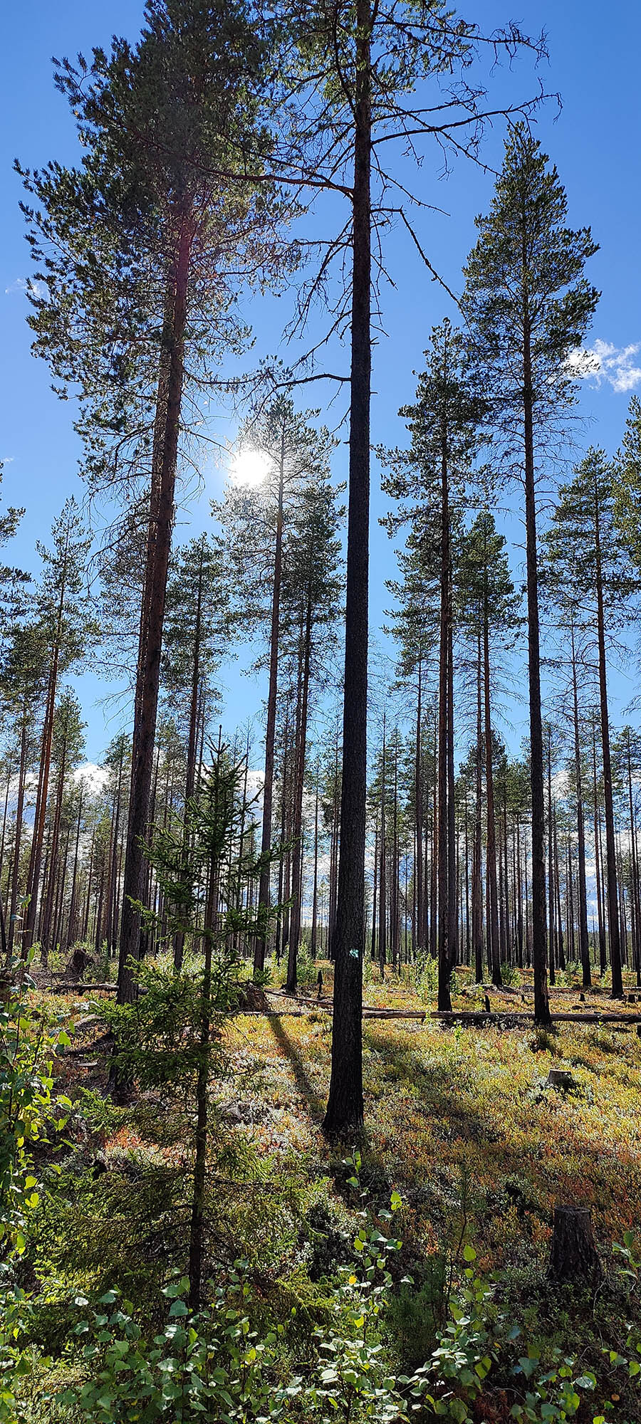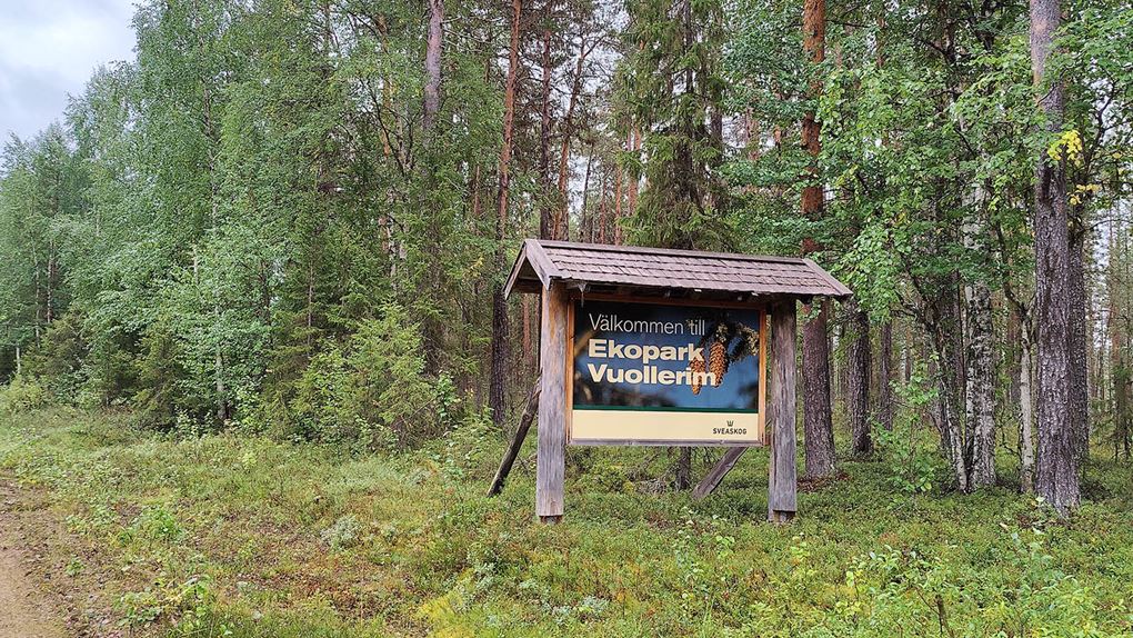På ekoparkskartan benämns det här området som Fejferheden och är man här i rätt säsong ska man kunna hitta diverse olika ätbara svampar. Svårt för mig att veta, jag har gett mig själv diagnosen svampblind och får nöja mig med svamp från affären. Fejferheden består av sandtallskog så här är det lätt och fort att gå. På håll ser vi en stor flock småfåglar som flyger mellan träden framför oss. Vi kommer ut på bilvägen som går i ytterkant av ekoparken, samma väg vi kom med bilen igår. Äventyret börjar närma sig sitt slut men på väg till bilen ska vi svänga förbi Vuollerimselet och kika på ekoparksbänken.