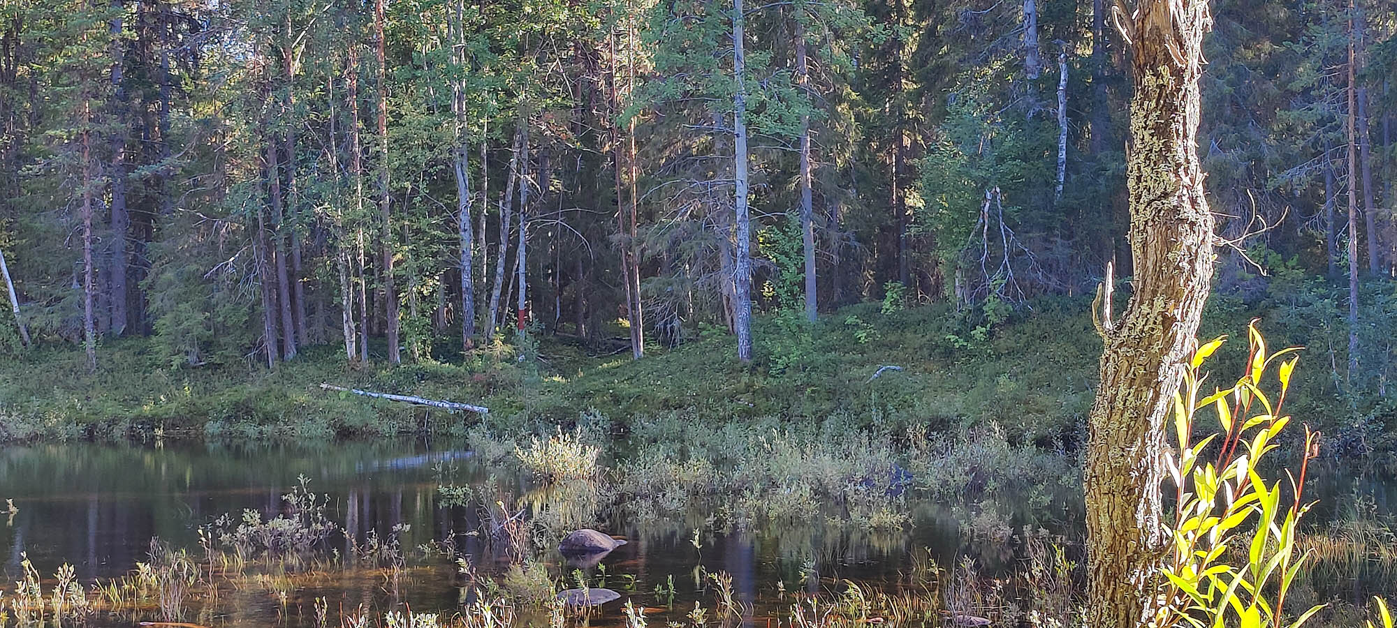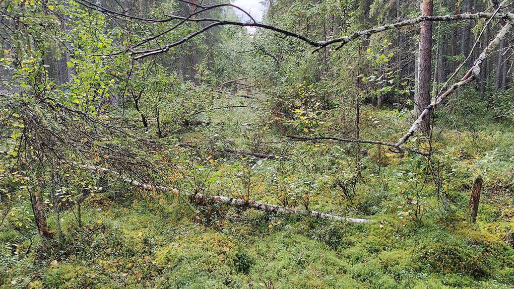Planen är att vi ska gå genom skogen, korsa några bäckar, passera en gammal slåttermyr, via kraftledningen och ner till Stora Luleälven. I den här delen av ekoparken är skogen tät, träden är små och marken är blöt. Men vi kämpar på. Förmiddagens regnskur gör att vi trots uppehåll blir blöta av att gå genom den täta skogen.