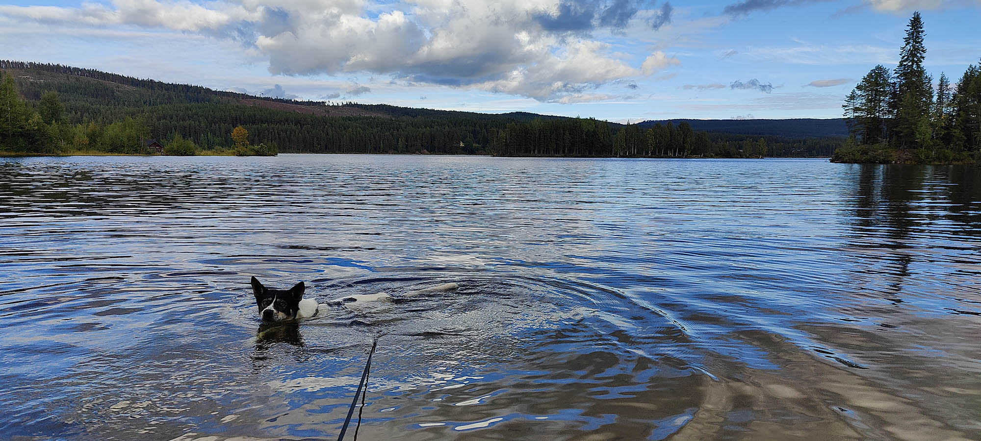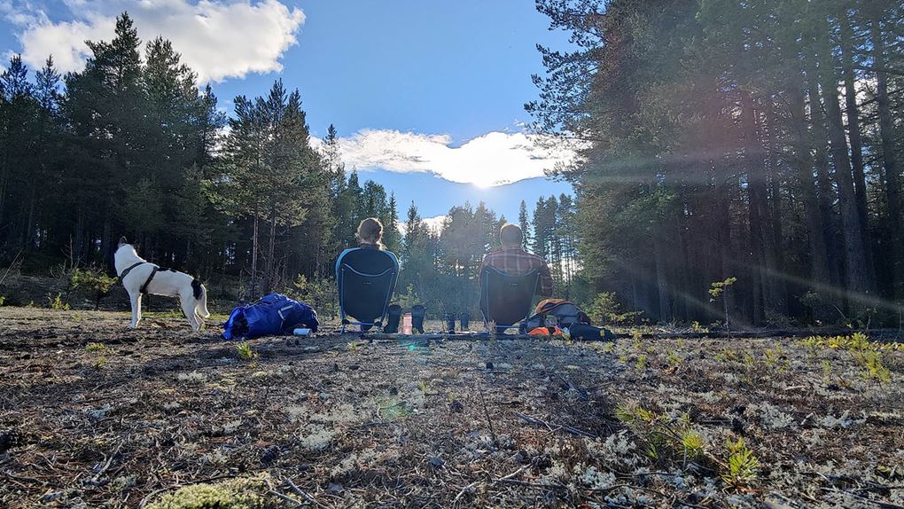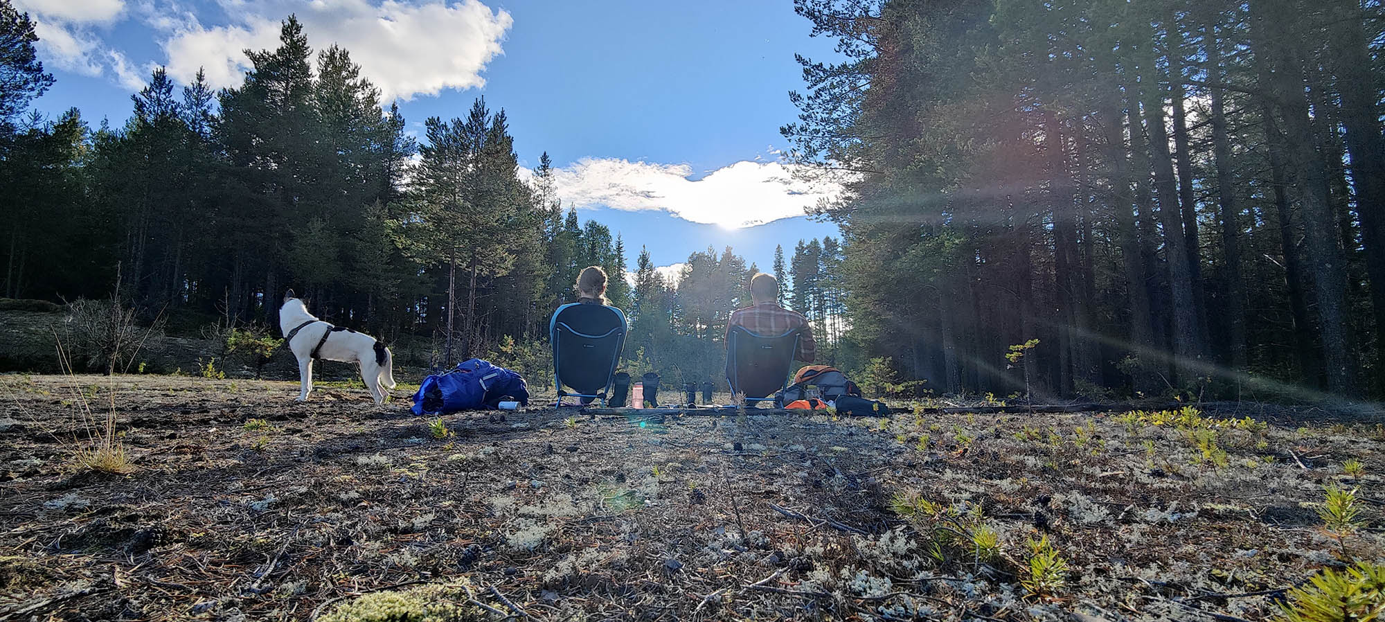 Väl ute på vägen sträcker vi ut benen och farten höjs, vi ser ett par rådjursspår i vägkanten. De måste vara färska för annars hade regnet på förmiddagen sköljt bort spåren. Molnen har börjat spricka upp och vi börjar se blå himmel, om väderprognosen stämmer kommer det bli en riktigt fin kväll och morgondag. Vi passerar Djupbäcken innan vi viker av från vägen och rör oss ner mot älven. På en liten udde mellan utloppen för Djupbäcken och Västabäcken finns det en öppen, plan yta. Perfekt att tälta på. Vi kan äntligen ta av oss kängorna och hänger upp blöta strumpor i träden så dom har en chans att torka. Packar upp campingstolarna och slår oss ner. Niják passar på att ta ett dopp i älven, jag nöjer mig med att bada fötterna. Mycket skönt tyckte vi båda!
