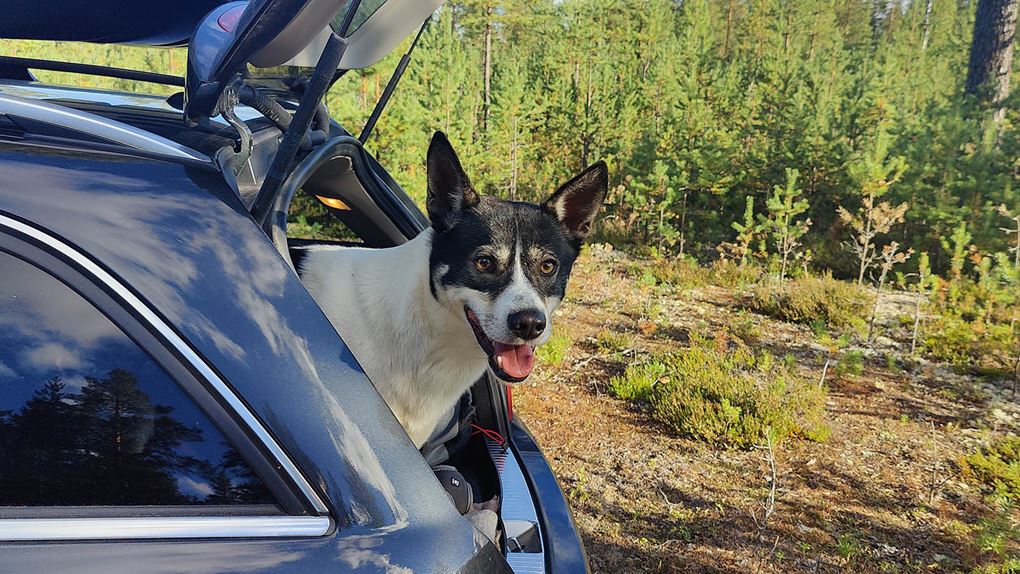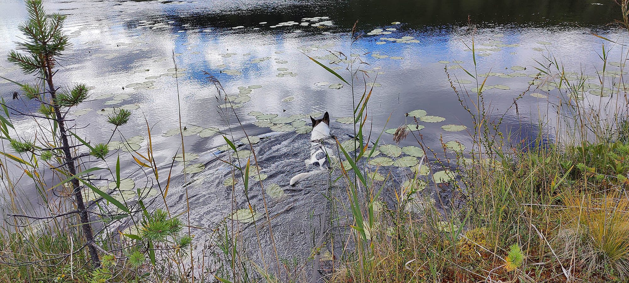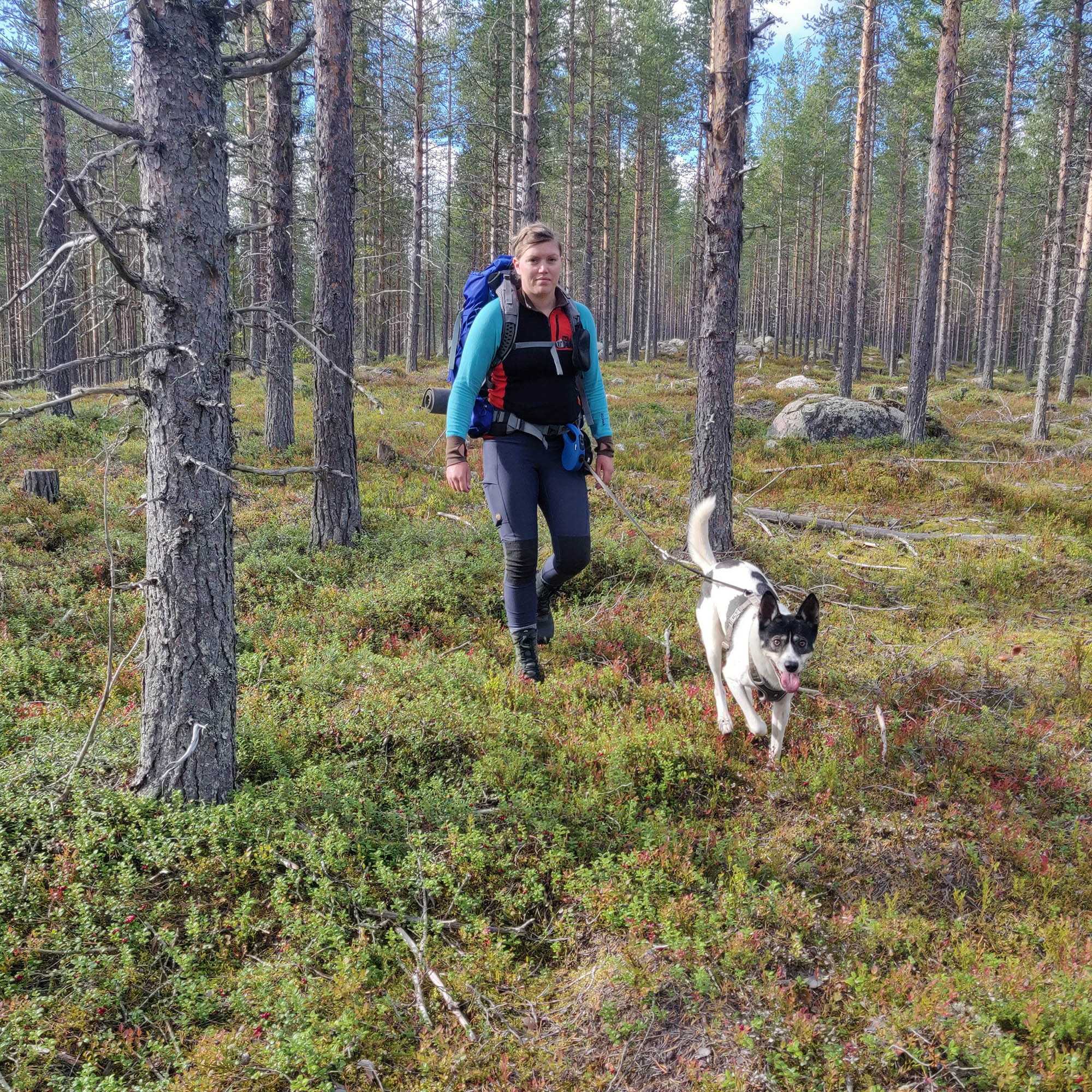 Sträckan mellan kraftledningen och Kainotjärn är fin och lätt att gå på, vi följer spåret fram till tjärnen och även här tar Niják ett dopp. Vi stannar inte kvar här utan vänder på klacken och siktar in oss på Kainoberget istället. Vi går upp längs den nordvästra sidan av berget, det går stadigt uppför. Pulsen stiger och andhämtningen ökar, jag har det bra med draghjälp från Niják. Men snart är vi uppe på toppen, skogen växer runt hela berget men är glesare på sina ställen. Det går att få fina glimtar av Stora Luleälven och söderut ser man ut över myrar och Padjerimsberget. På den södra sidan av berget finns det flera klippor och branter, man får ha koll på var man sätter fötterna om man går åt det hållet. Vi har siktet inställt i sydostlig riktning istället och när vi passerat toppen får vi syn på ett vindskydd med eldstad och bänkar. Riktigt fint läge med utsikt mot Lilla Luleälven.