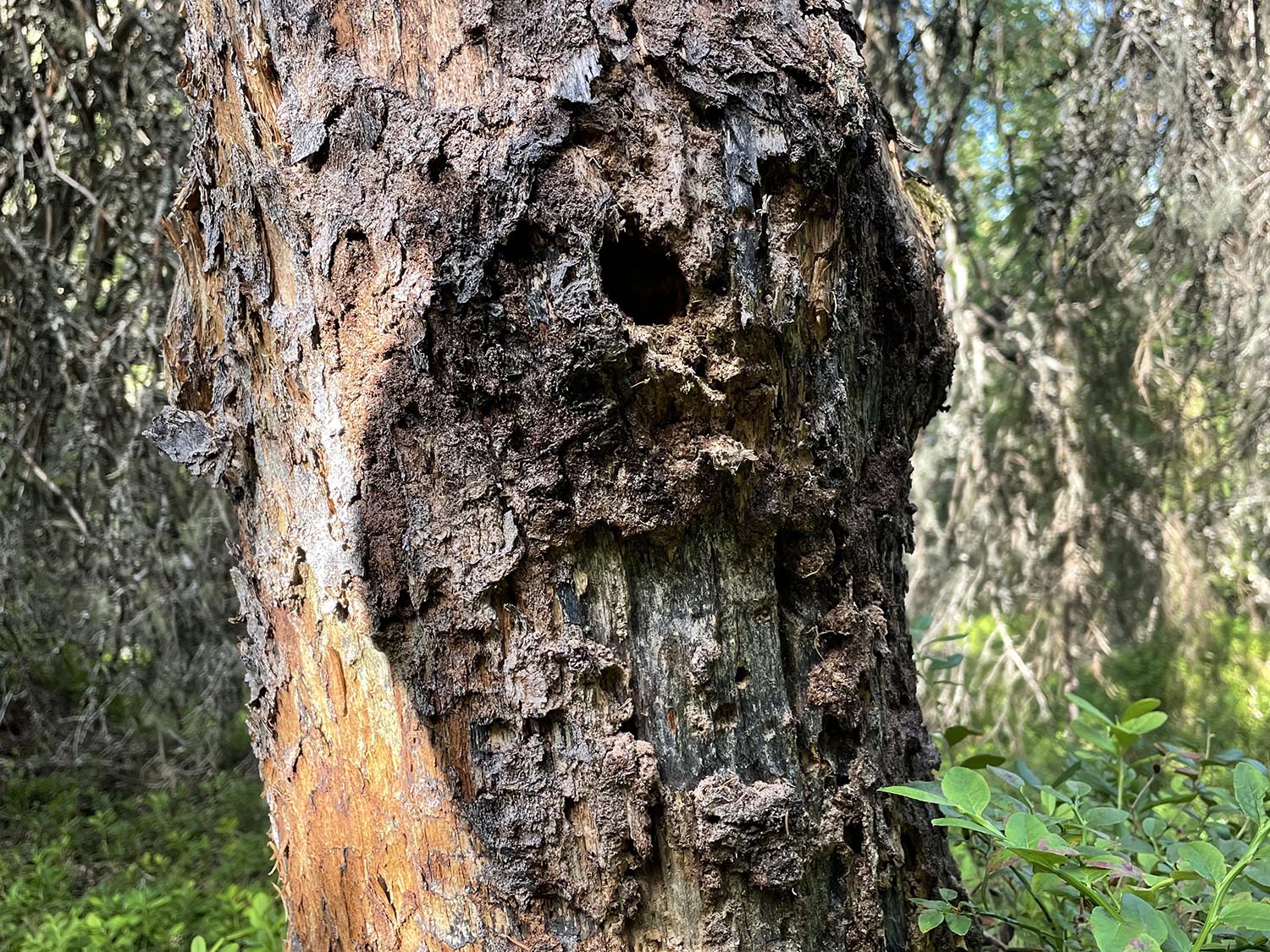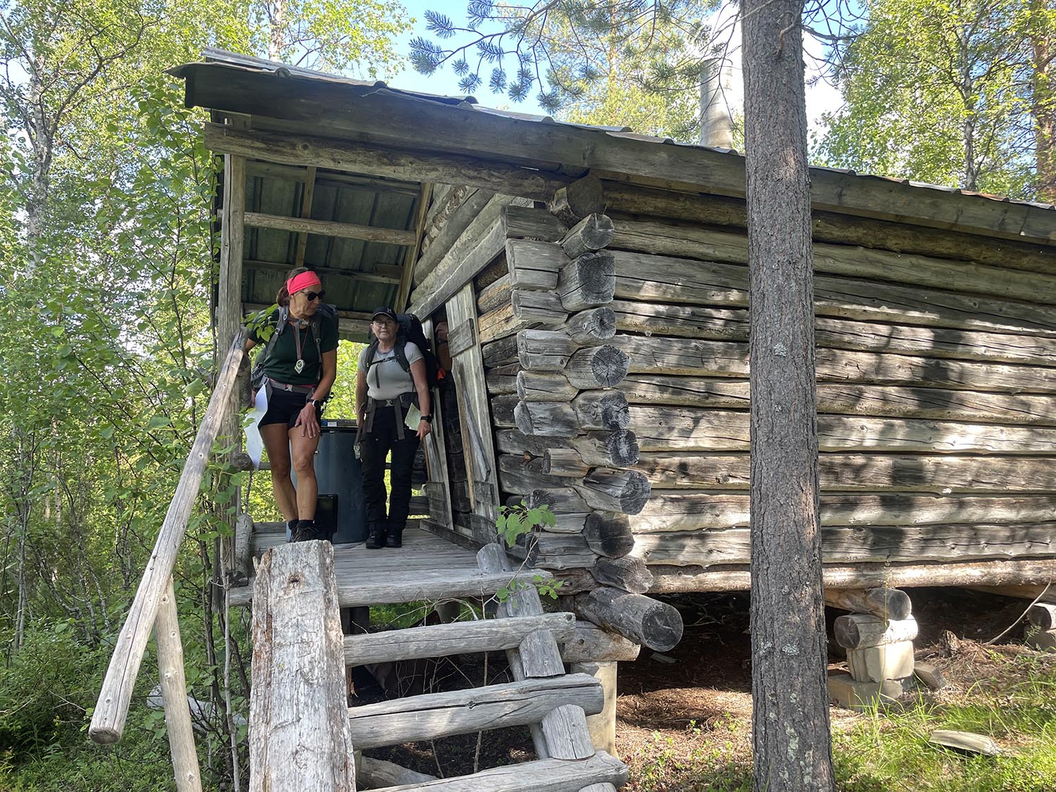 Vi fortsatte färden och fick syn på en död gran som vi gissar är minst 400 år gammal – ännu ett riktigt vackert konstverk skapat av naturen. På myren nedanför Rautiolehto såg vi massor av hjortron så vi kan tipsa alla hjortronälskare att ta sig hit! Vi gick på Rautiolehtovägen till Rovakka där cyklarna stod och väntade på oss men innan cykelturen tog vi ett välbehövligt dopp. Sedan påbörjade vi cykelturen till Aapua, bara för att efter ca 3,5 km inse att vi glömt bilnyckeln. Det var bara att vända tillbaka, hämta nyckeln och cykla mot bilen igen. När vårt äventyr var över hade vi gått 25 km och cyklat 23 km!