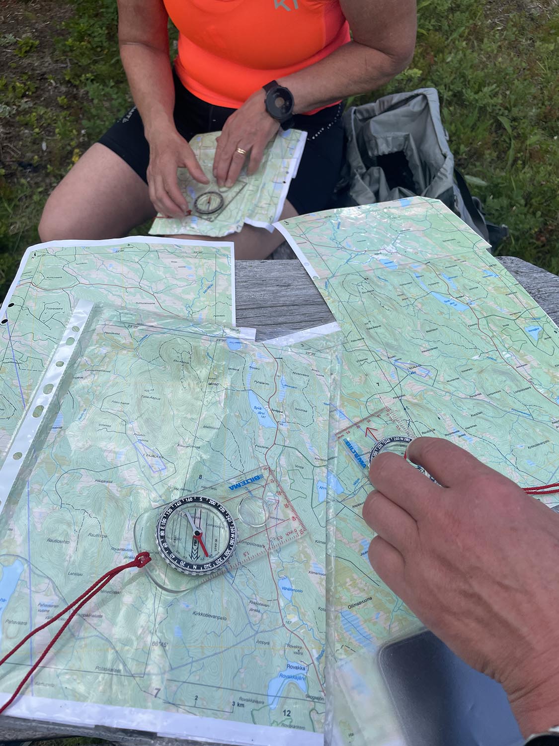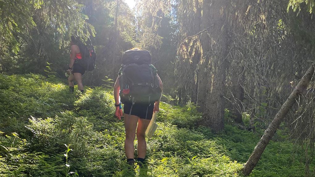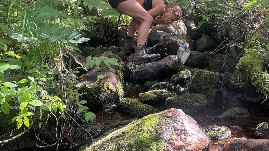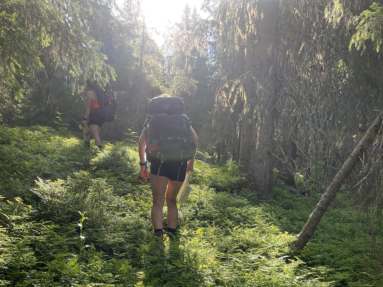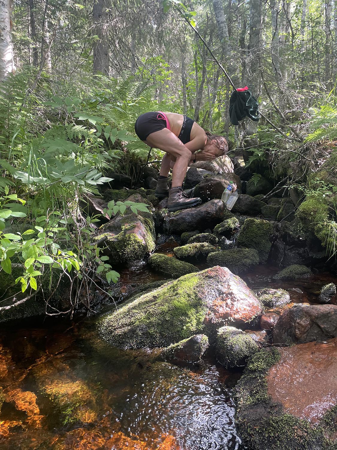 Efter en kortare paus tog vi ut kompassriktningen och började gå mot vindkraftparken på Etu-Aapua, som är bland Sveriges effektivaste vindkraftverk. Vi fyllde på med mat och vätska vid ett av vindkraftverken och gick sedan i riktning mot Taka-Aapua, som är Övertorneå kommuns högsta berg. Vi gnetade på i en härlig trolsk skog ett par kilometer innan vi stannade upp vid en väl gömd bäck för att fylla på med vatten, som gick åt snabbt i hettan, och svalka oss i bäckvattnet.