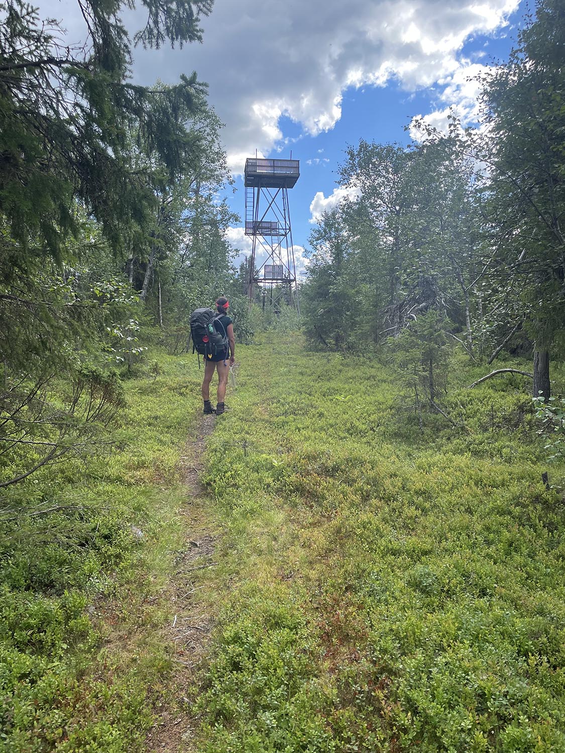 Sedan påbörjade vi klättringen upp till Taka-Aapua och det brandtorn som ligger där. Där gjorde vi upp en eld och grillade Hiillosmakkara (finsk grillkorv). Ingen av oss hade modet att klättra upp i brandtornet men den modige kan säkerligen njuta av en fantastisk utsikt därifrån! Efter en längre och välbehövlig paus vid brandtornet fortsatte vi färden nedför. Här gällde det att ha koll på fötterna då det var brant och stenigt.