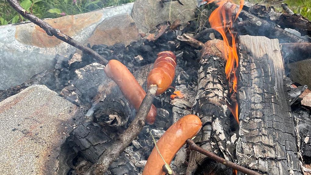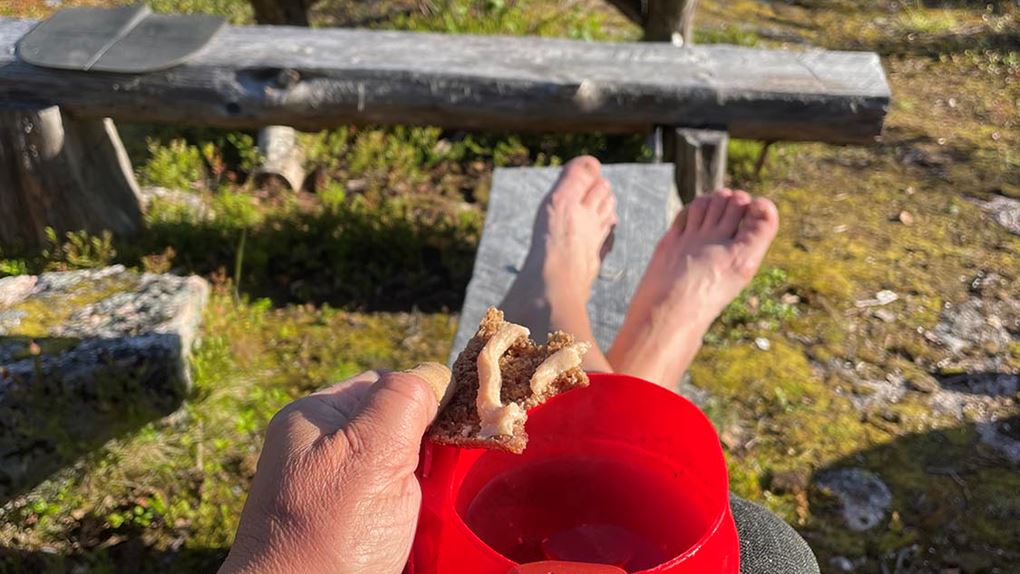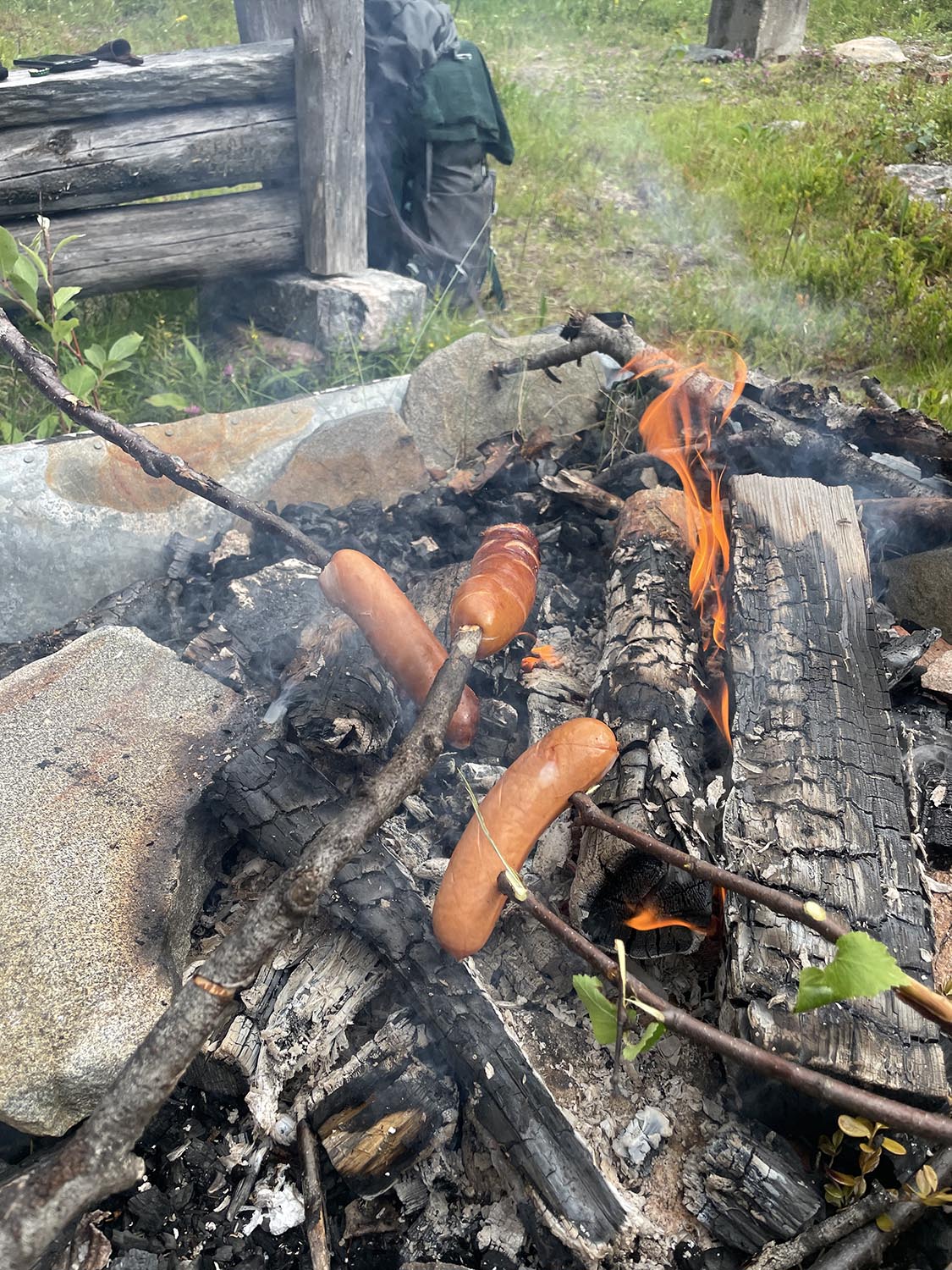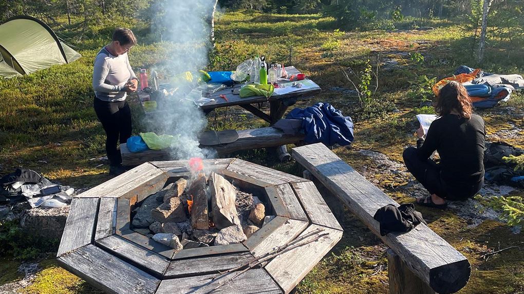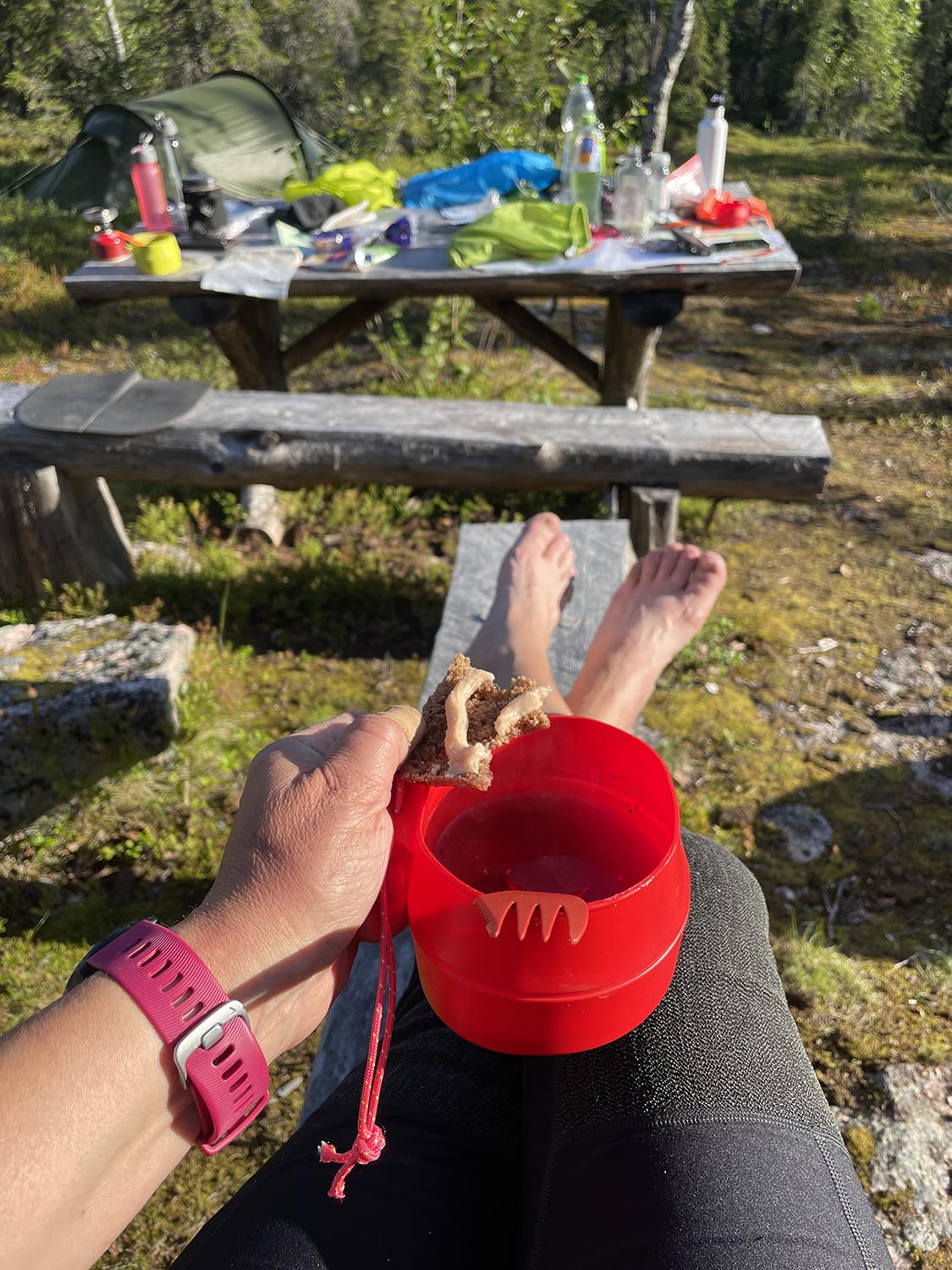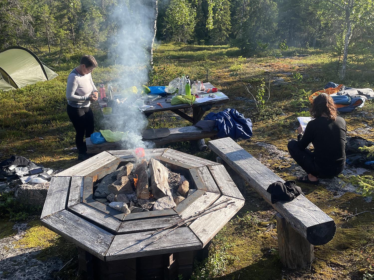 Vid ekoparksbänken var alla mygg och bromsar spårlöst borta. Kanske orkade de inte flyga ända dit upp. Vi gjorde upp eld och åt en god middag – maten smakar aldrig så gott som utomhus! Efter att vi slagit upp tältet tog det inte lång stund förrän första snarkningen hördes. Vi sov som stockar hela natten.