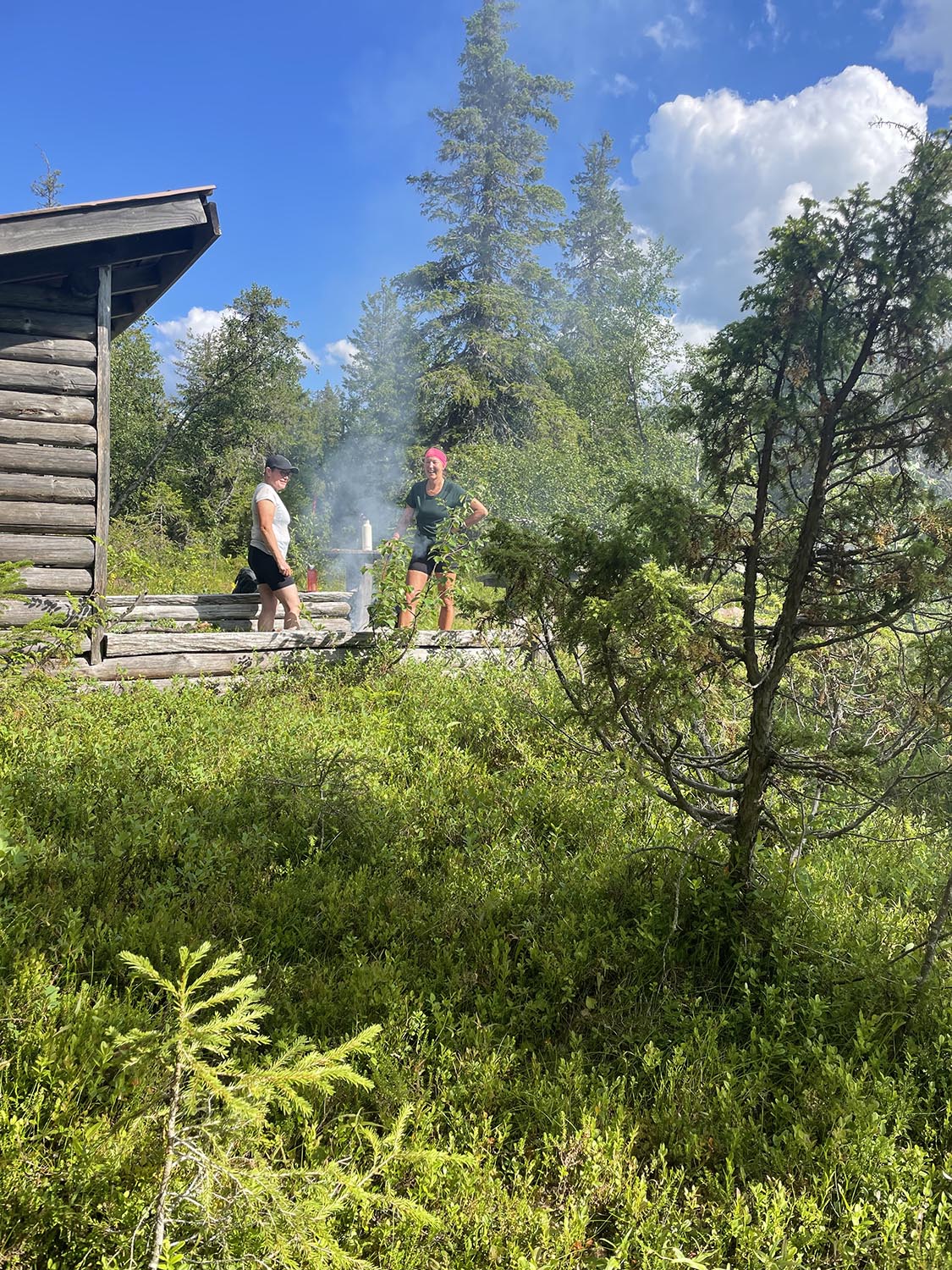 Väl nere på lägre höjd passerade vi myren Pruukinvuoma där det fanns gott om hjortron men som behövde någon dag till för att mogna. Vi önskar vi hade kunnat förmedla doften från myren, som var underbar! Vid det här laget började vi få ont om vatten så vi fick börja leta efter drickbart vatten. Vi hittade ett snårigt och ganska risigt dike som vi dök ned i. Vattnet såg inte gott ut men enligt mottot ”man tager vad man haver” bestämde vi oss för att ta med vatten därifrån för att ha något att dricka om vi inte skulle hitta något bättre.