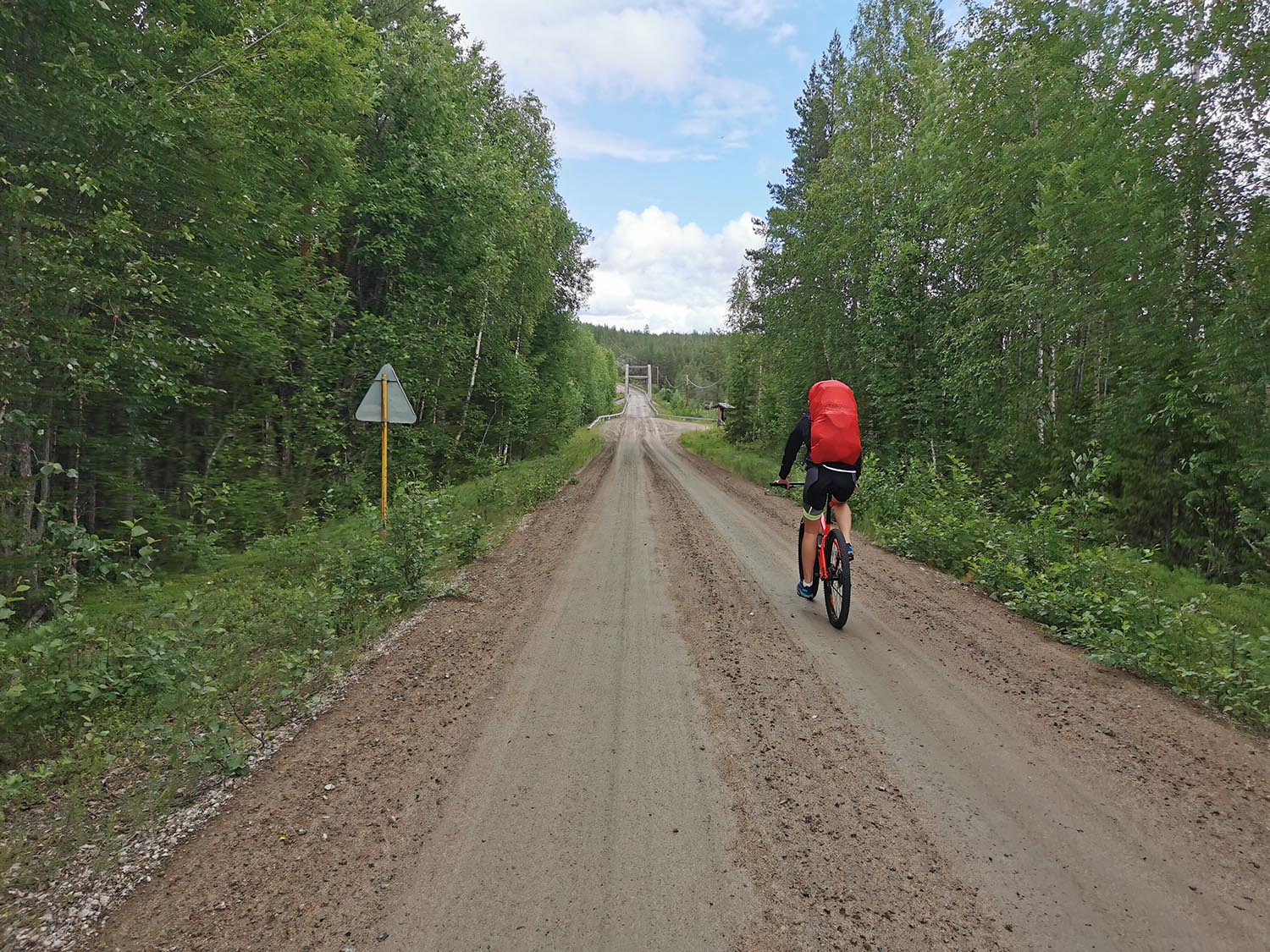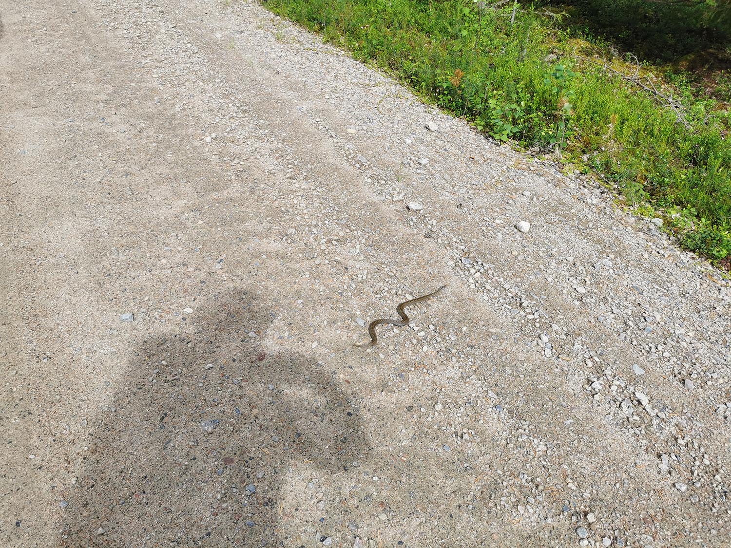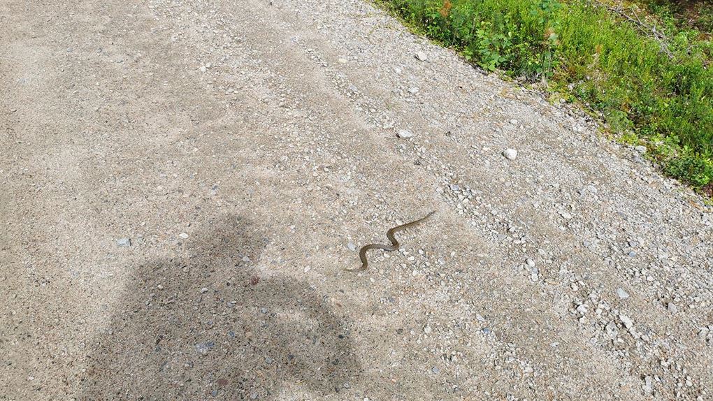 Upp på cyklarna och börja trampa på. Efter några hundra meter fick vi stanna och justera lite i packningen och på cyklarna men sedan var vi igång. Vi satte även på regnskydd på ryggsäckarna för vi kände små droppar och det var ju lika bra att vara förberedda. Snabbt såg vi en huggorm på vägen som vi var tvungna fota, för tänk om vi inte skulle se nåt fler djur?!