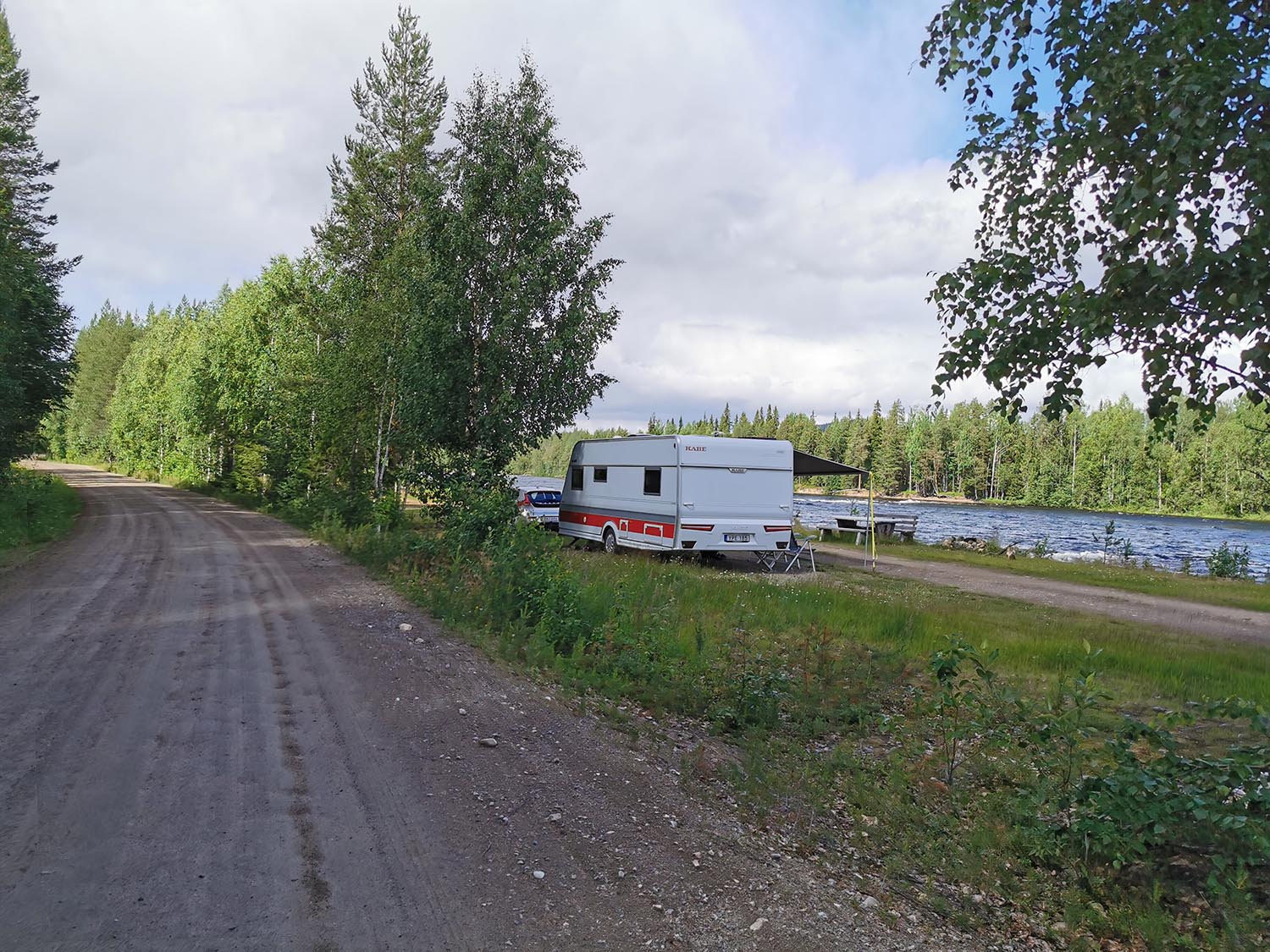 Vi cyklade på i lugn takt förbi Benbryteforsens fricamping där många husvagnar stod uppställda och förbi till Benbryteforsen som var vårt första mål. Mäktig fors där vi tog någon bild. Väldigt mycket vatten i Piteälven nu. Är det fortfarande smältvatten från fjällen eller har det regnat mycket? var något vi funderade på. Vi cyklade vidare en liten bit och tänkte att "det här kan ju inte ta så lång tid", när vi hunnit en fjärdedel av cykelfärden på mindre än en timme.